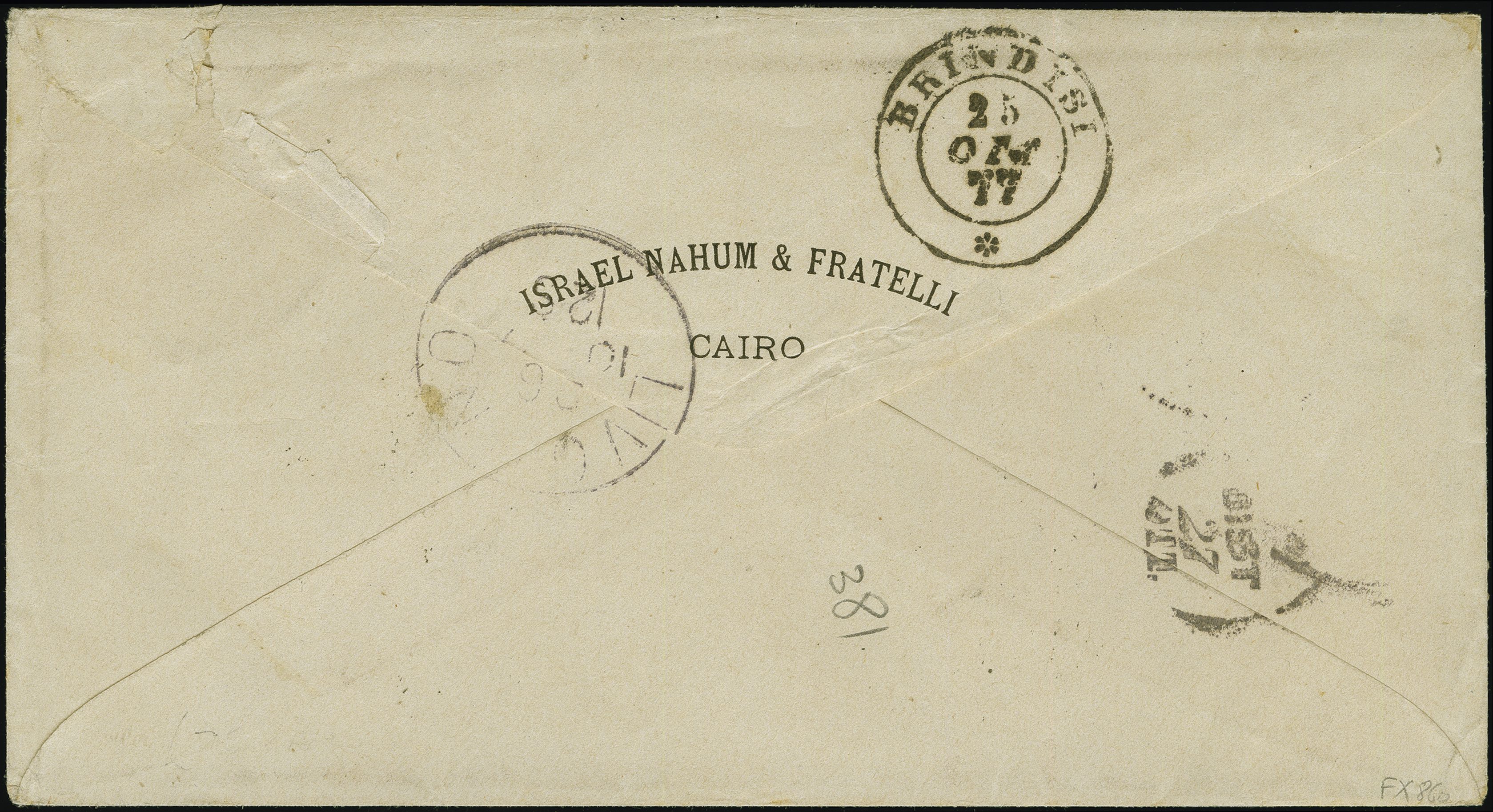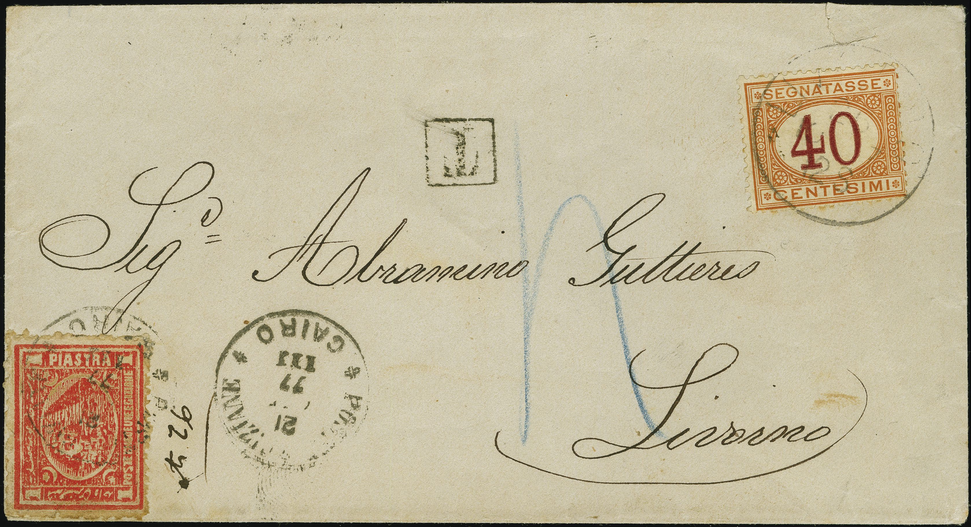 90282 cover image1872: Bulaq printing 1 piaster brick red, tied by cds “POSTE EGIZIANE CAIRO 21 OTT 77 III” repeated alongside to envelope to Livorno, on reverse transit “BRINDISI 25 OTT 77”, upon arrival Italian postage due 40 centisemi orange/carmine applied with adjacent framed “T” and tied by cds “LIVORNO 26 10 77” repeated on reverse, the envelope with a small tear at top, still fine, a scarce usage (Image 1) (Image 2)