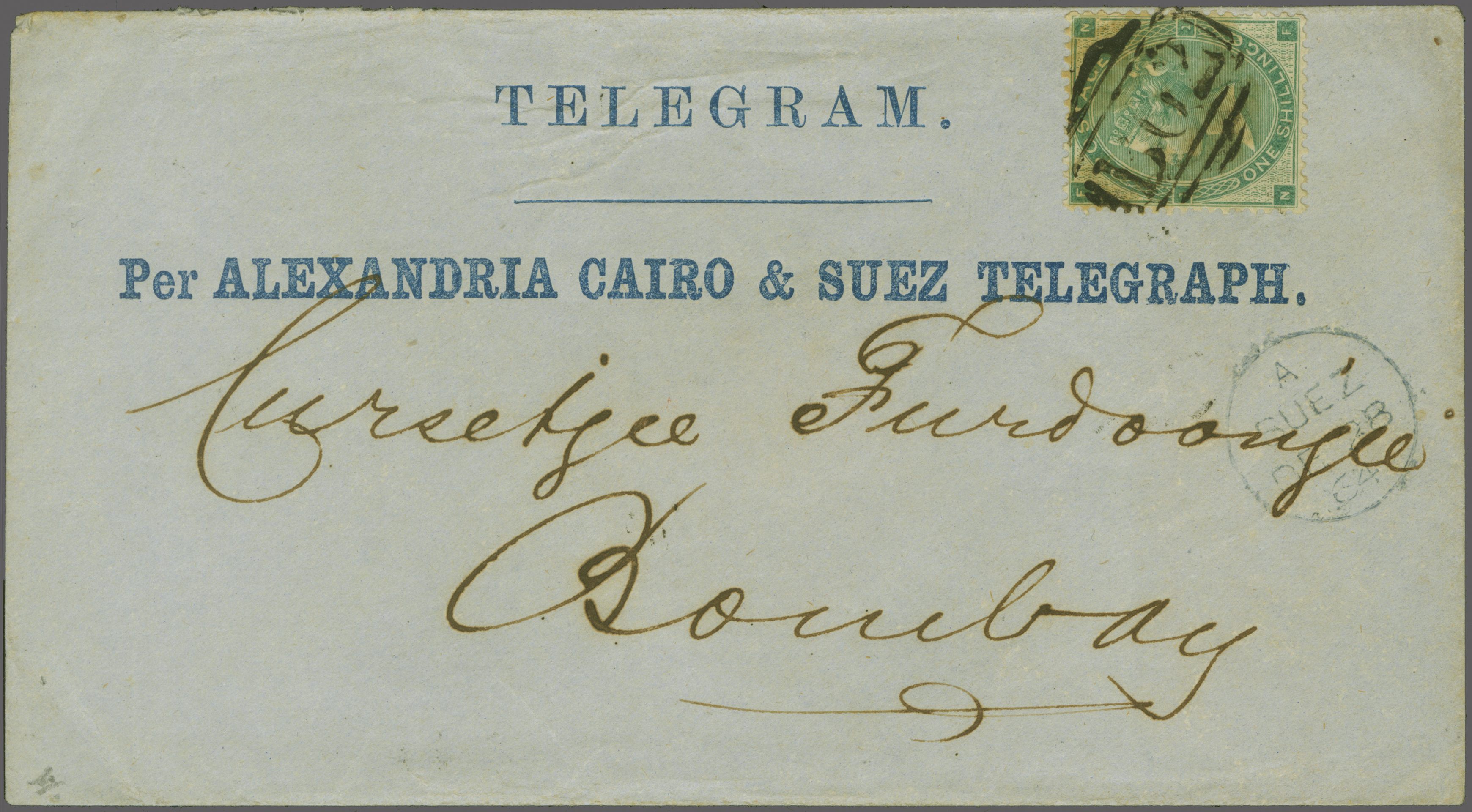 5141 cover image1862/64: Great Britain 1 s. green, pl. 1 = pl. 2, lettered NF (Gi. 90) used on printed "TELEGRAM / per Alexandria, Cairo & Suez Telegraph" envelope to Bombay, tied by "BO2" obliterator of Suez in black with SUEZ cds below (Dec 28) in blue. The cover with full original Telegraphic contents "Forty three Bank rate seven Cotton quiet Prices farthing lower fair cholera unchanged". Slight opening tear on flap but scarce and fine (Image 1) (Image 2)