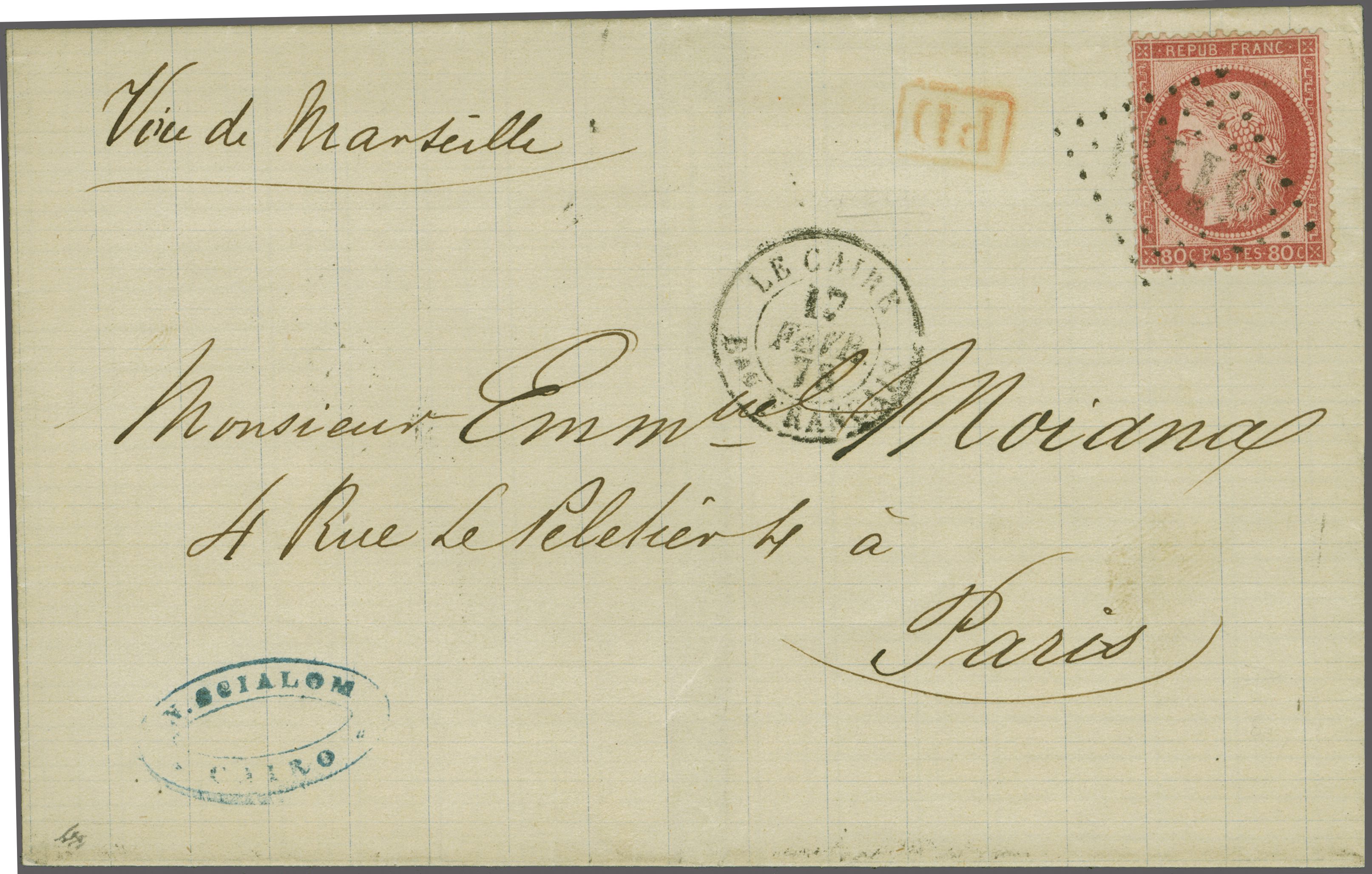 5147 cover imageFrench PO's 1871/75: Cérès 80 c. carmine, a fine used example on 1878 cover to Paris endorsed "Voie de Marseille" tied by scarce '5119' gros chiffres of Cairo with "LE CAIRE / BAU FRANCAIS" cds below (Feb 17) in black and red 'PD'. Reverse with Marseille (Feb 25) and Paris arrival. Scarce Yvert = € 600 (Image 1) (Image 2)