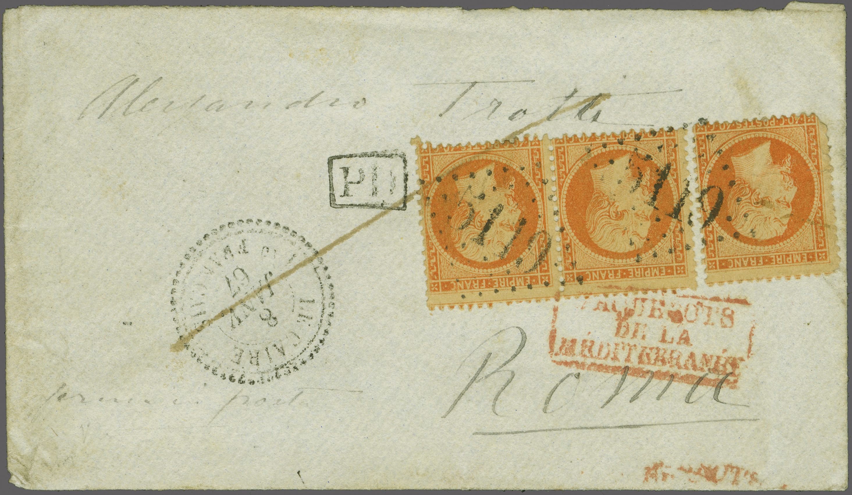 5146 cover imageFrench PO's 1862: France Empire 40 c. orange, a horizontal strip of three, one stamp rounded corner, used on 1867 cover from Cairo to Rome, Italy tied by gros chiffres "5119" and in manuscript to denote full payment, with pearled "LE CAIRE BAU FRANCAIS" cds at left (Jan 8), with black 'PD' and framed "Paquebots / De La / Mediterranée" in red. Marseille and Roma cds's (Jan 22) on reverse of a scarce cover Yvert = € 625 (Image 1) (Image 2)