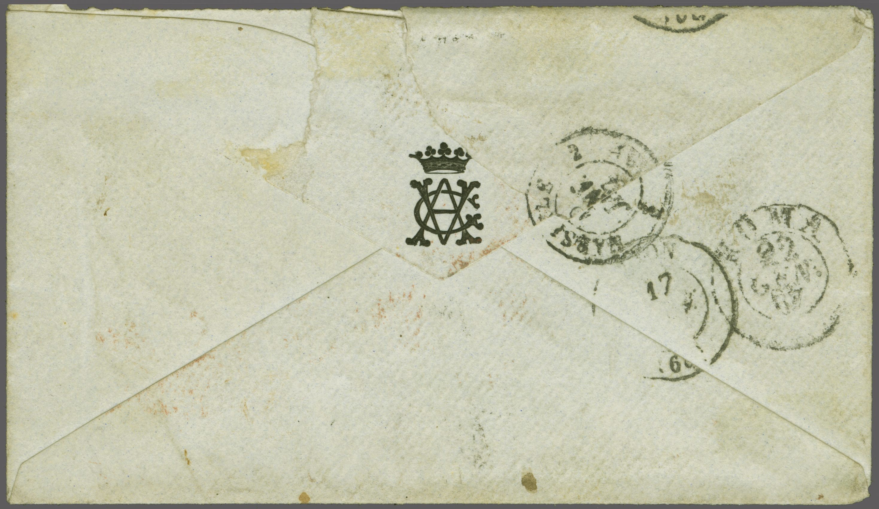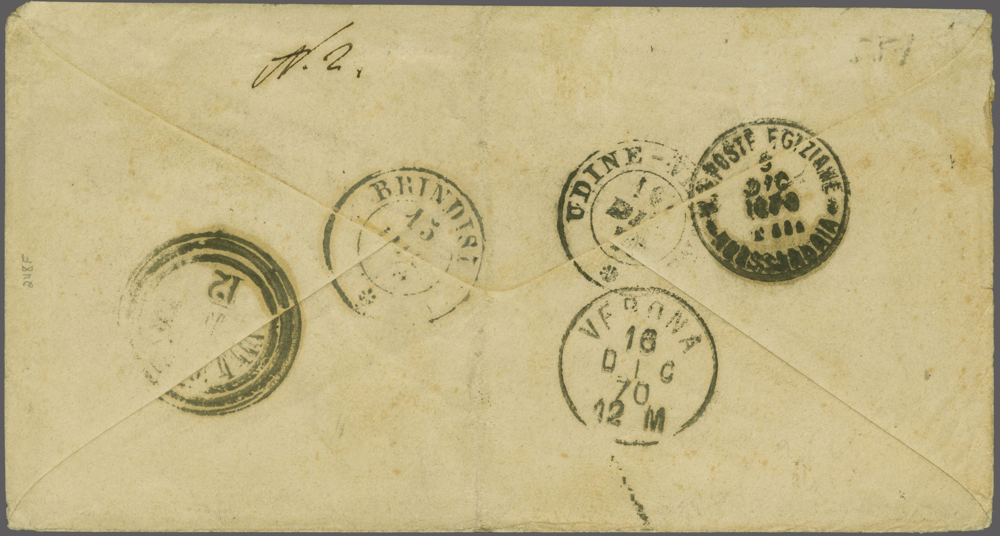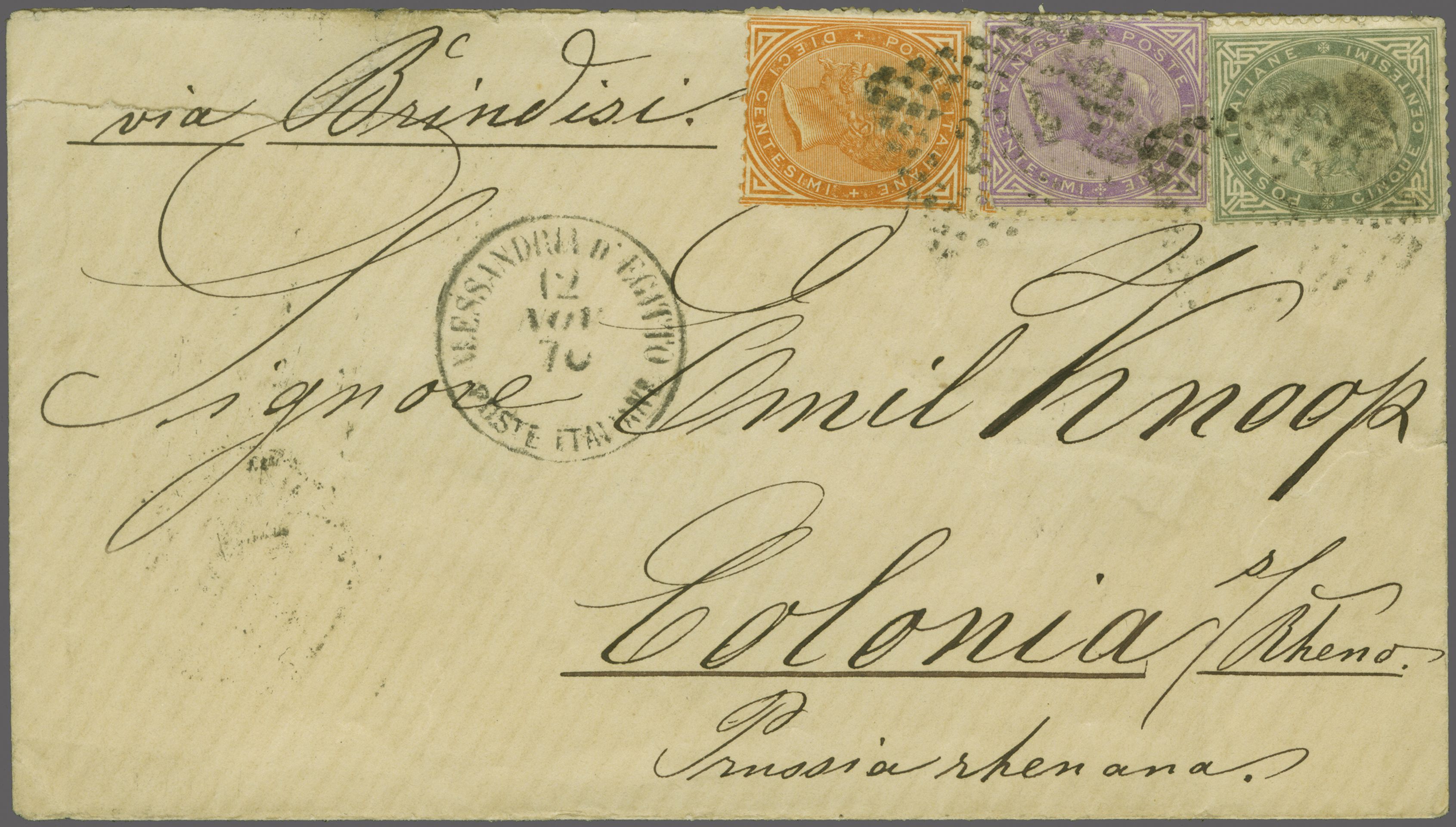 5151 cover imageItalian PO's 1863: 5 c. grey, 10 c. orange, blunted perfs. and 60 c. lilac, all used on 1870 cover to Cologne endorsed "via Brindisi" tied by dotted '234' lozenge in black with "Alessandria D'Egitto / Poste Italiane" cds at left (Nov 12) in black. Reverse with Verona cds (Nov 16) and Coeln arrival (Nov 19) in black. Minor imperfections but an attractive three colour franking (Image 1) (Image 2)