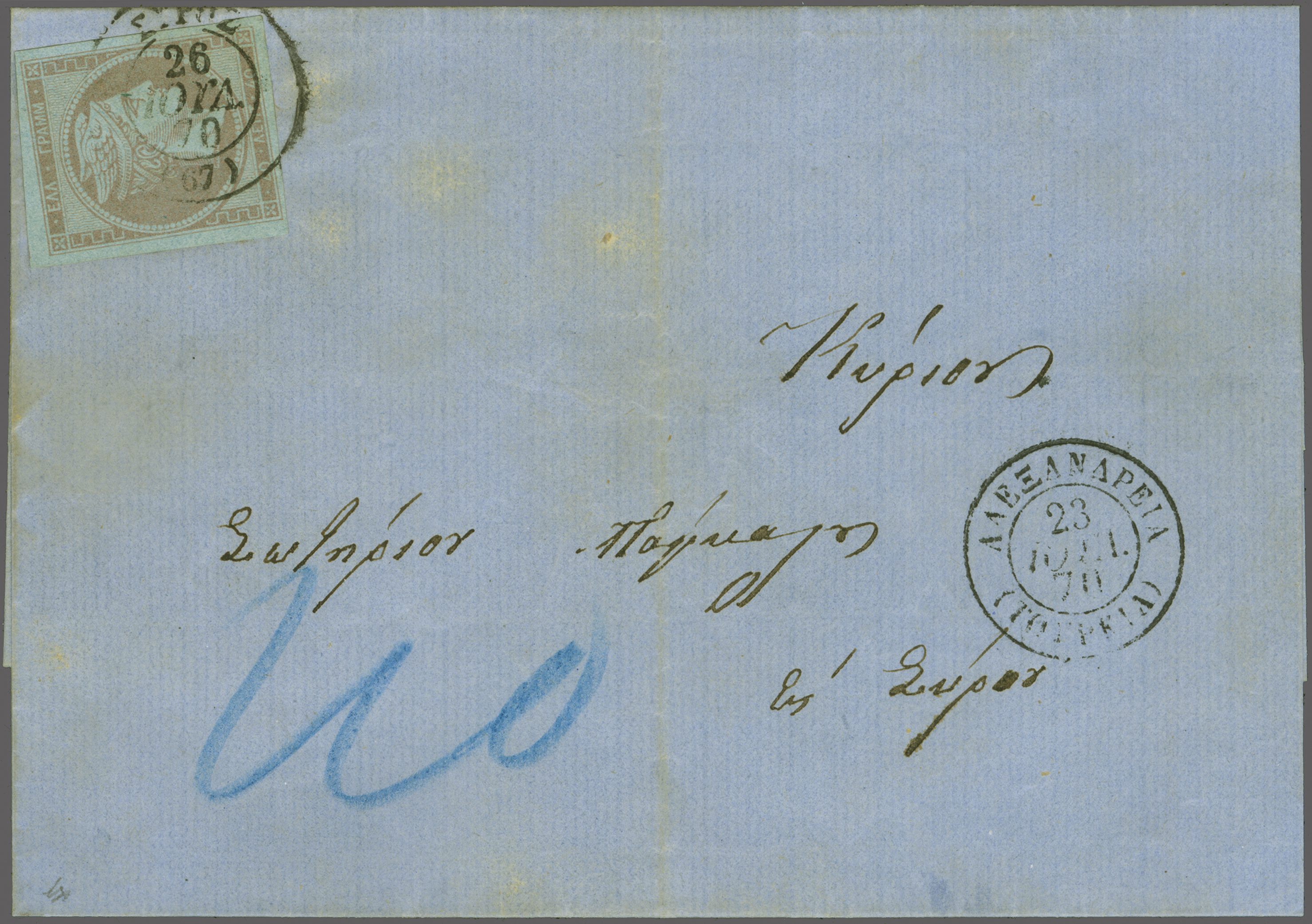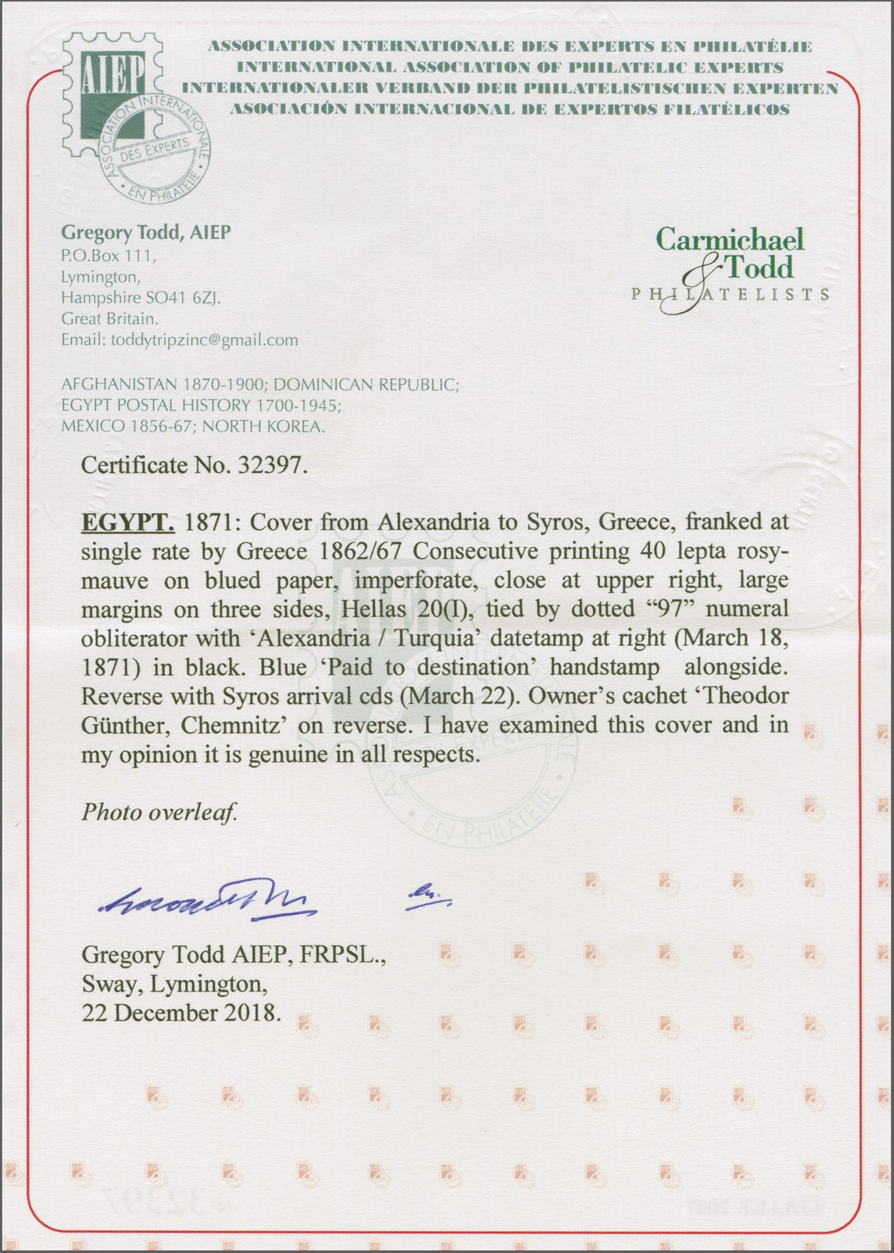 5148 cover imageGreek PO's 1862/67: Greece 40 lepta rosy mauve on blued paper, Consecutive printing with three good margins and just shaved at right, used on 1871 cover from Alexandria to Syros tied by superb dotted "97" numeral obliterator with "ALEXANDRIA / (TURQUIE)" cds of the Greek P.O. at right (March 18) in black. Handstruck 'P.D.' in blue at right and reverse with Syros arrival cds (March 22). Fresh and most attractive cover. Cert. Todd AIEP (2018) (Image 1) (Image 2) (Image 3)
