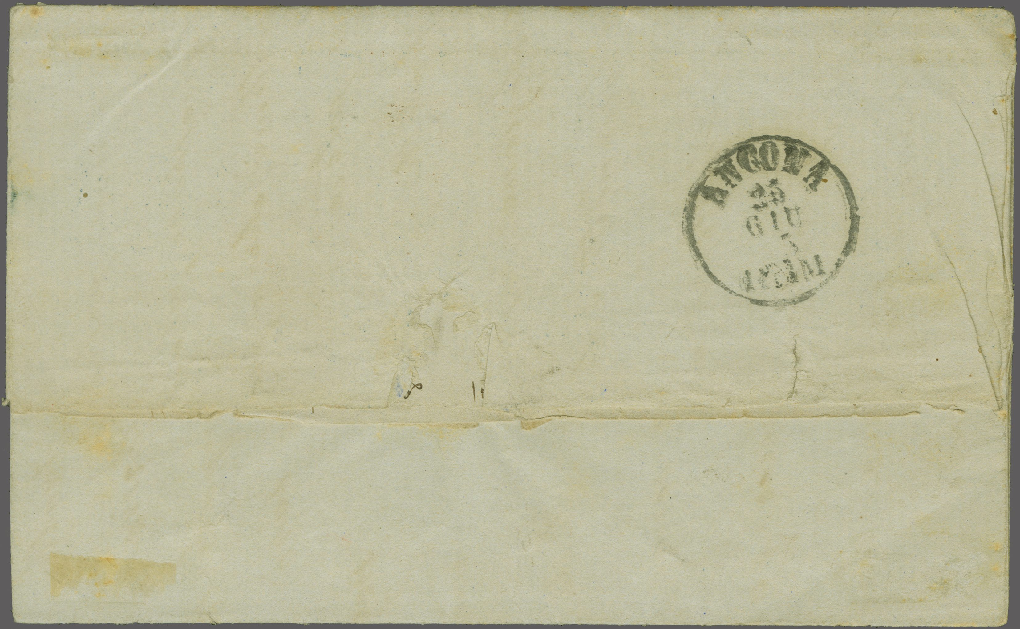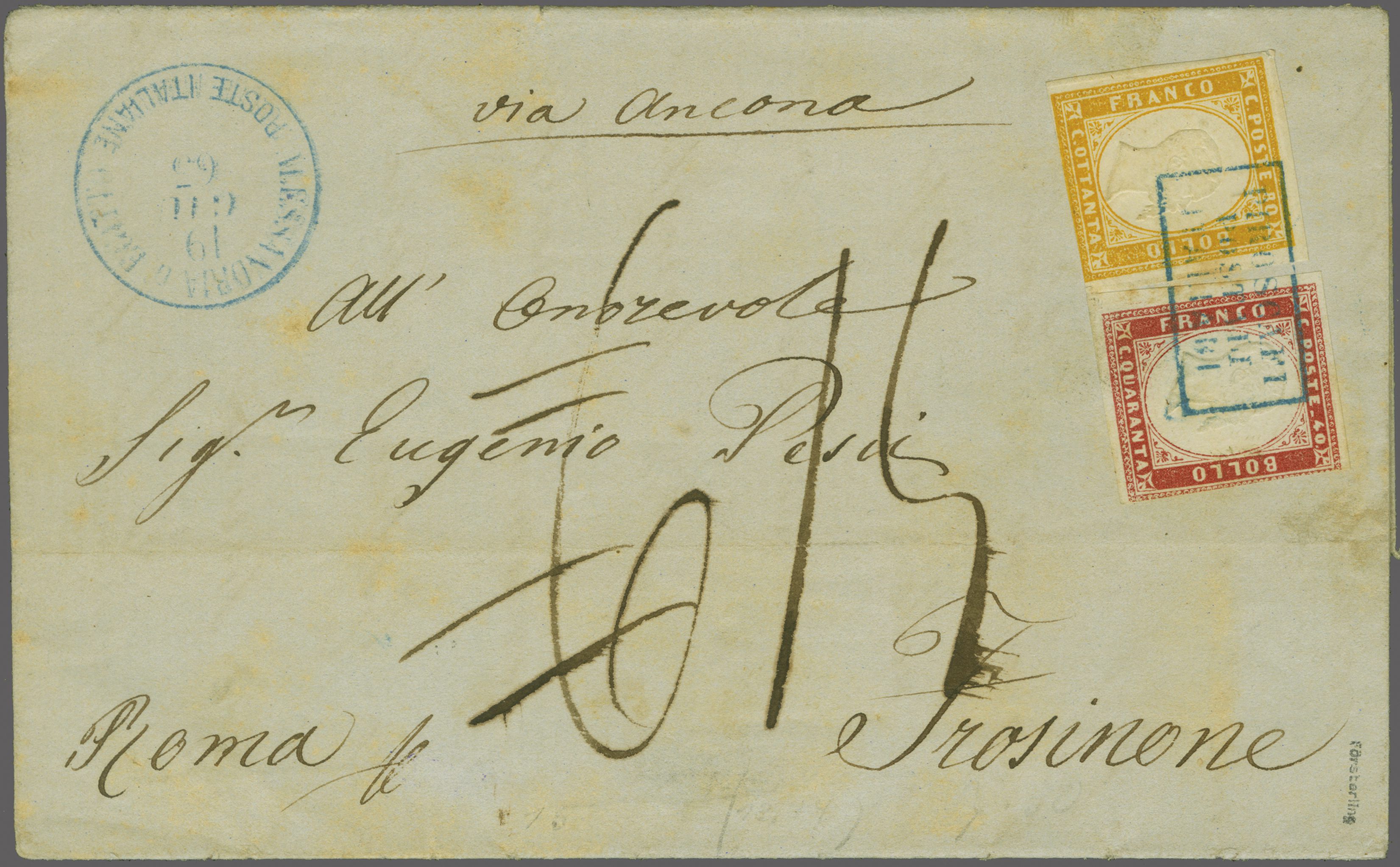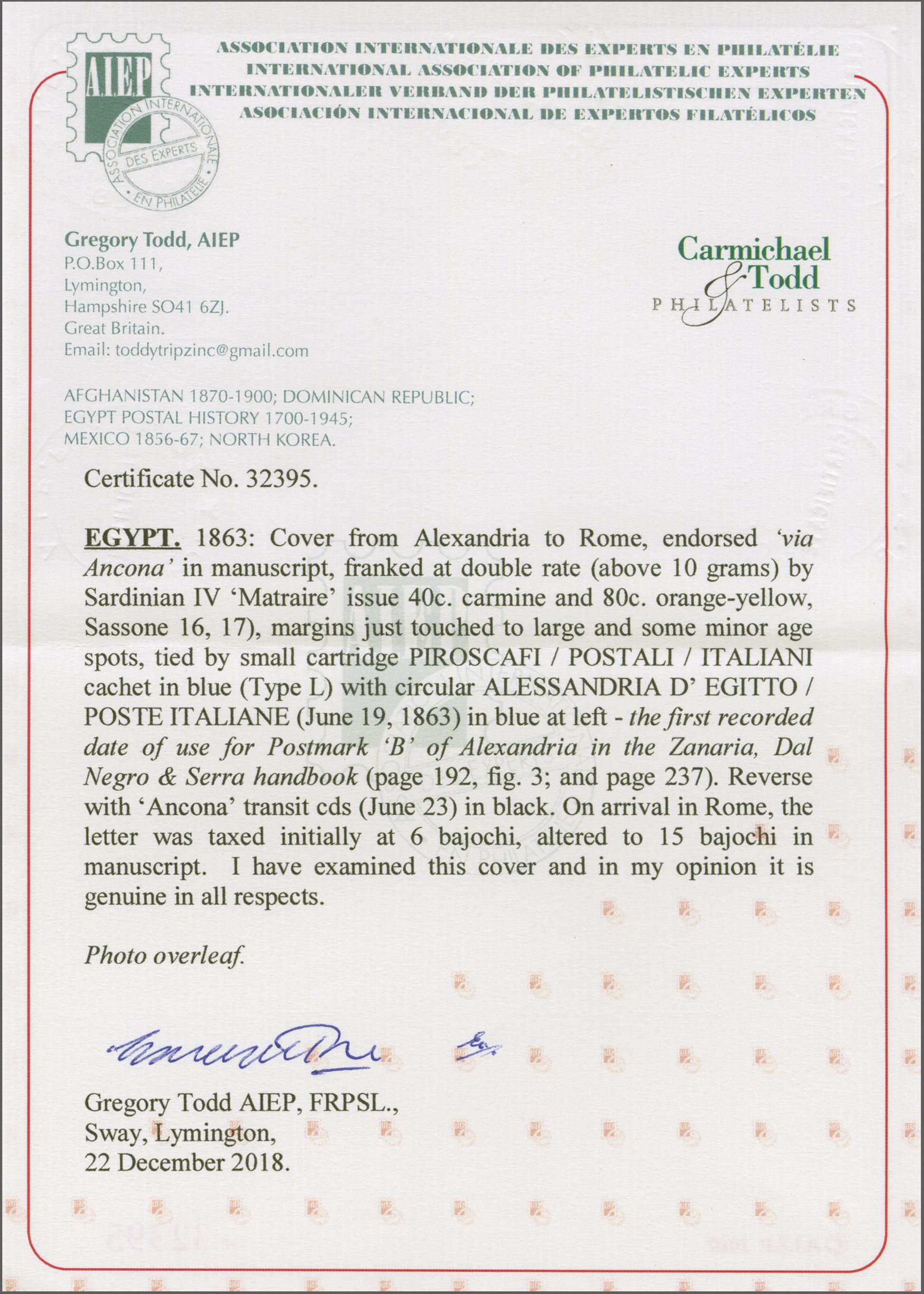 5150 cover imageItalian PO's 1863: Sardinia 40 c. carmine and 80 c. orange-yellow (Sassone 16+17), margins generally fine to just shaved, prepaying the single rate, used on 1863 double rate cover (second sheet of entire letter) from Alexandria to Frosinone, Roma endorsed "via Ancona" tied by framed small cartridge "PIROSCAFI / POSTALI / ITALIANI" in blue with "ALESSANDRIA D'EGITTO / POSTE ITALIANE" circular datestamp at left (June 19) - this being the first recorded day of use of the Type B postmark. Reverse with Ancona cds of transit (June 25) in black. Underpaid and initially taxed "6" decimi and altered to "15" in manuscript on arrival. A fine and very rare cover (Image 1) (Image 2) (Image 3) (Image 4)