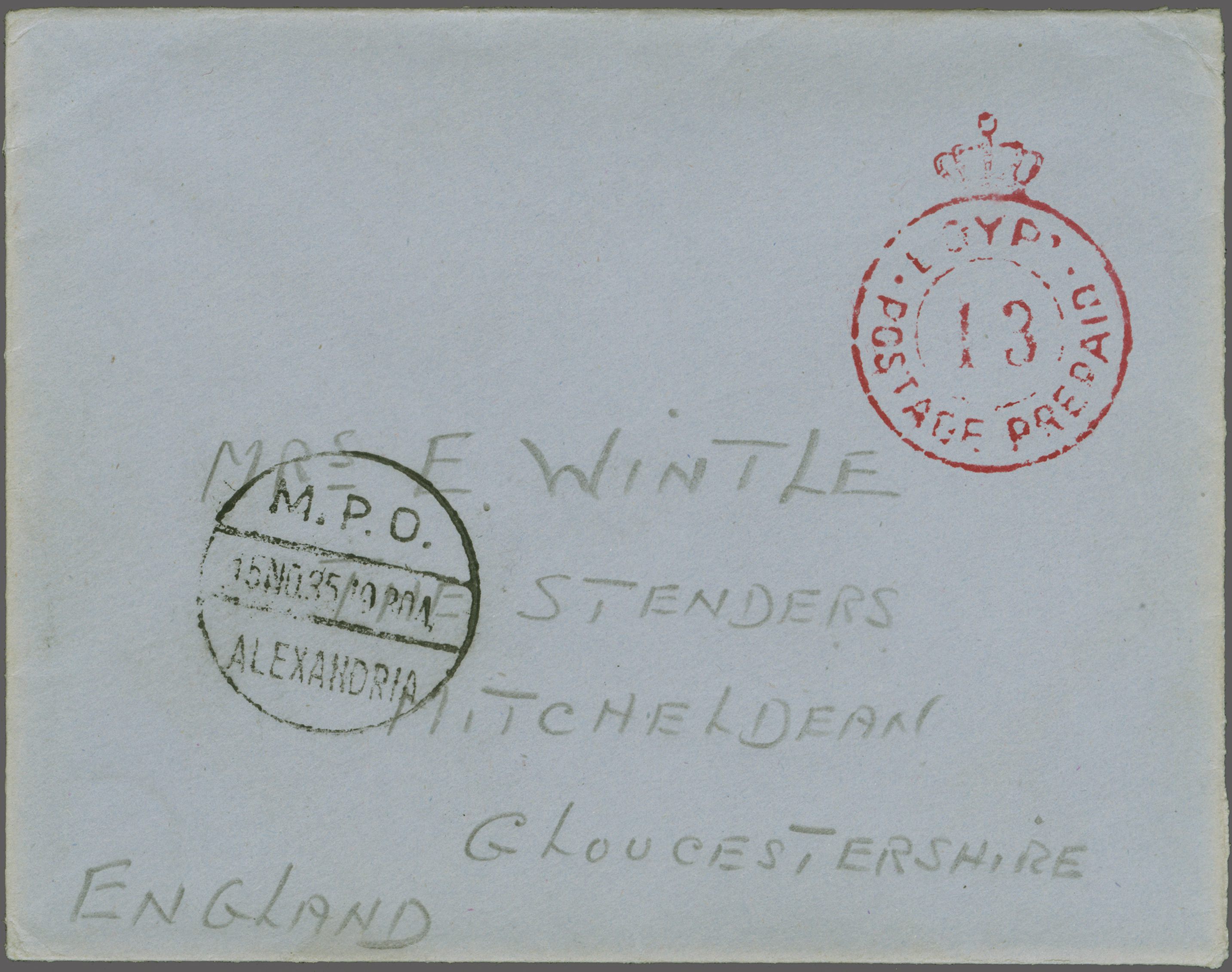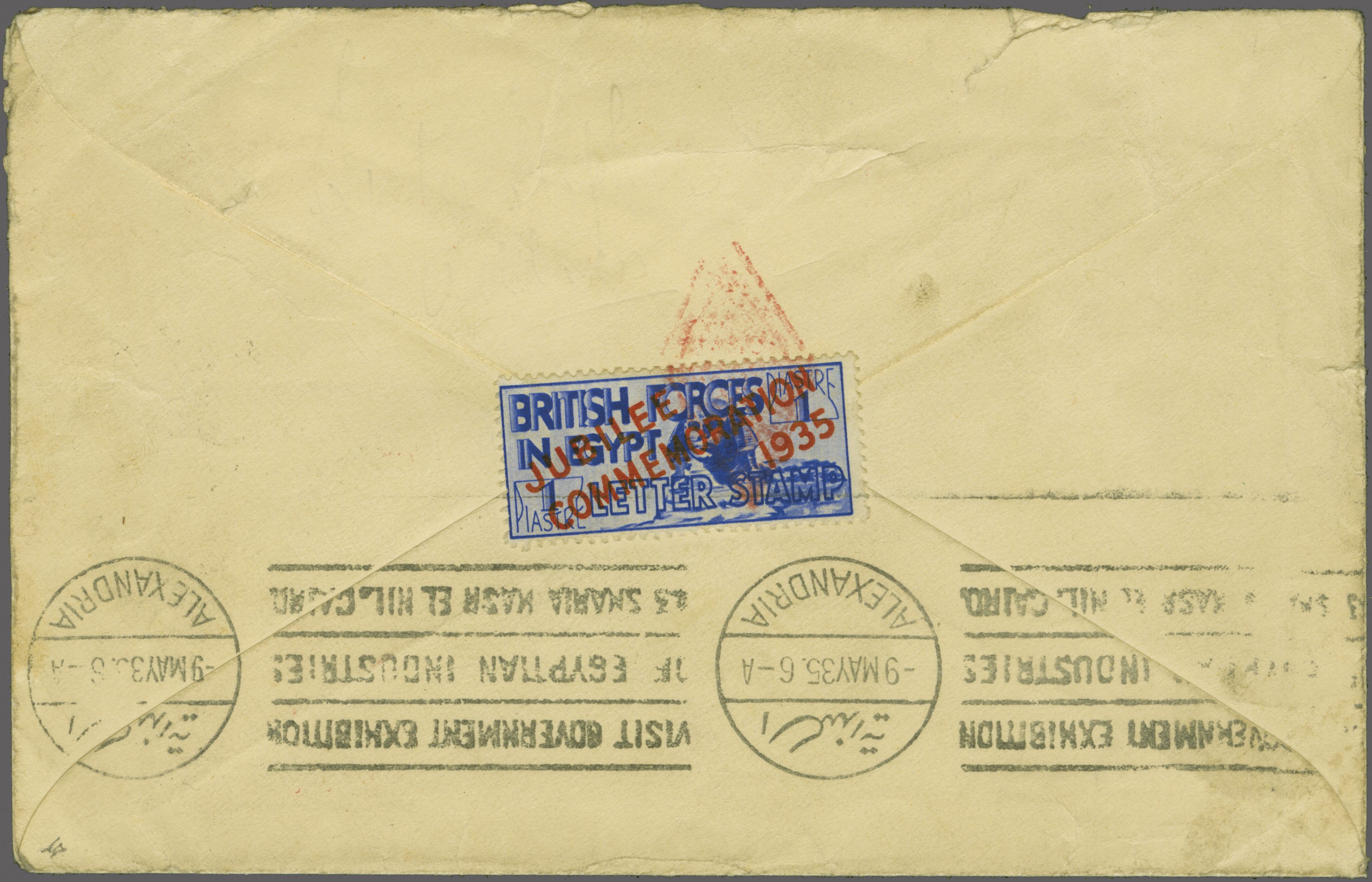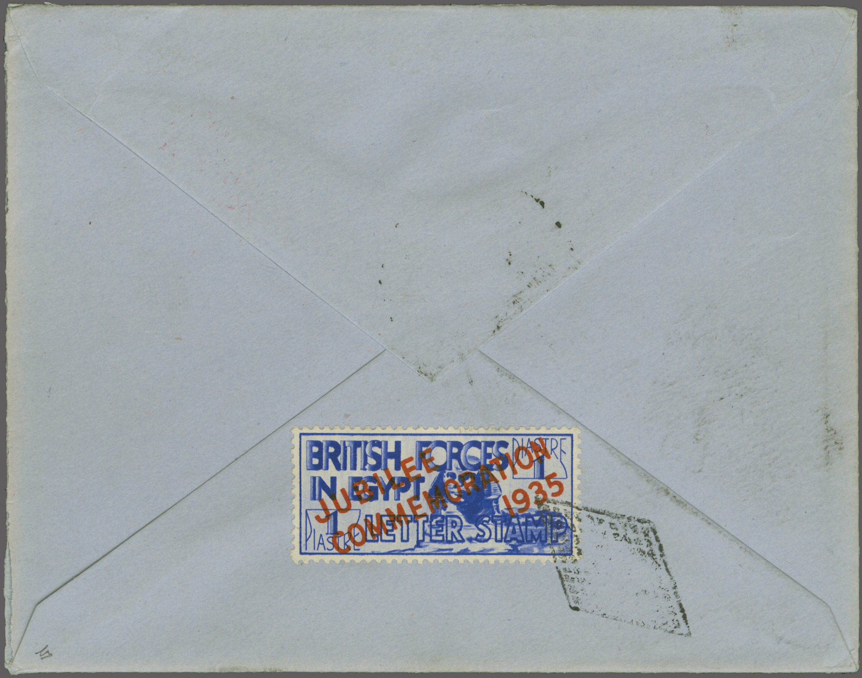 5142 cover imageBritish Forces 1935: Silver Jubilee 1 pi. ultramarine optd. in red, a single example used on reverse of 1935 cover to England tied by retta in black. Obverse with "♚ / EGYPT / 13 / POSTAGE PAID" in red and MPO / Alexandria cds in black (Nov 15). Scarce stamp on letter Gi = £ 300 (Image 1) (Image 2)