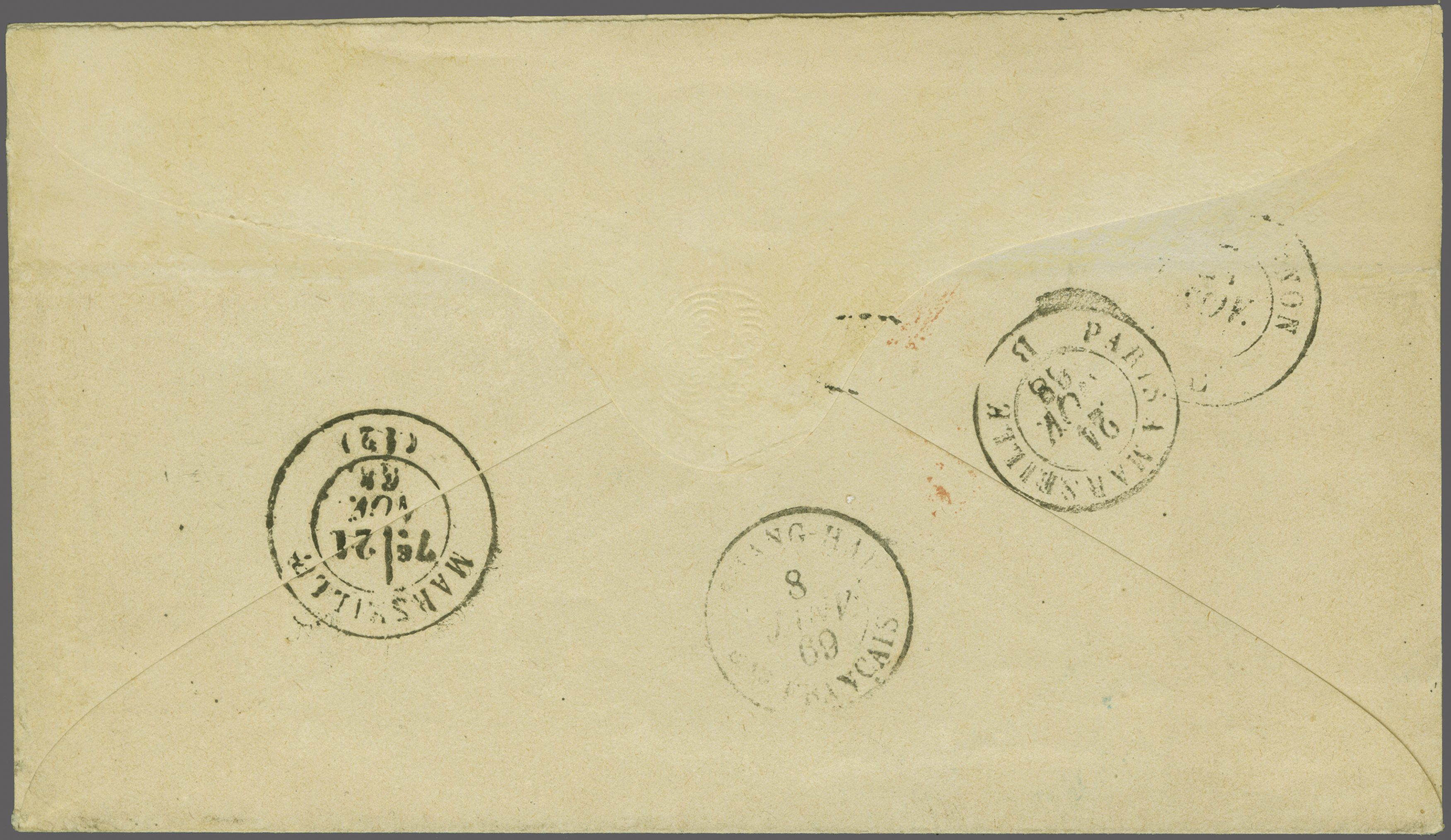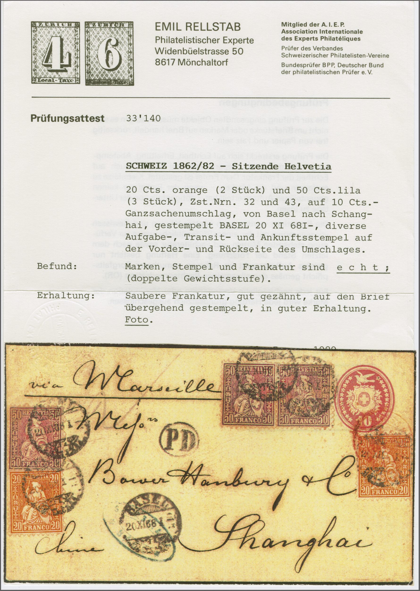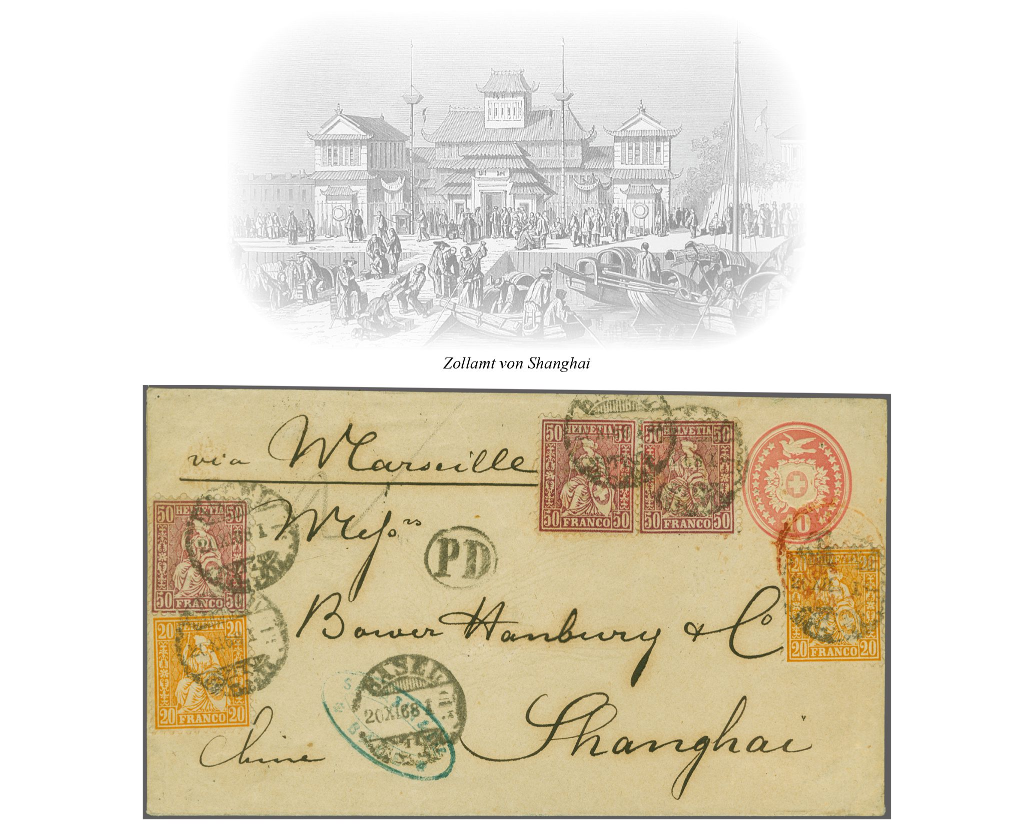 9086 cover imageChina 1868: 20 Rp. orange (2) und 50 Rp. lila (3), fünf farbfr. und gut gez. Einzelwerte als Zusatzfrankatur auf Tüblibrief 10 Rp. rot, je leicht und übergehend entw. "BASEL BR. EX. 20.XI.68.1-", nebenges. zus. mit "PD" im Oval nochmals wiederholt und mit handschrifltichem Leitvermerk "via Marseille" und Gewichtsstufennotiz "2" in Bleistift nach Shanghai, China adressiert. Vorders. undeutlicher franz. Eingangsstp. in rot, rücks. Transitstp. "PARIS A MARSEILLE 21 NOV. 88" und "MARSEILLE 21 NOV. 88", von dort mit französsichem Dampfer im Normalfall via Alexandria, Überland nach Suez, weiter nach Hong Kong und Shanghai mit rücks. Ankunftsstp. "SHANG-HAI / BUREAU FRANCAIS 8 JANV. 69" des dortigen französischen Postbüros. Mit Fr. 2.00 korrekt bis zum Bestimmungsort frankiert für einen Brief der 2. Gewichtsstufe (7½ bis 15g) unter französischer Leitung nach Hong Kong oder Shanghai laut Postvertrag vom 1. Oktober 1865. Ein seltener doppelgewichtiger Brief nach China; Attest Rellstab (1989). Provenienz: Sammlung "Erivan", 248. Corinphila-Auktion, Zürich Dezember 2019, Los 7039 (Image 1) (Image 2) (Image 3) (Image 4)