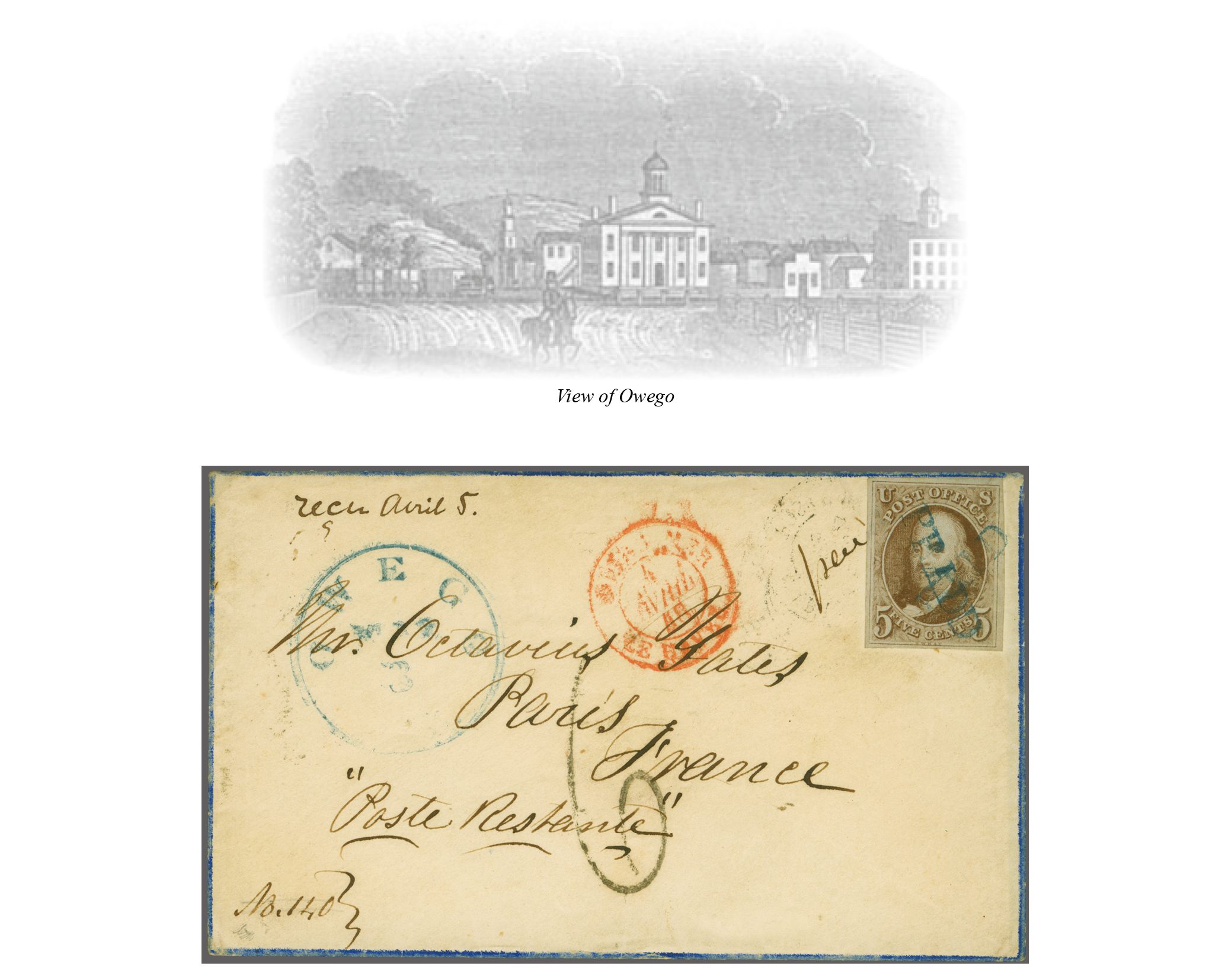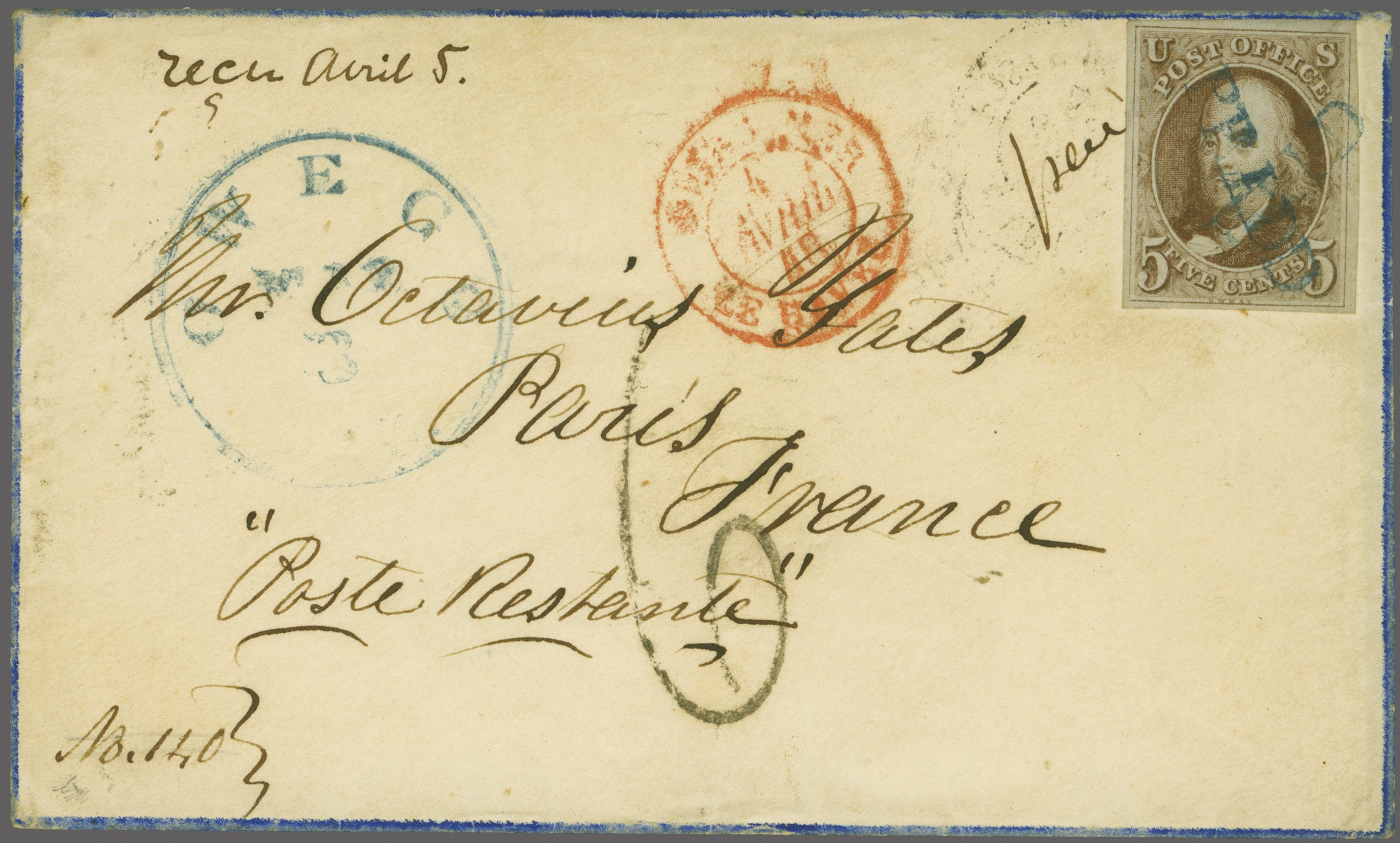 Transatlantic mail between France and the USA and vice versa - Shipmail from the United States to France on private ships; 1848 (March 3): Small blue-trimmed envelope from Owego, New York to Paris, bearing 1847 5 c. red-brown
