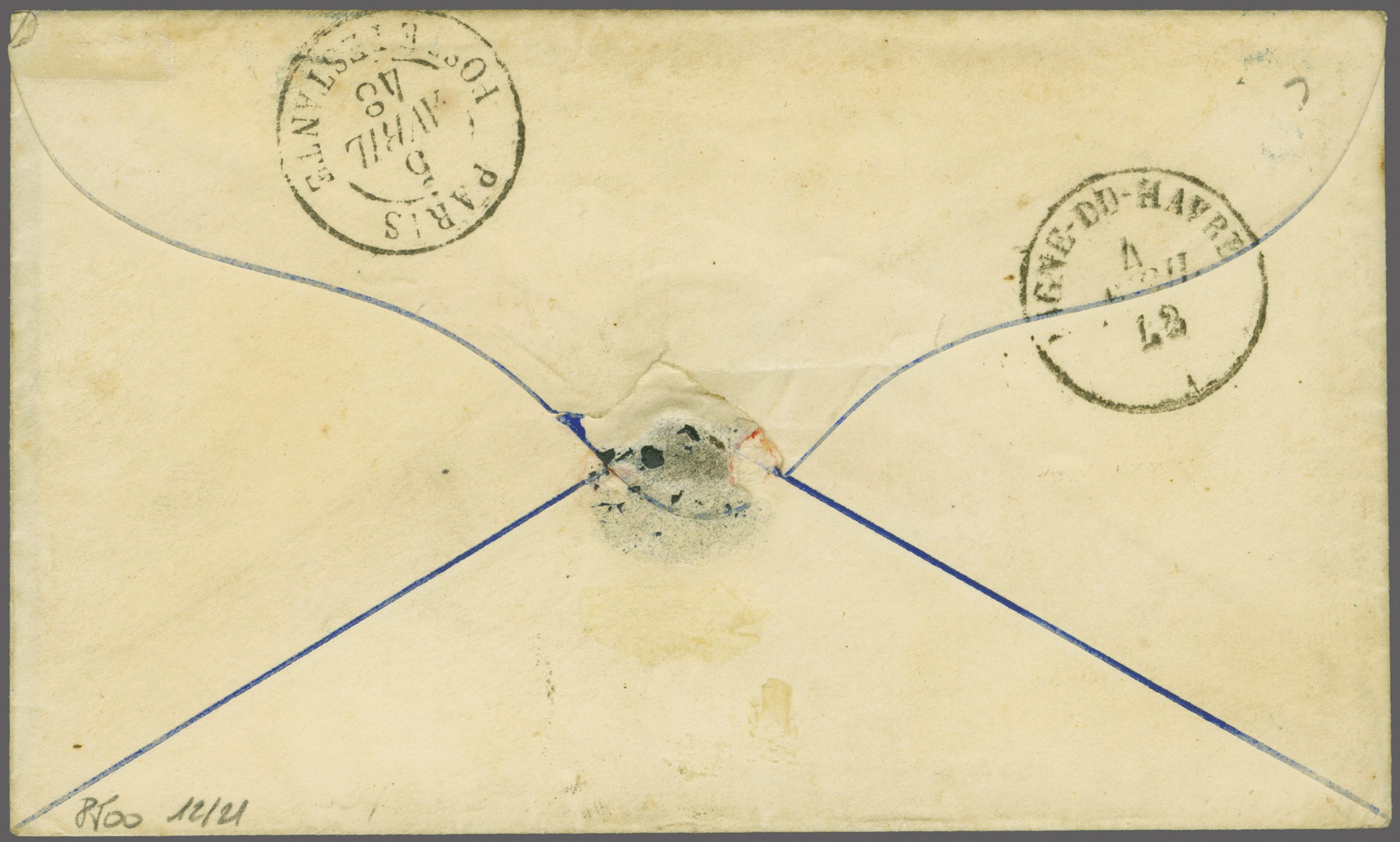 "OUTRE-MER / LE HAVRE" entry cds in red (April 4) alongside. Reverse with "LIGNE-DU-HAVRE" ambulant and "PARIS / POSTE RESTANTE" arrival (April 5) cds's. The Voie de Mer fee of 1 décime and the French inland fee of 5 décimes was charged with a