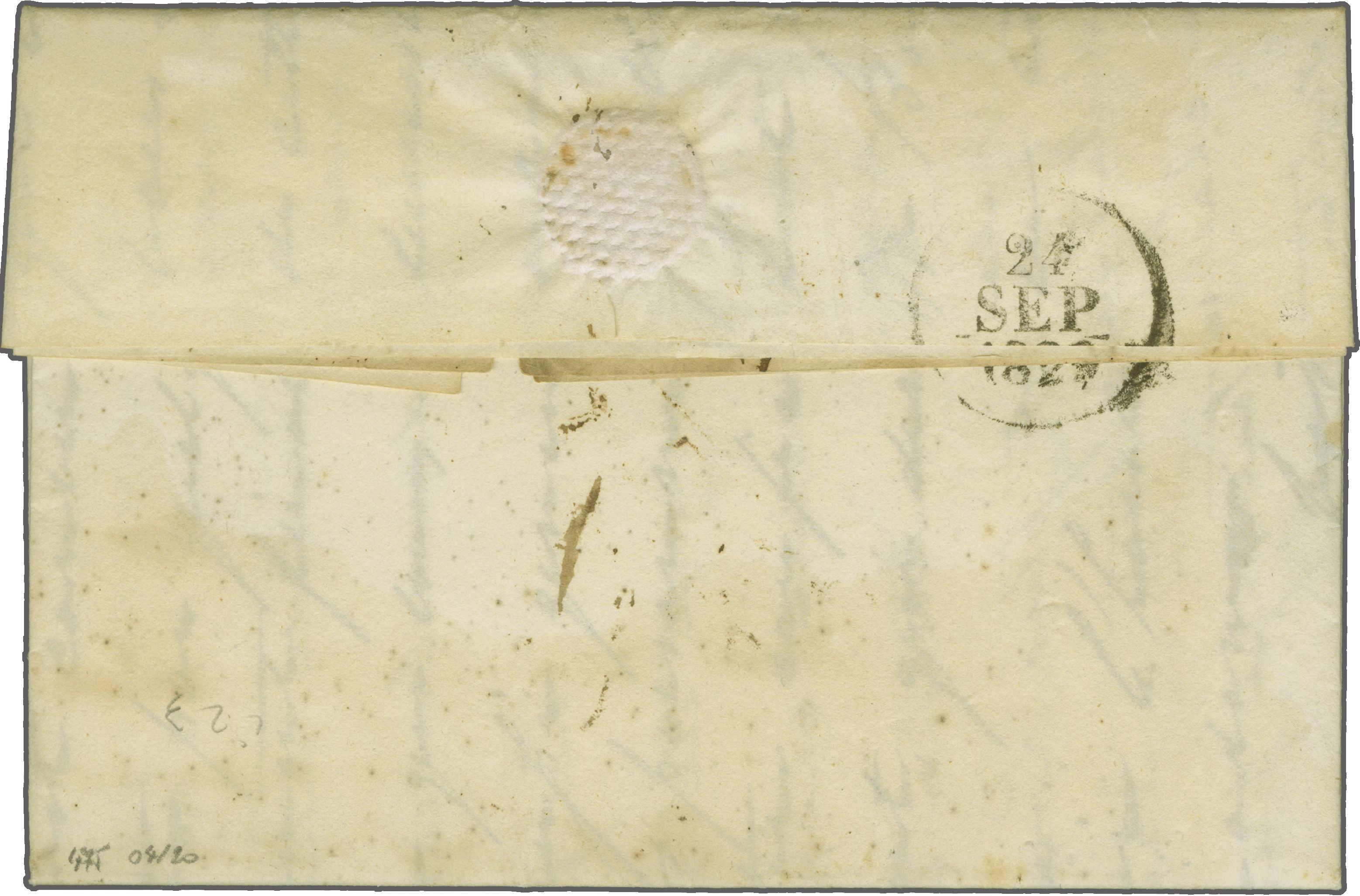 PAR / ST VAAST DE LA HOUGUE" in black, circular "22 SEPT 1829" transit datestamp at left, charged with 1 décime voie de Mer and 8 décimes for the French inland journey (Image 1)