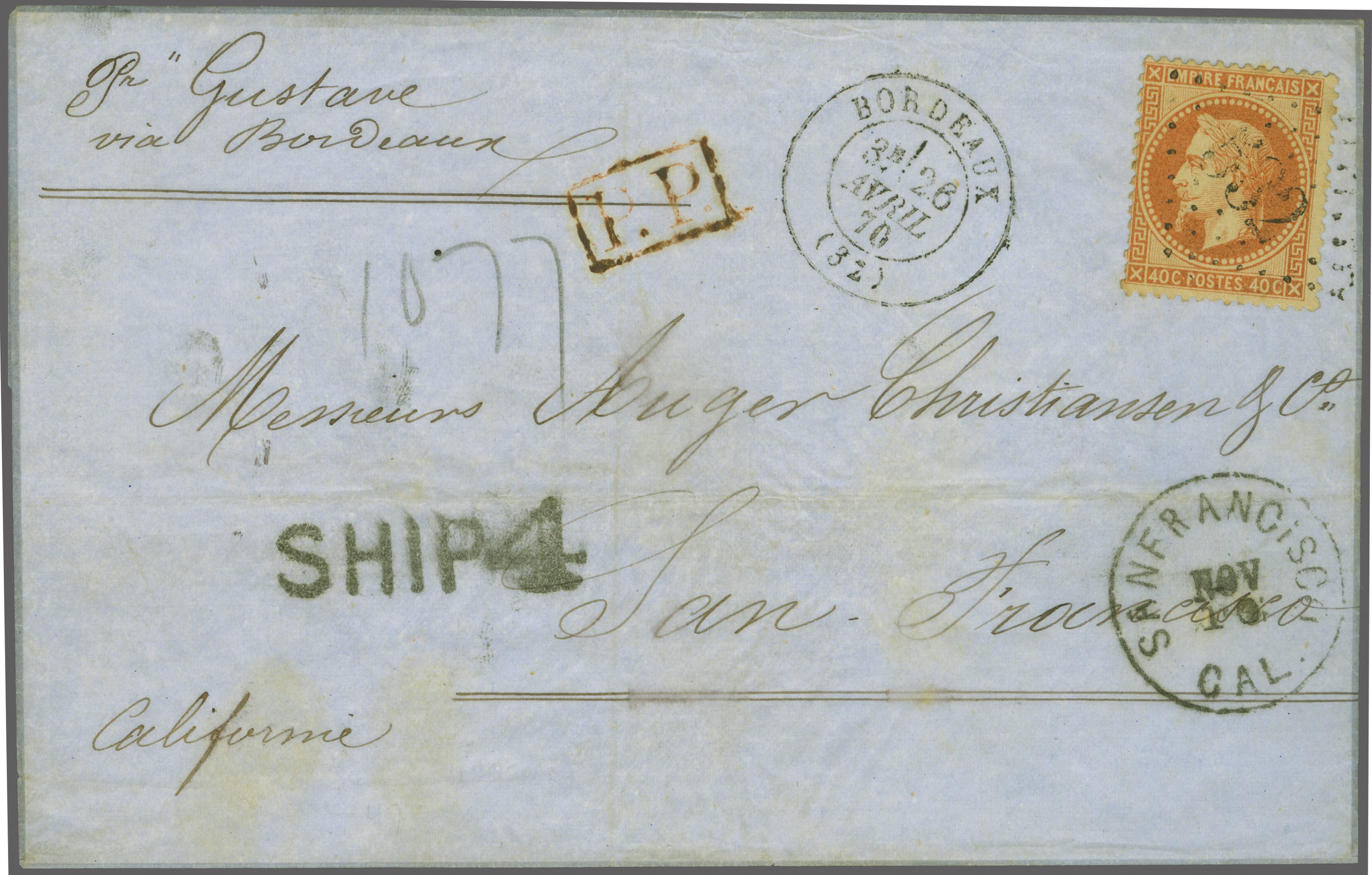 bearing 1868 Napoléon lauré 40 c. orange (Yvert 31), tied by Gros Chiffres '532' numeral, matching BORDEAUX despatch cds in black and framed "P.P." handstamp in red alongside. Struck by "SHIP 4" handstamp and "SAN FRANCISCO CAL. / NOV 10" arrival
