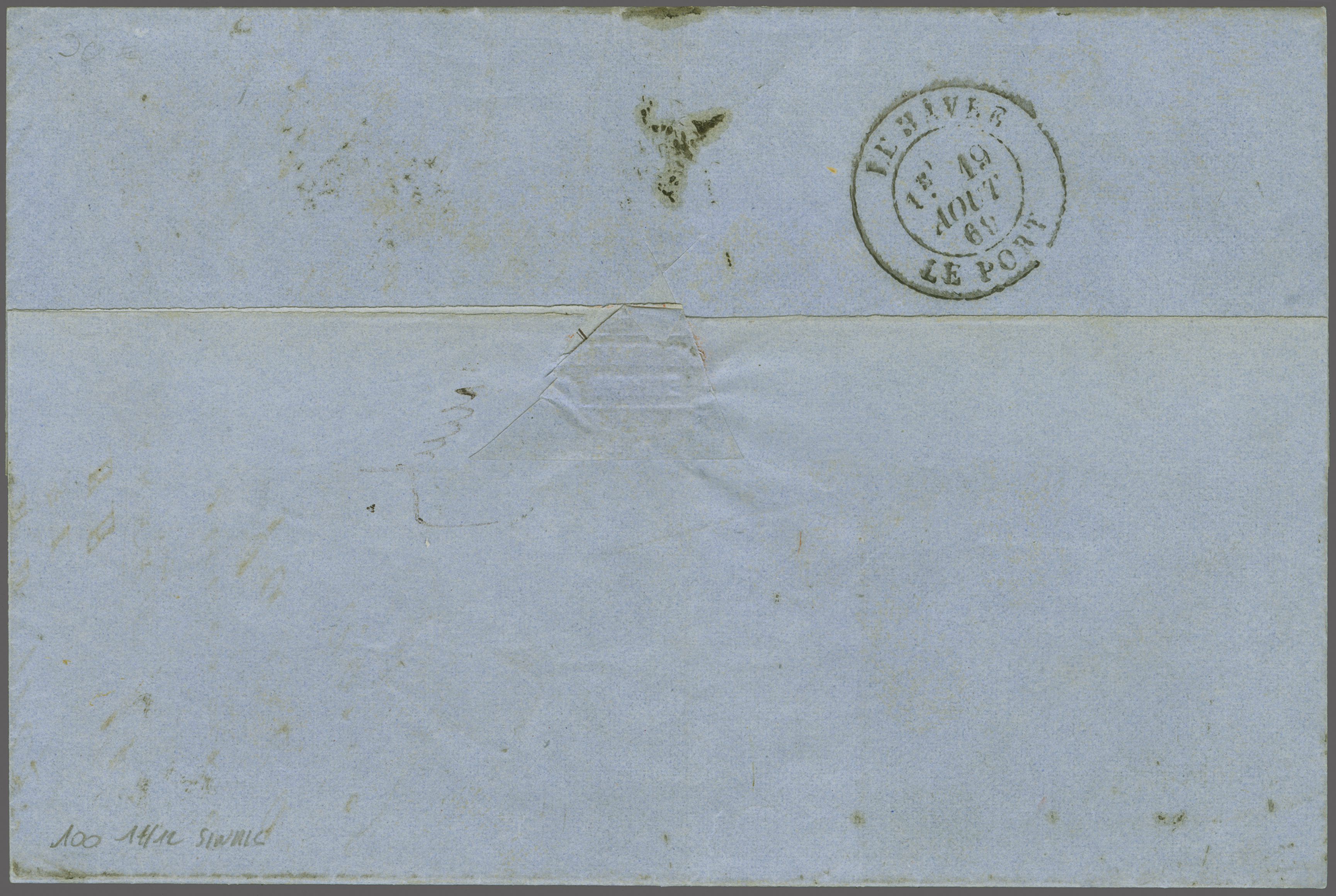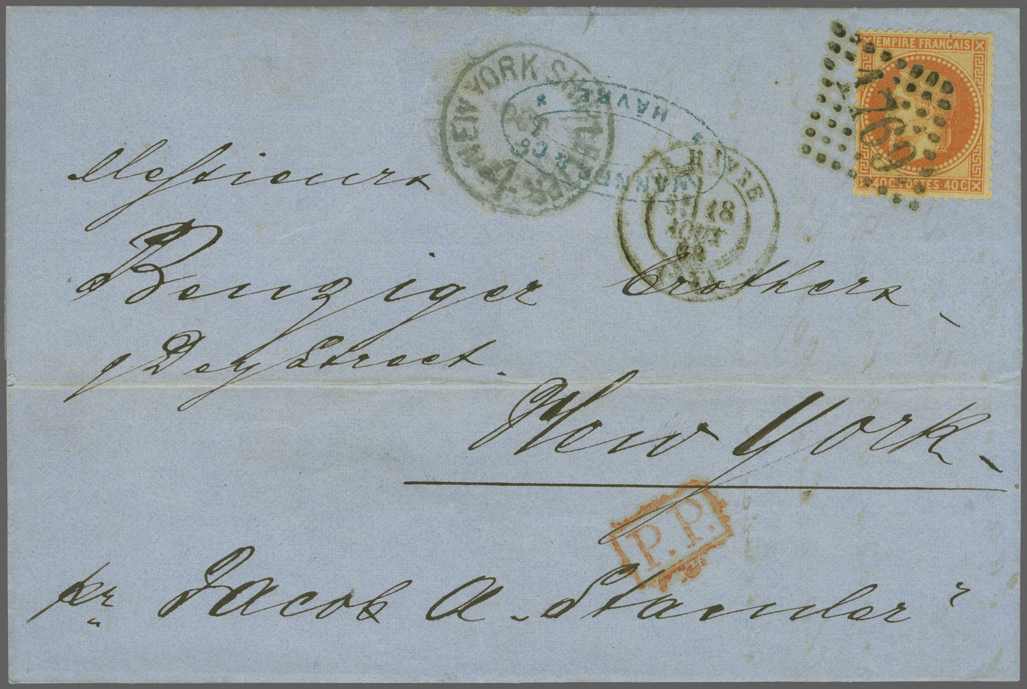Transatlantic mail between France and the USA and vice versa - Shipmail from France to the United States on private ships; 1869 (Aug 18): Cover from Le Havre to New York, endorsed "pr Jacob A Stamler", bearing 1868 Napoléon