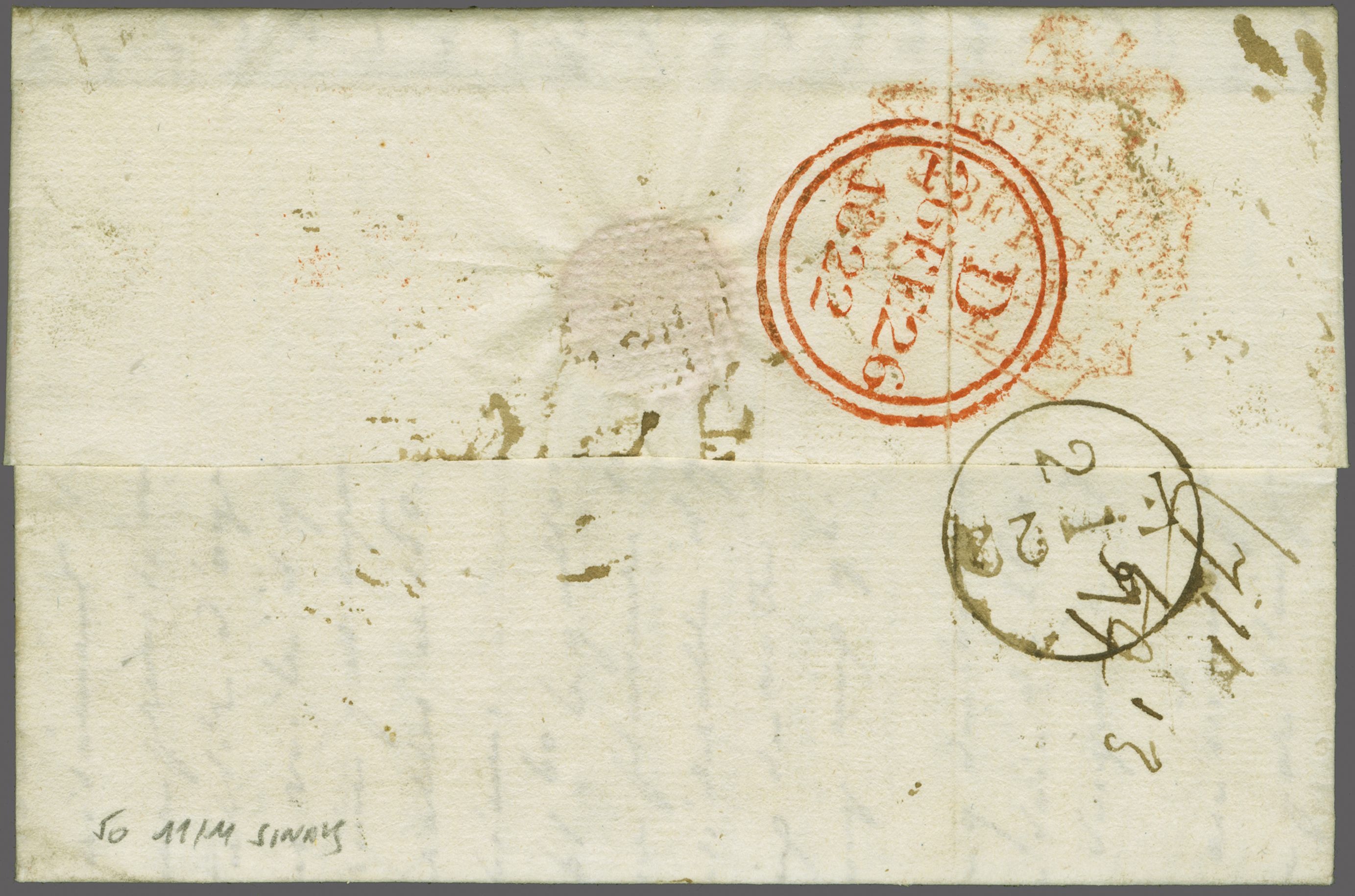 two-line "KENMARE / 156" handstamp in blue, overstruck by faint French one-line ANGLETERRE in red, reverse with different British "SHIP LETTER" and other datestamps showing arrival on 26 February 1822 (Image 1)