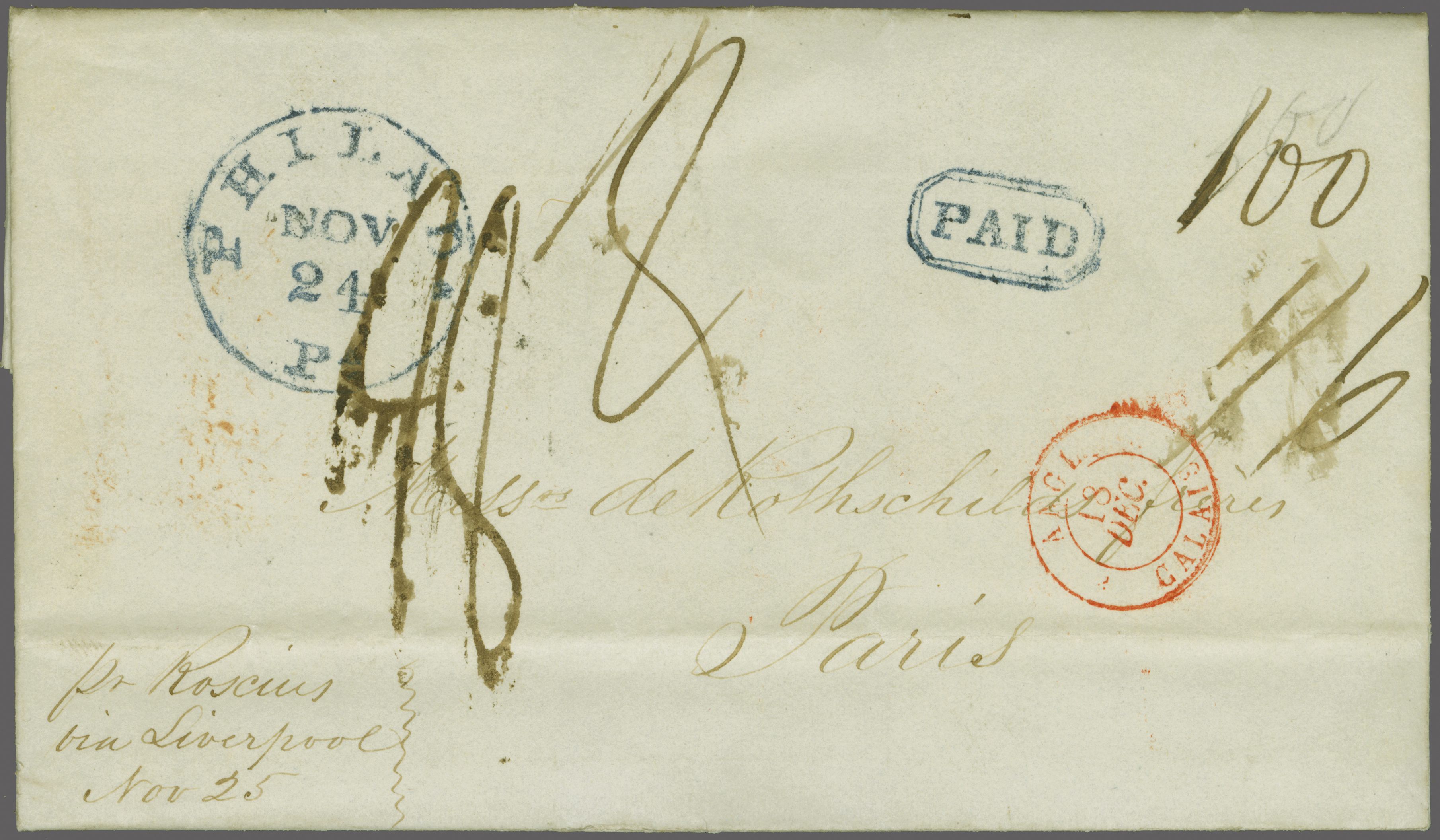 struck with "PHILAD. PA. " despatch datestamp in blue and double-framed PAID in the same ink, reverse with LIVERPOOL and LONDON transit, obverse with French "ANGL. CALAIS 18 DEC" entry cds in red. An appealing freight money fee cover (Image 1)