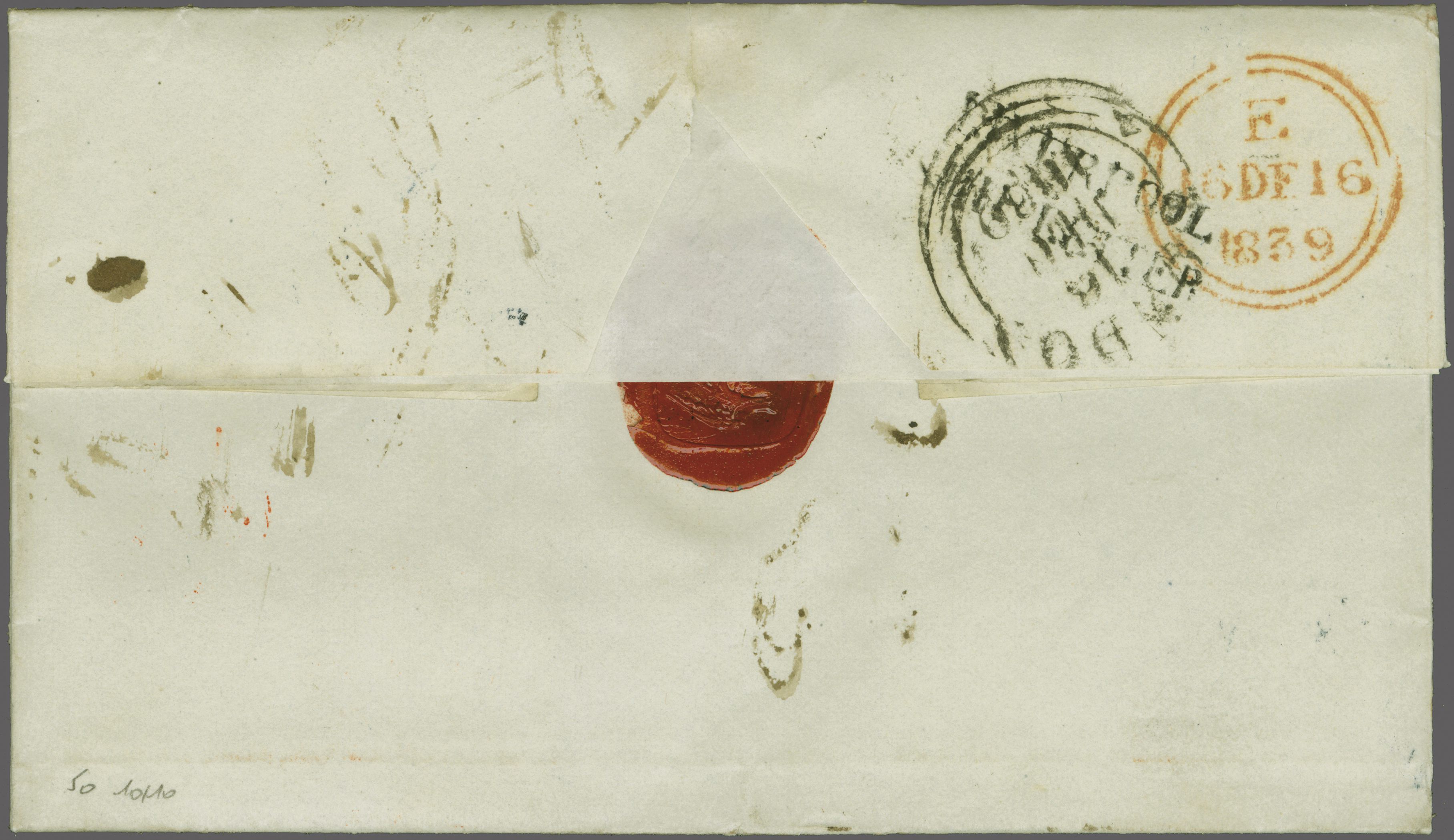 Transatlantic mail between France and the USA and vice versa - Shipmail on foreign private ships; 1839 (Nov 24): Prepaid Quadruple rate Entire letter from Philadelphia to Paris, endorsed "pr Roscius via Liverpool Nov 25",