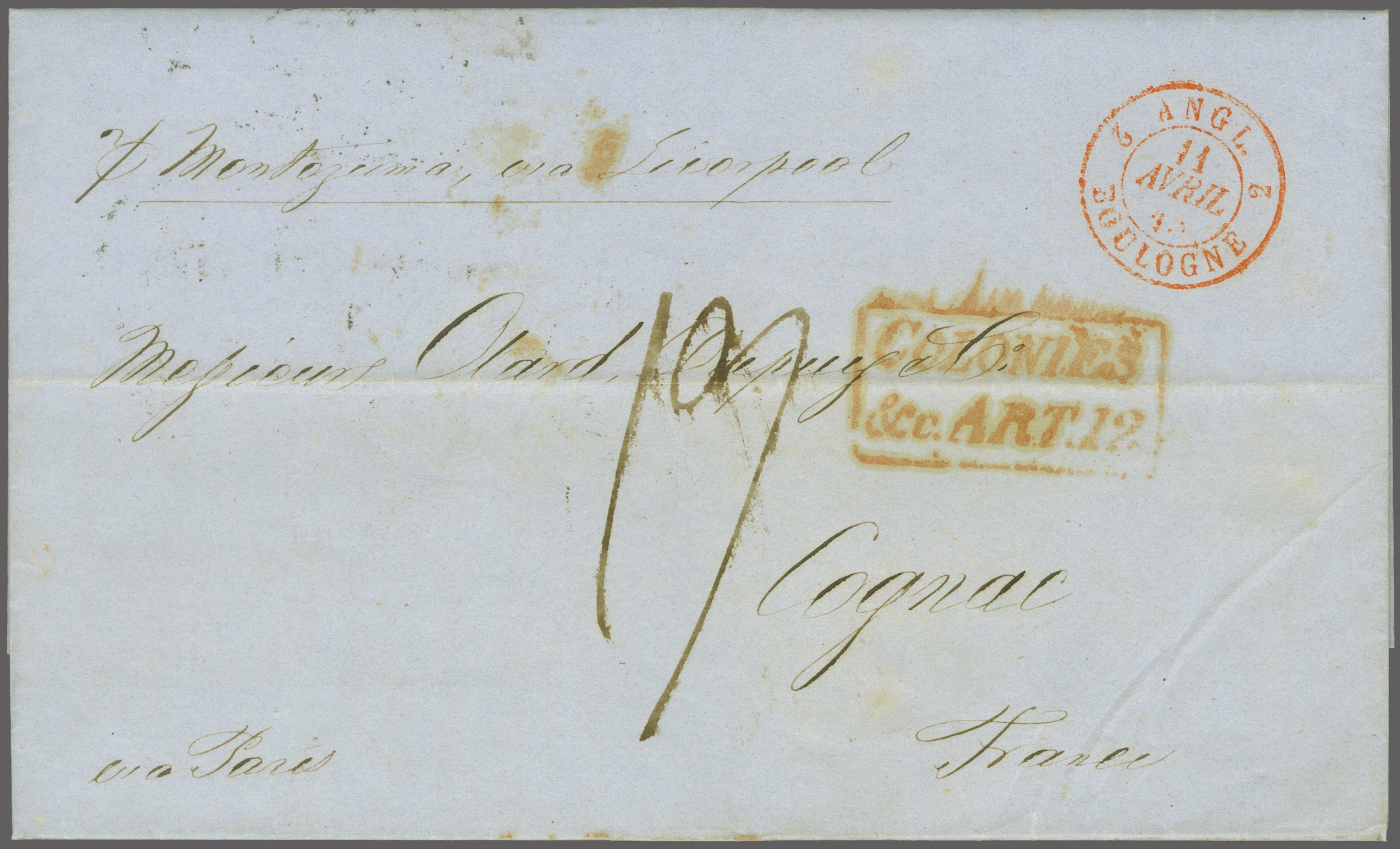 Transatlantic mail between France and the USA and vice versa - Shipmail on foreign private ships; 1845 (March 15): Entire letter from New York to Cognac, endorsed "pr Montezuma via Liverpool" and "via Paris", reverse with