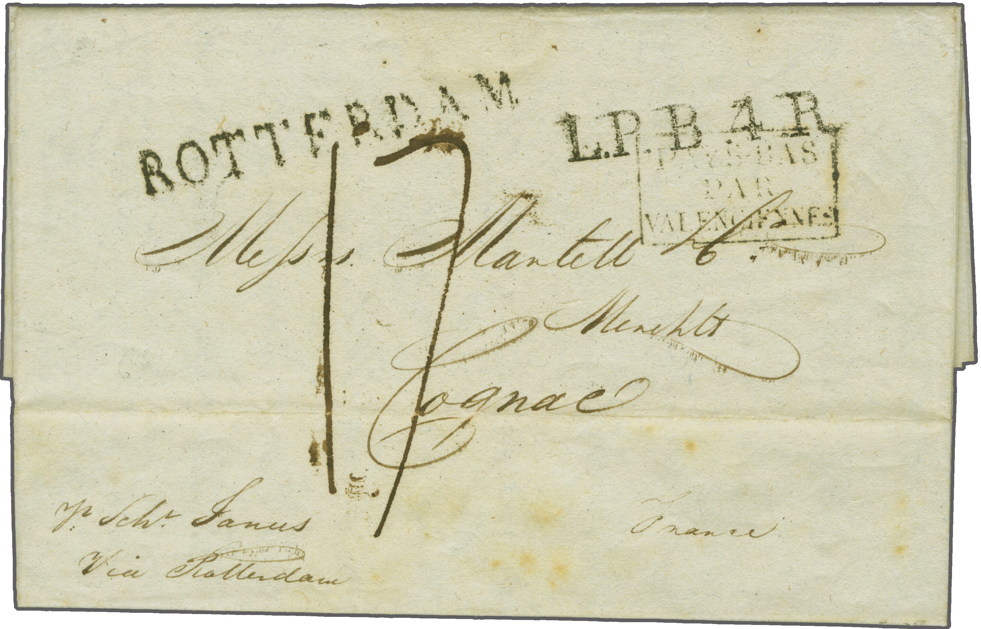 note, obverse with straight-line ROTTERDAM and French "L.P.B. 4 R." accountancy, as well as framed "PAYS-BAS PAR VALENCIENNES" handstamps. Charged with 17 décimes to be paid by the receiver (Image 1)
