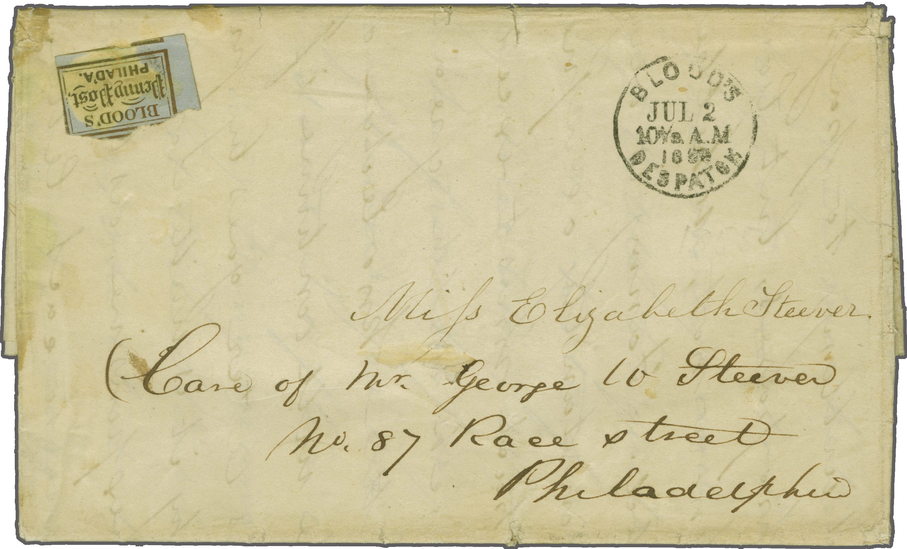 Transatlantic mail between France and the USA and vice versa - Shipmail via Carriers; 1855 (May 8): Entire letter with full content on a second page from Paris to Philadelphia, bearing on front BLOOD's Penny Post a c. bronze