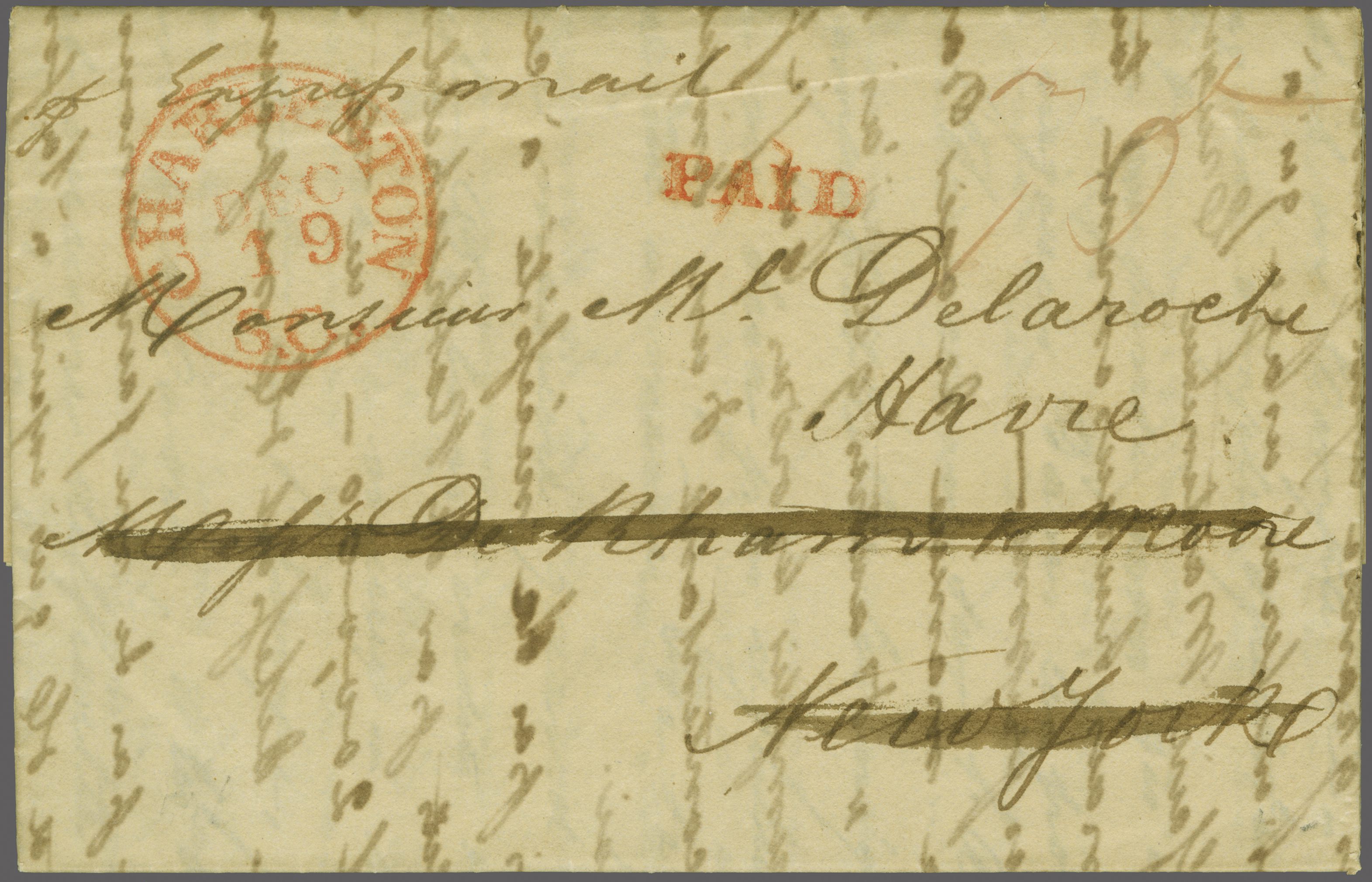 Transatlantic mail between France and the USA and vice versa - Express mail; 1838 (Dec 19): Entire express letter from Charleston to New York, redirected to Havre, endorsed "pr Express mail", struck with neat "CHARLESTON DEC