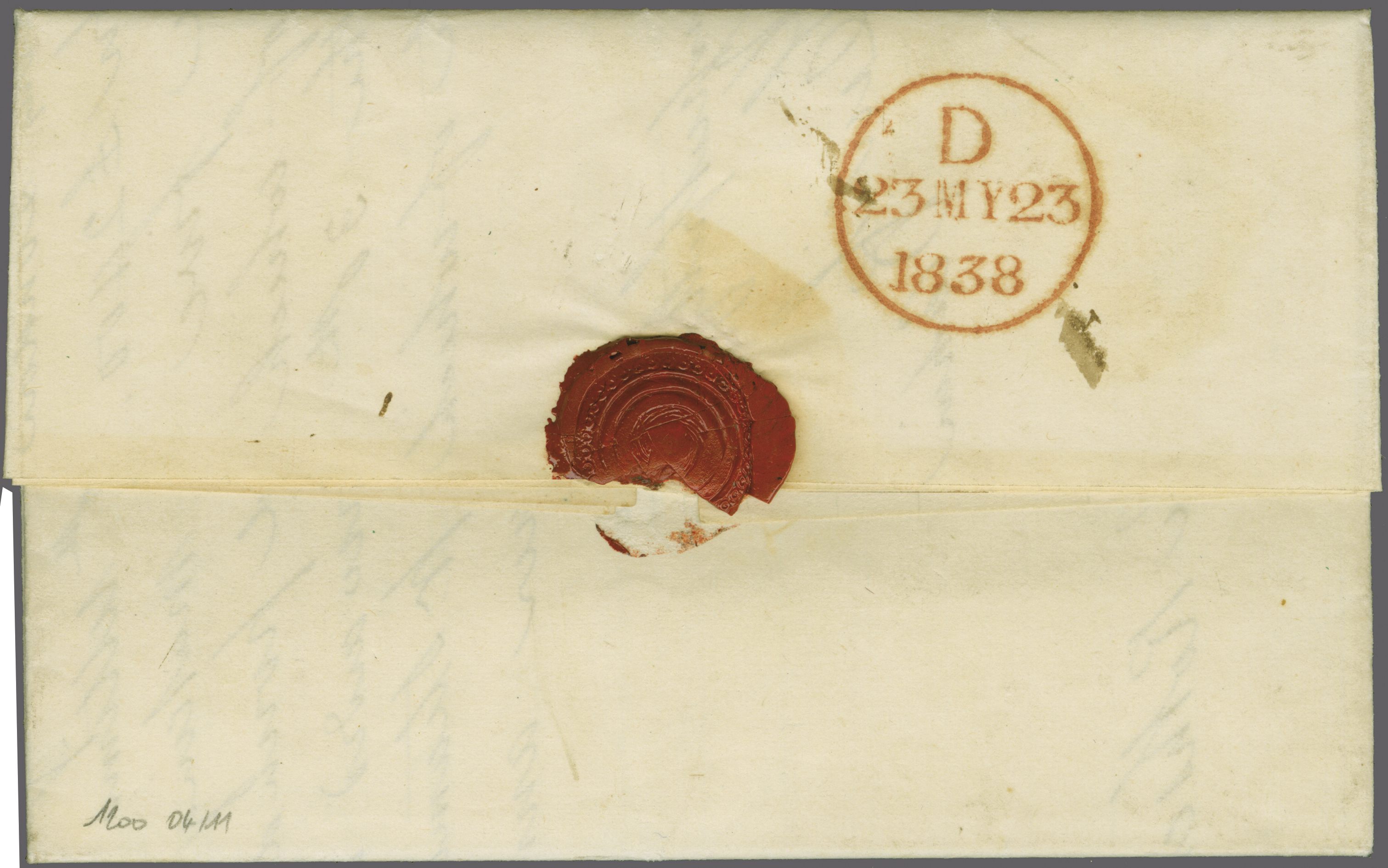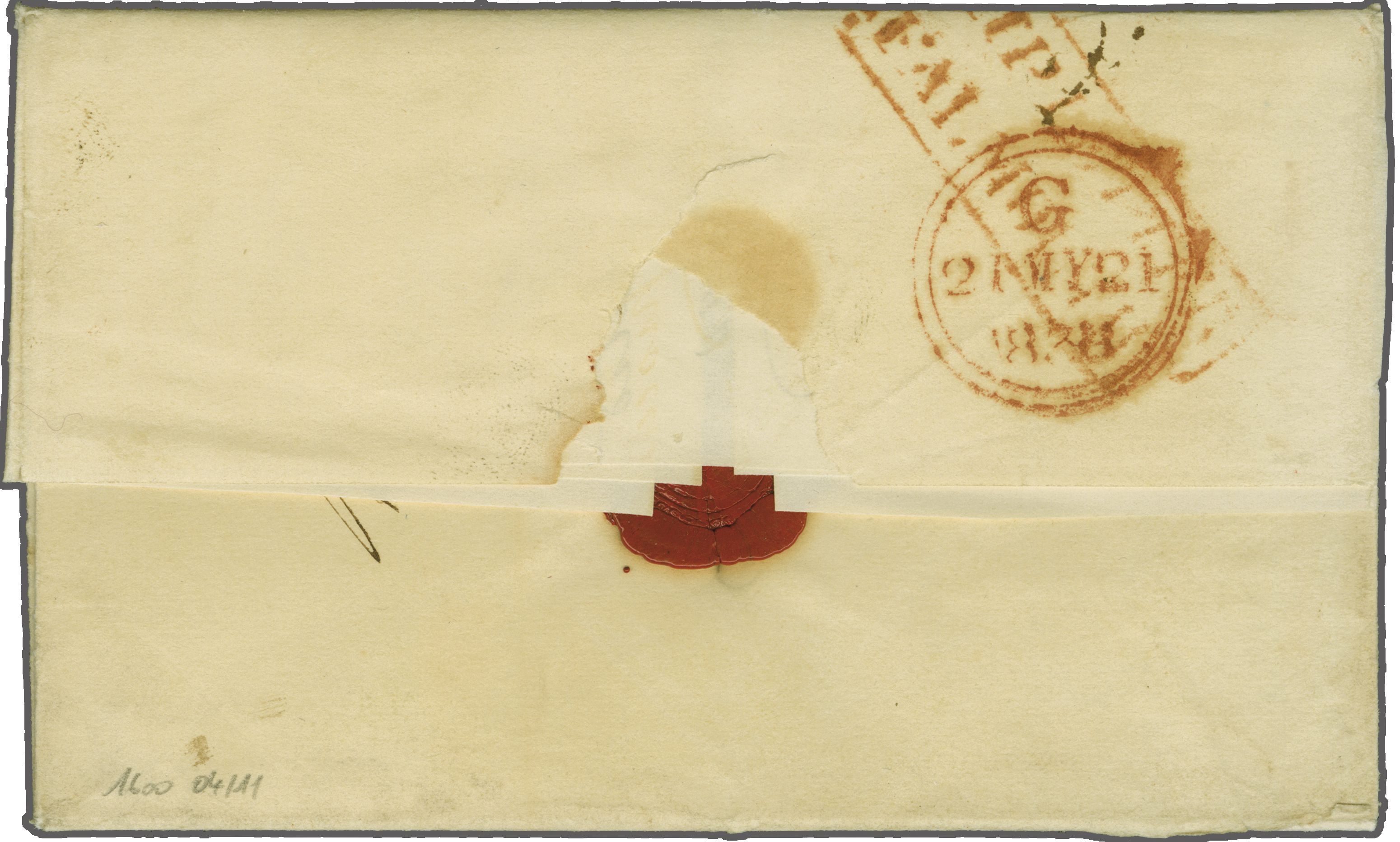 OCT 28" cds and straight-line PAID, both in the same blue ink, as well as "NEW YORK OCT 31" cds in red and indistinct "HAVRE 6 DEC 1838" cds. An appealing entire (Image 1)