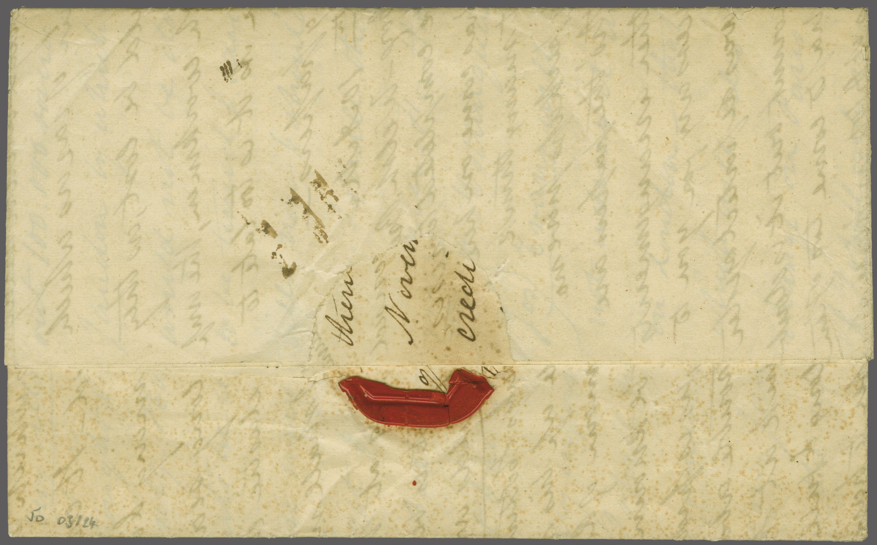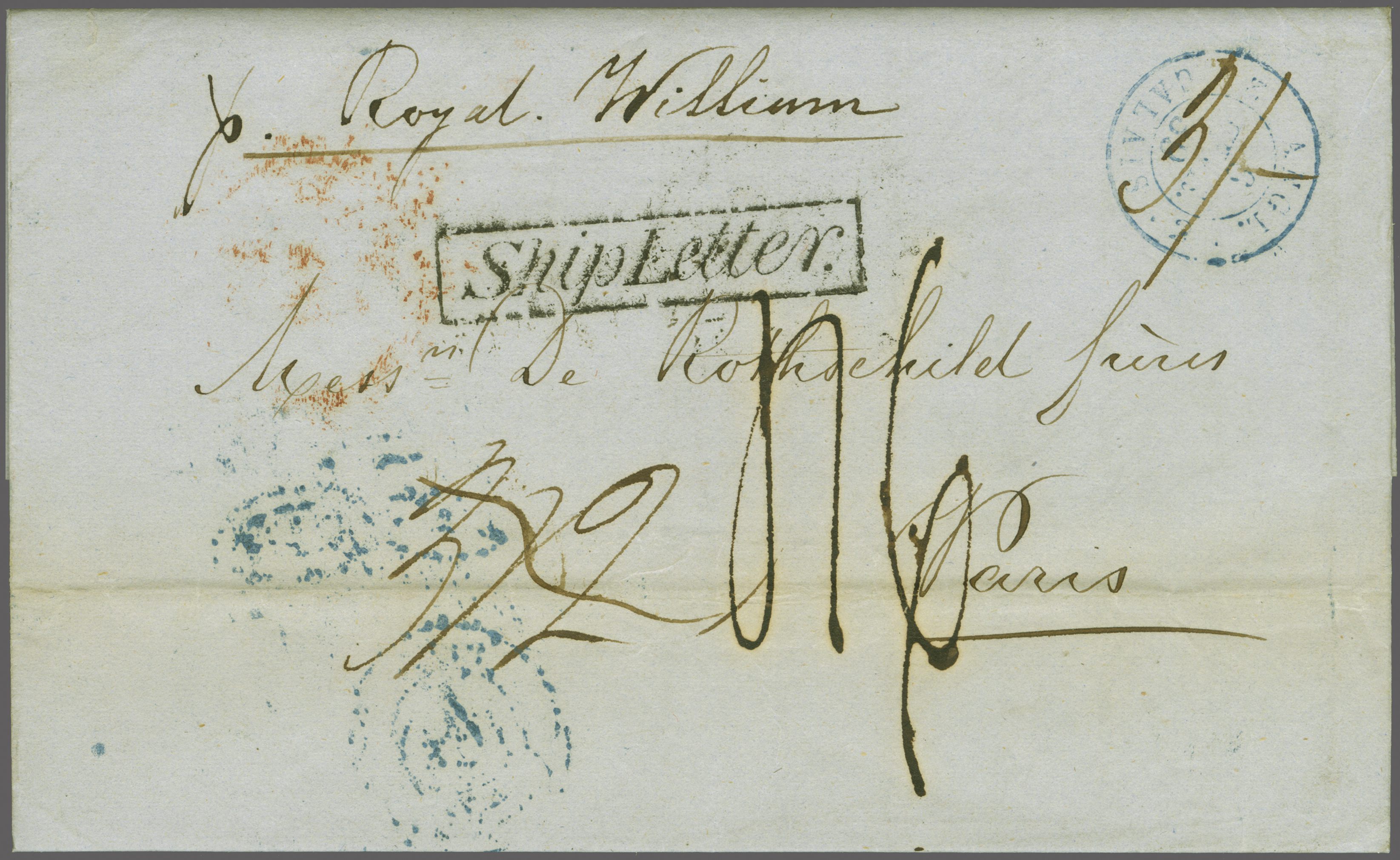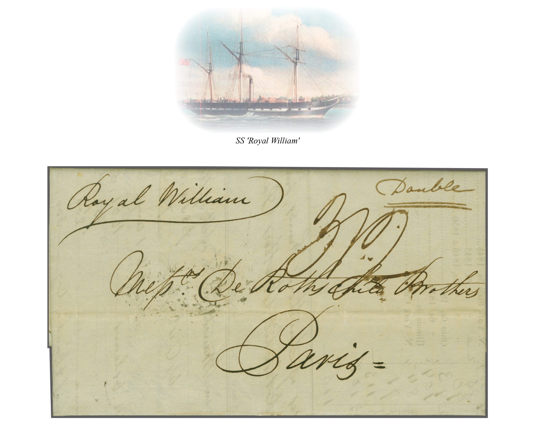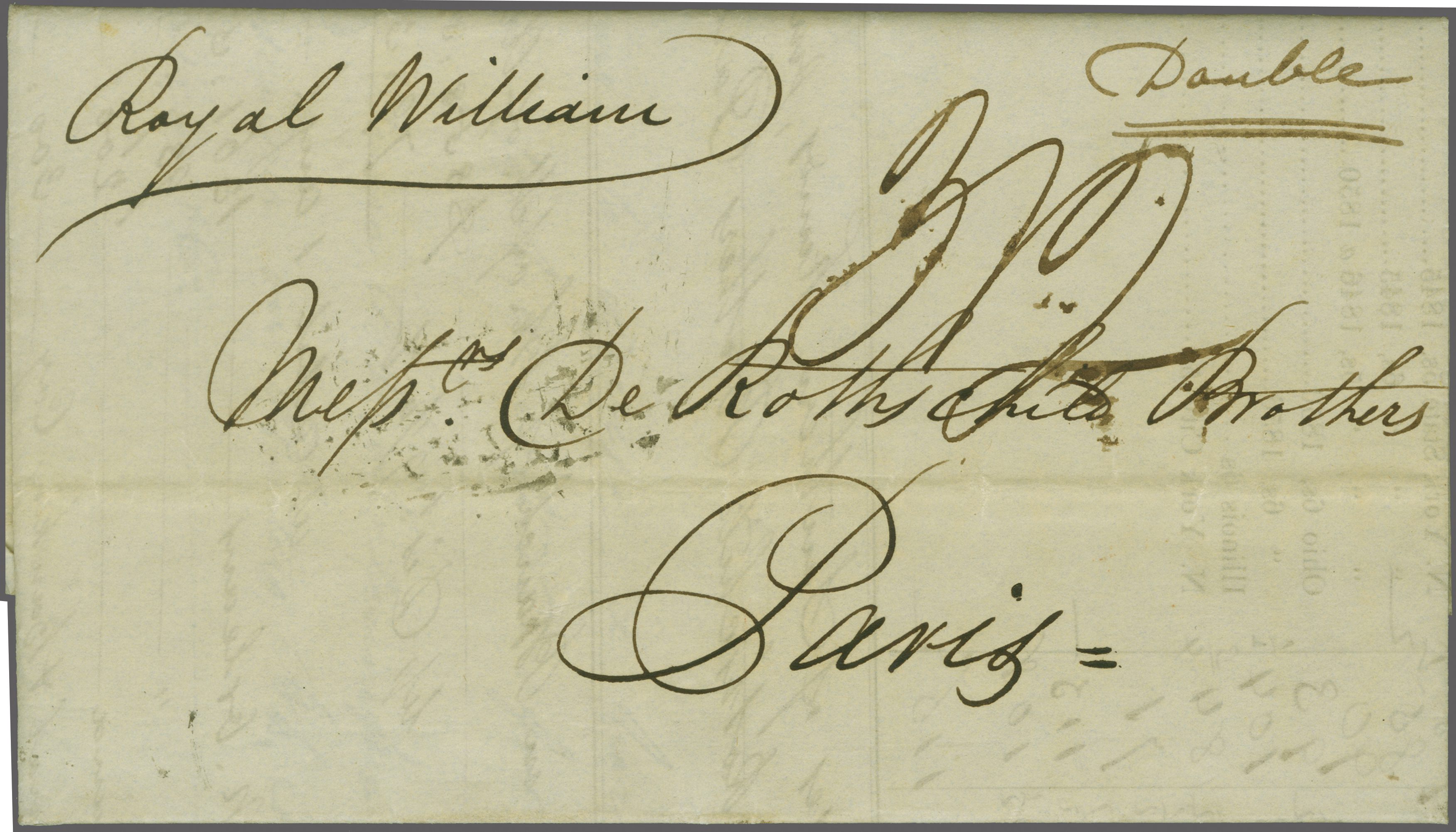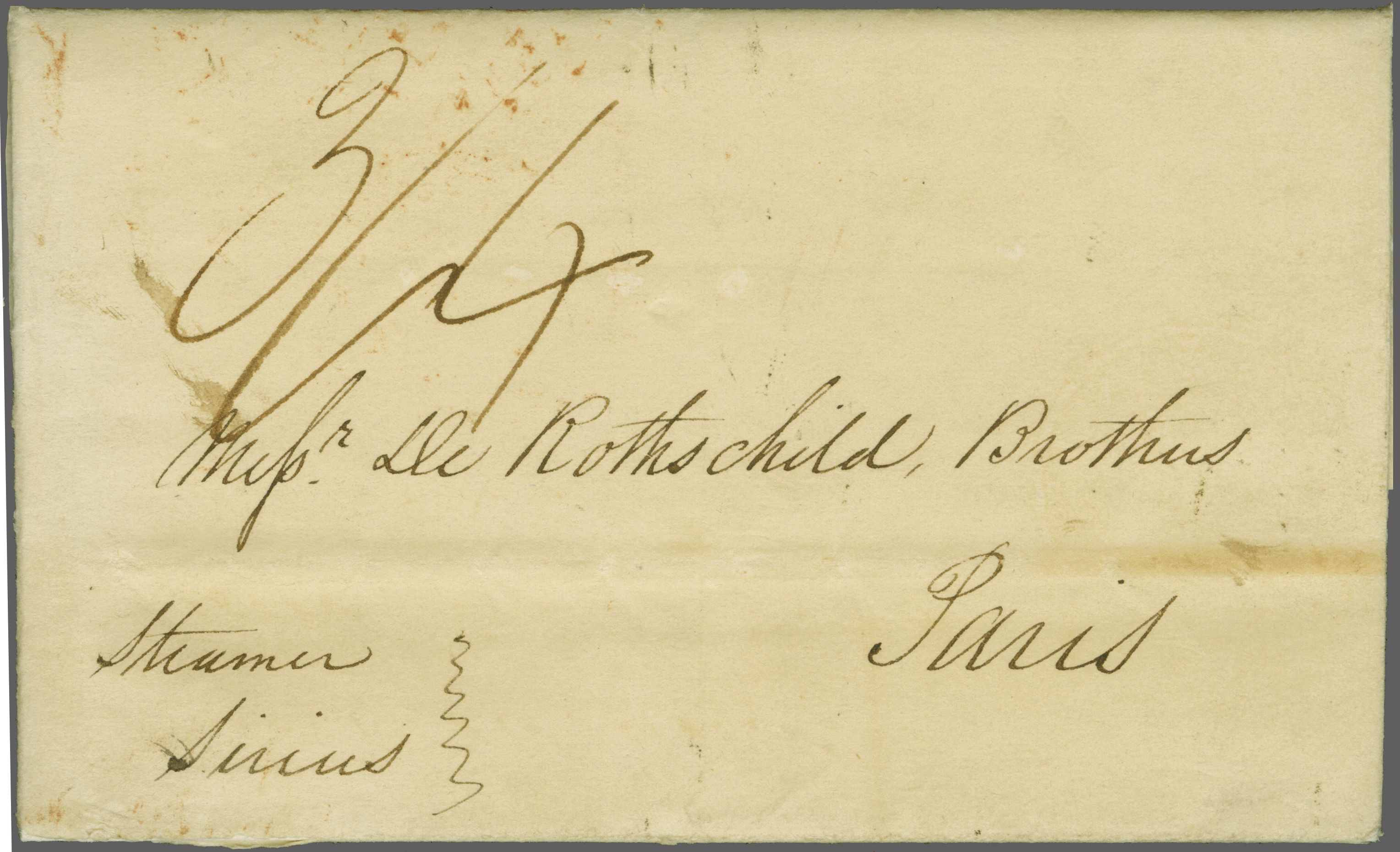 Transatlantic mail between France and the USA and vice versa - Pioneer Steamships; 1838 (Aug 4): Entire letter from New York to Paris with the 1st passage of the 'Royal William', endorsed "Royal William", reverse with "SHIP