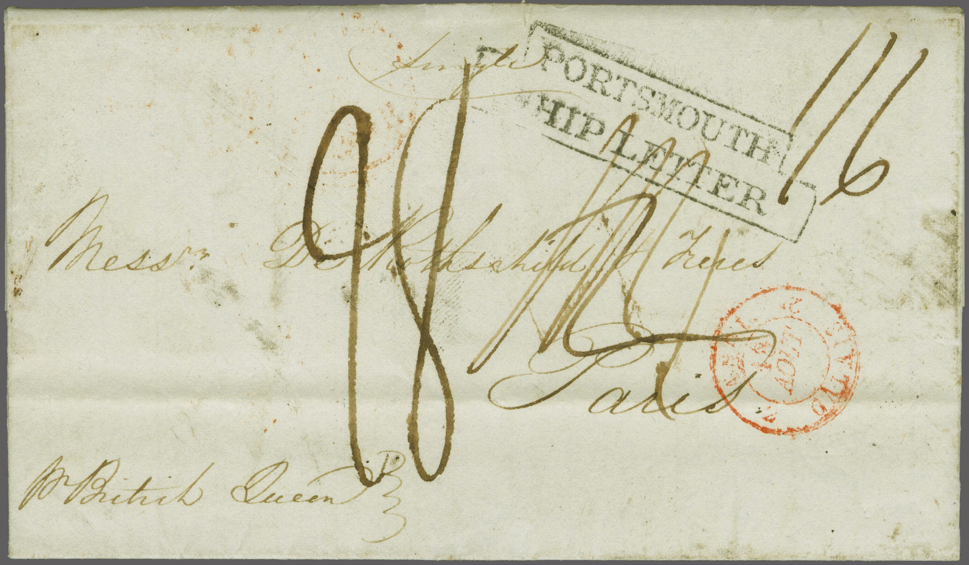 reverse with framed "PORTSMOUTH SHIP LETTER" stepped handstamp and French "ANGL. CALAIS" entry cds (Aug 18) in red. This 'Sirius' journey lasted from August 1-15 between New York and Portsmouth (Image 1)