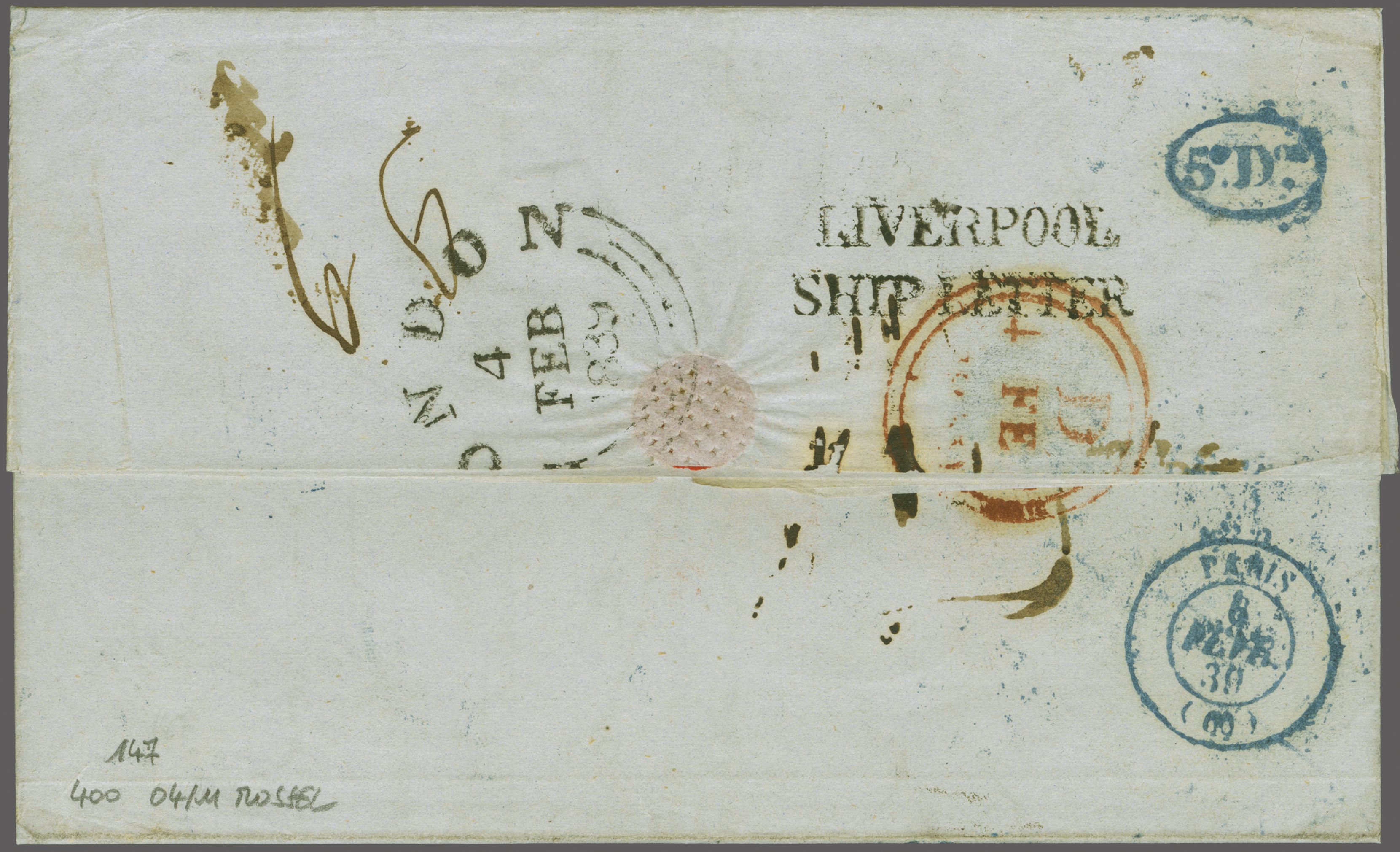 with framed italic "Ship Letter." and French "ANGL. CALAIS" entry cds (Feb 6), reverse with two-line "LIVERPOOL SHIP LETTER " handstamp, London transit datestamp (Feb 4) cds, both in black as well as PARIS arrival cds (Feb 6) and oval "5e Des"