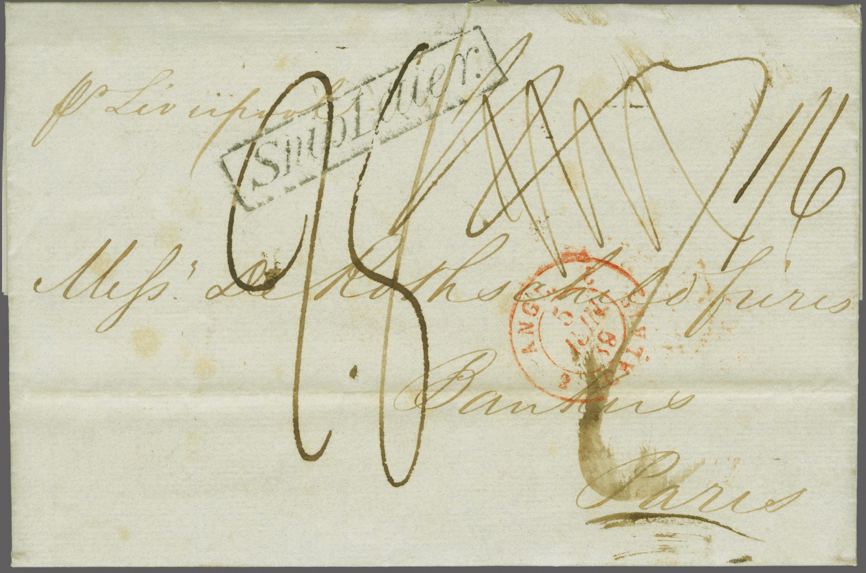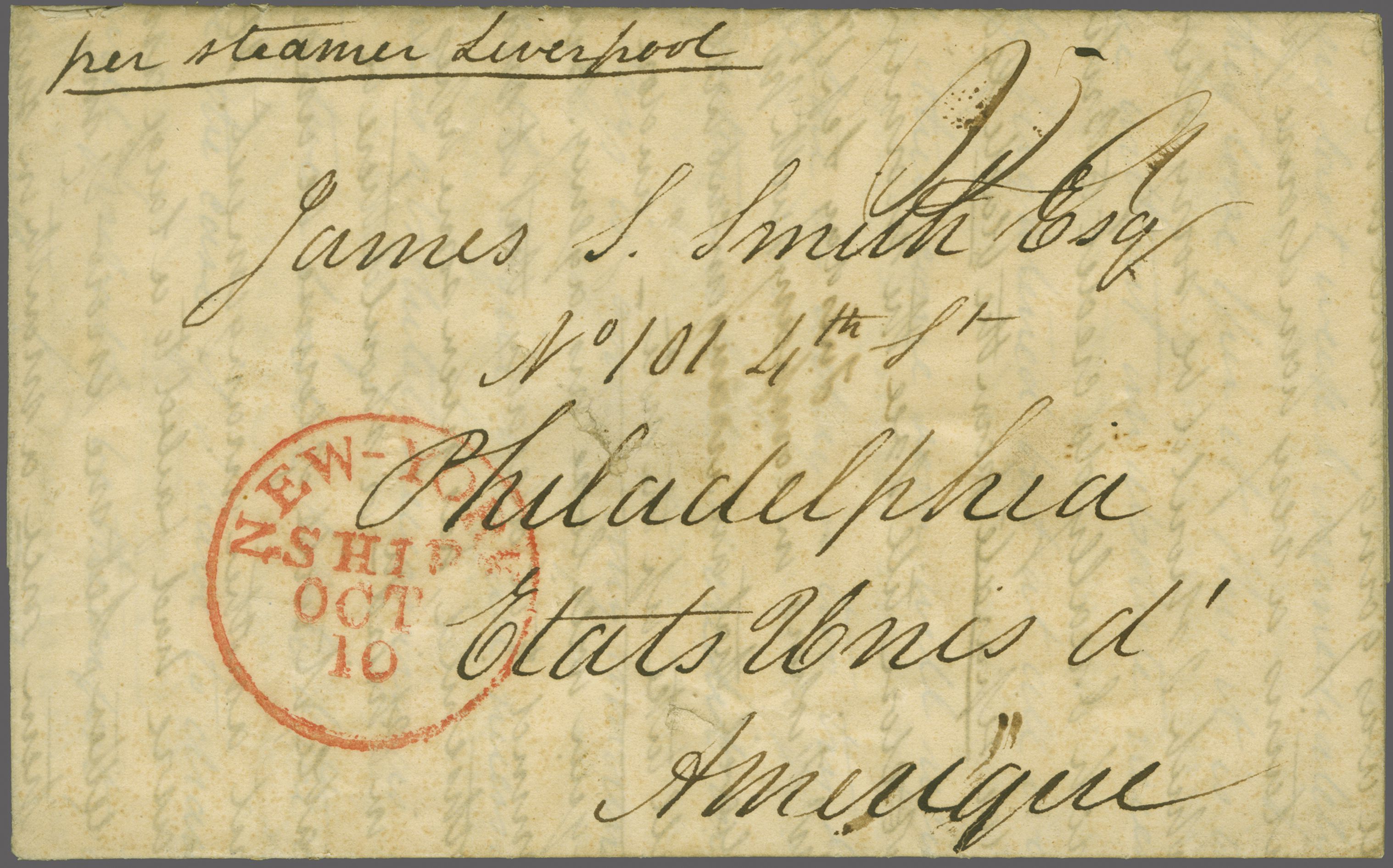 Transatlantic mail between France and the USA and vice versa - Pioneer Steamships; 1839 (May 18): Entire letter from New York to Paris with the 3rd voyage of the 'Liverpool', endorsed "pr Liverpool", obverse with clear framed