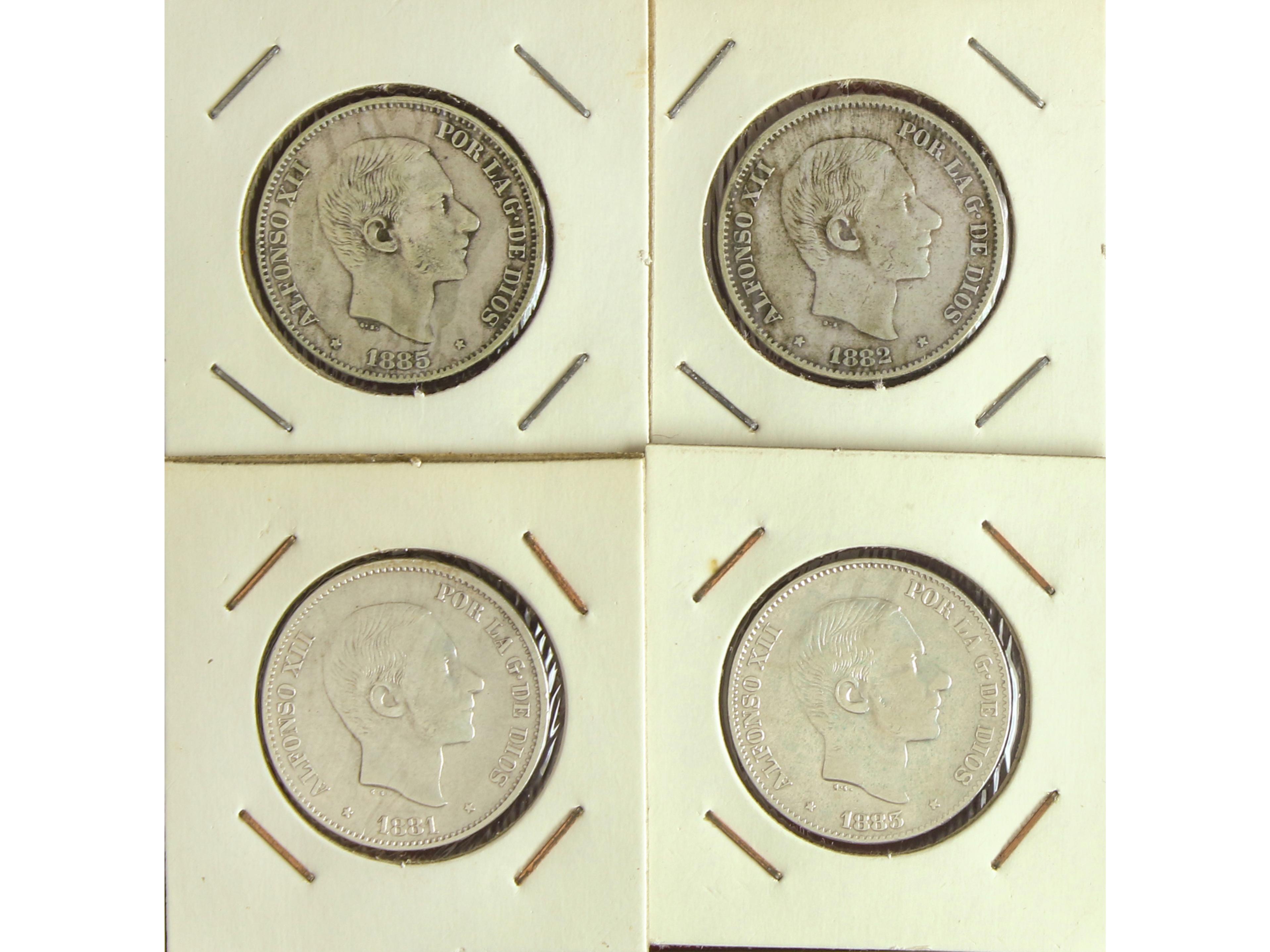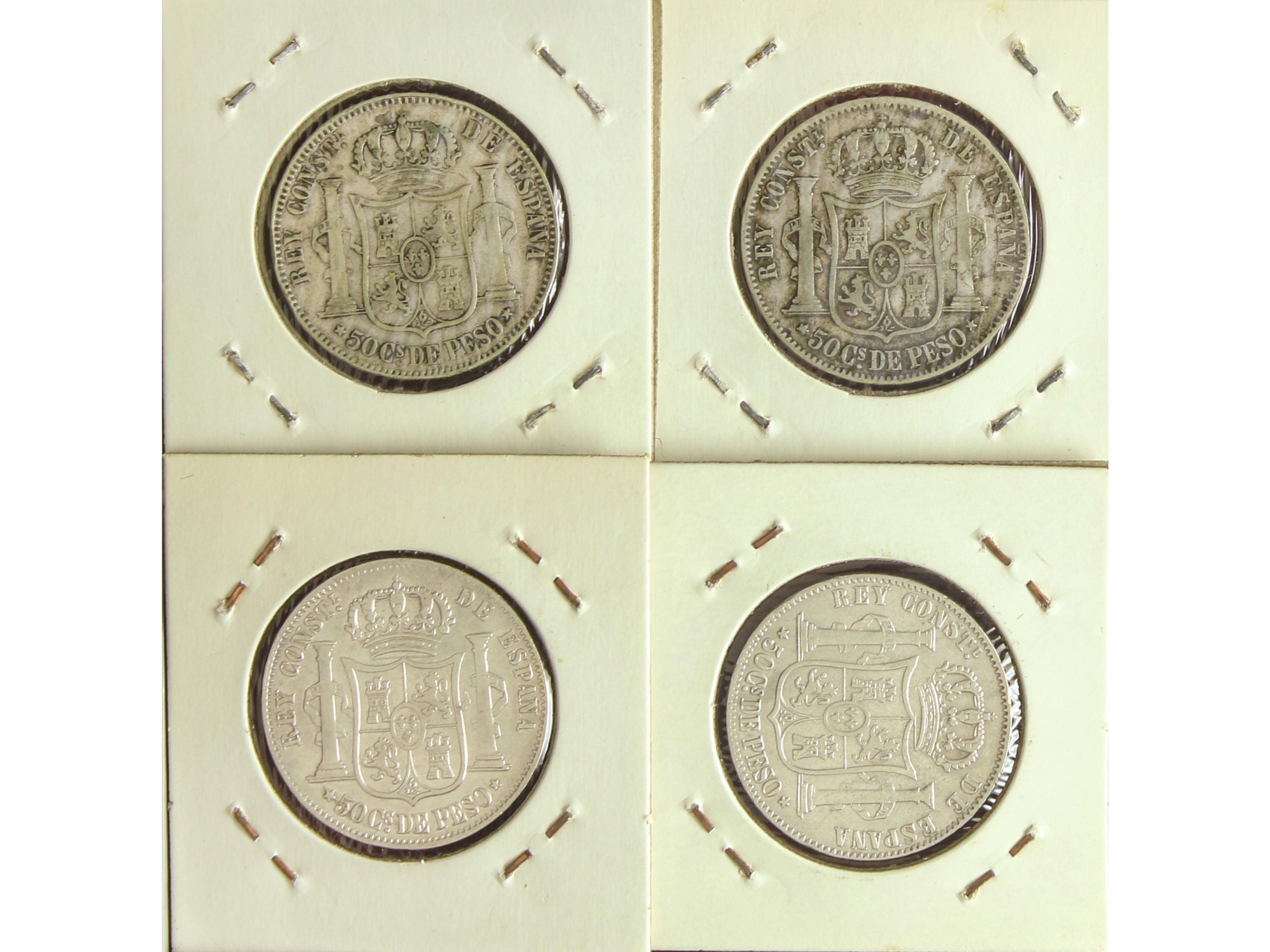 Lote 4 monedas 50 Centavos de Peso. 1881, 1882, 1883 y 1885. MANILA. A EXAMINAR. AC-114, 118, 120, 124. MBC- a MBC.