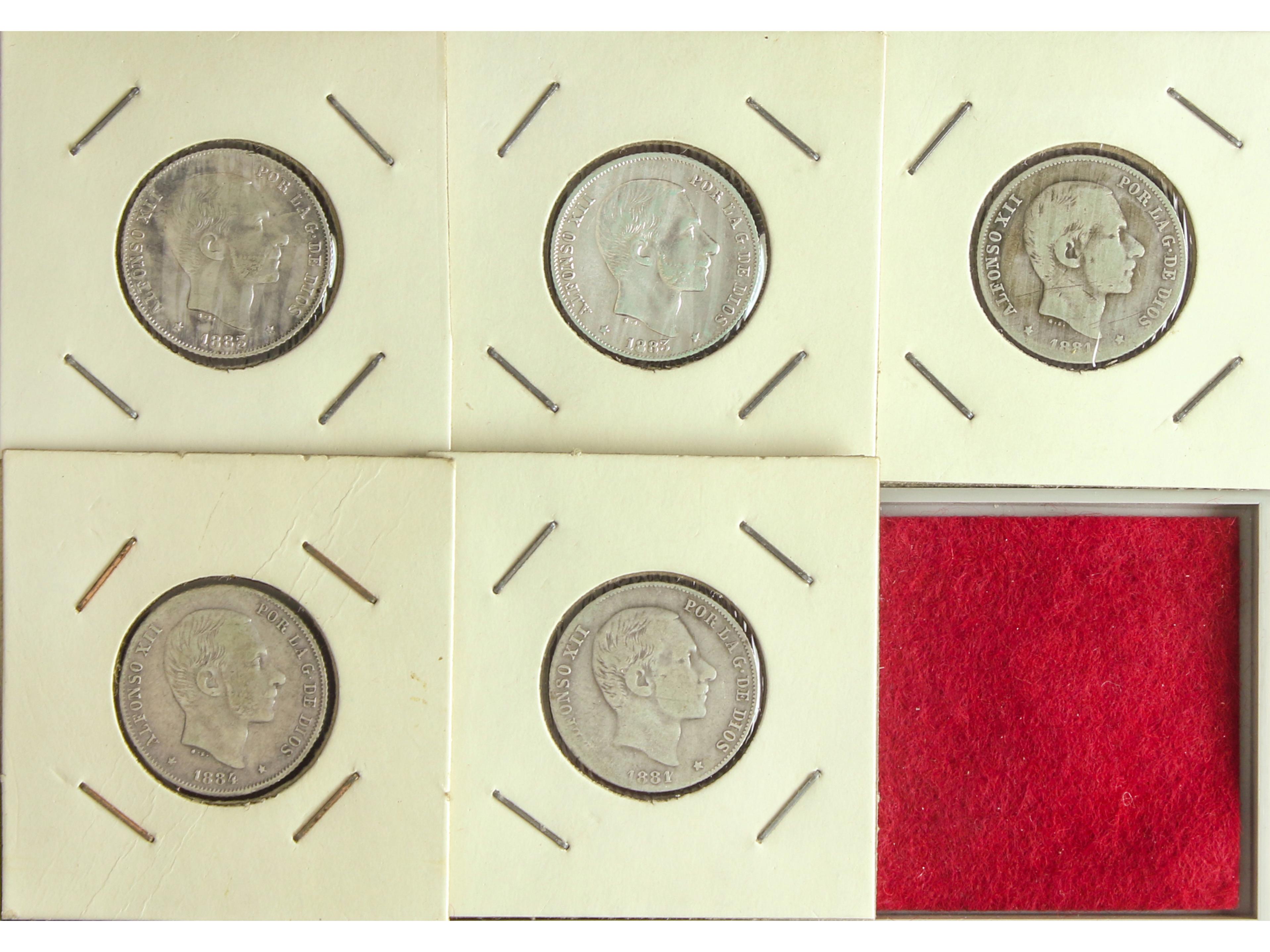Lote 5 monedas 20 Centavos de Peso. 1881 (2), 1883, 1884 y 1885. MANILA. A EXAMINAR. AC-105, 109, 110, 111. MBC- a MBC.