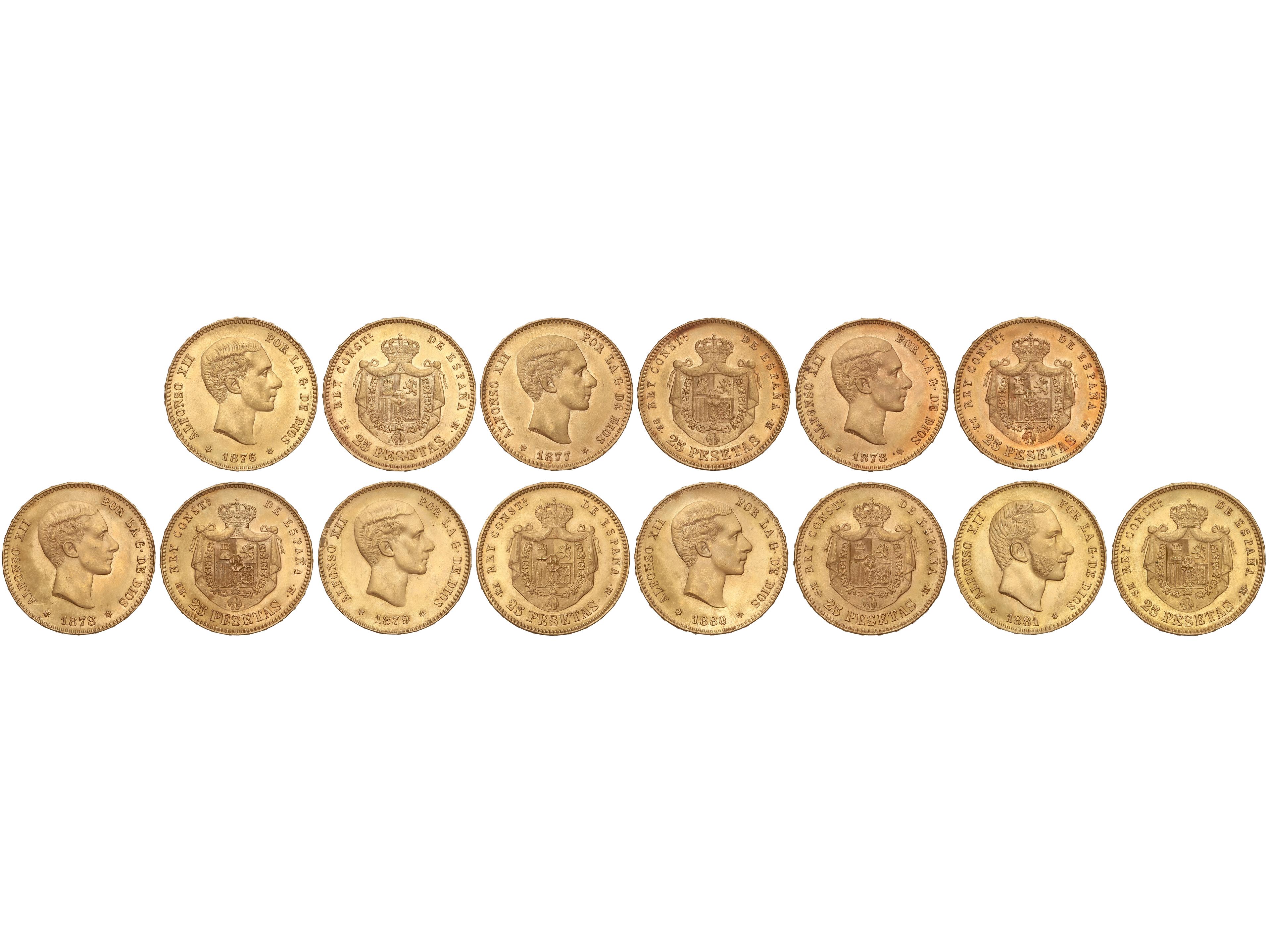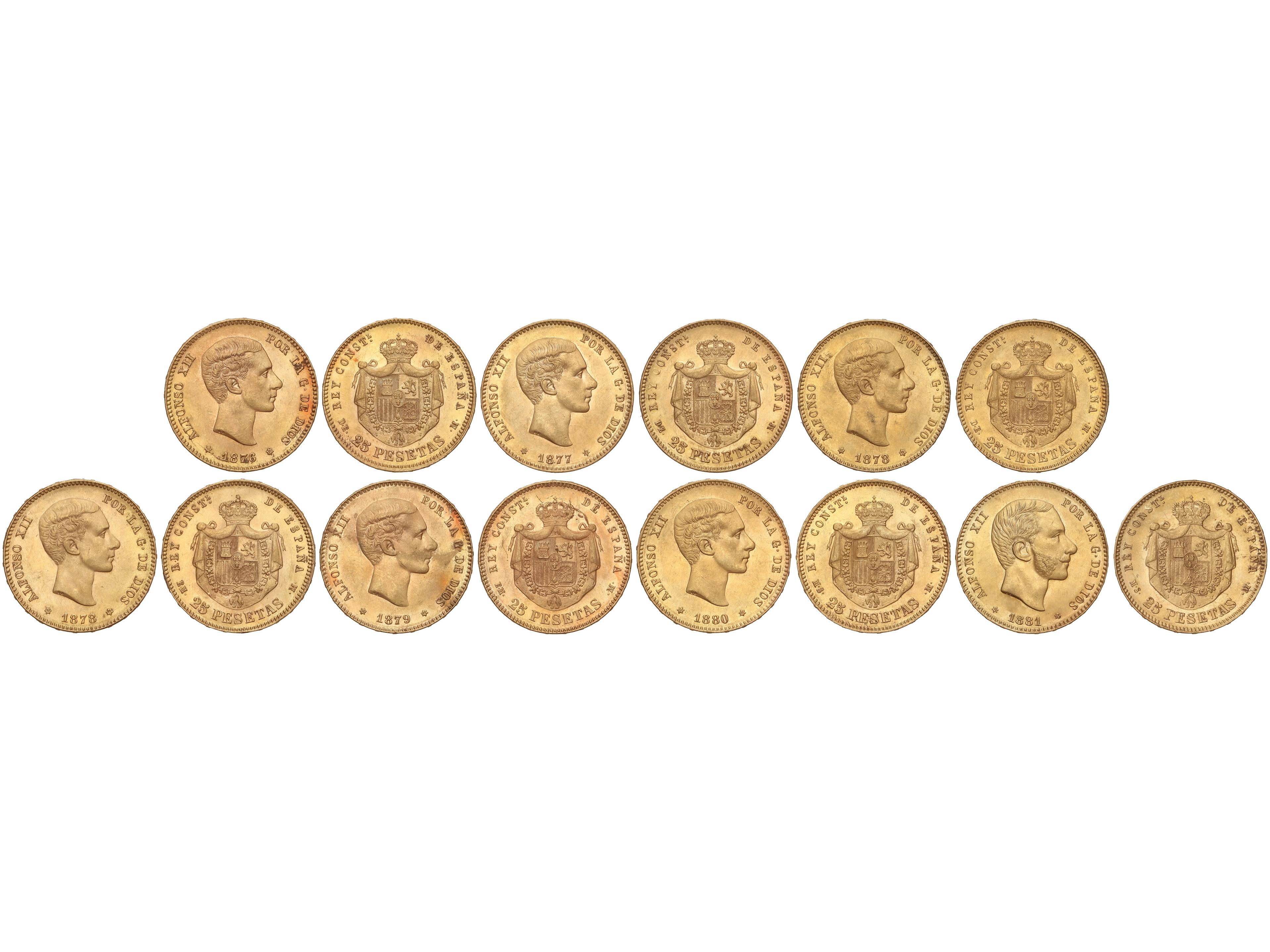 Lote 7 monedas 25 Pesetas. 1876 a 1881. Peso total de 56,34 grs. AU (900). Todas diferentes. Contiene 1878 D.E.-M. y E.M.-M. A EXAMINAR. EBC a SC-. (Image1)