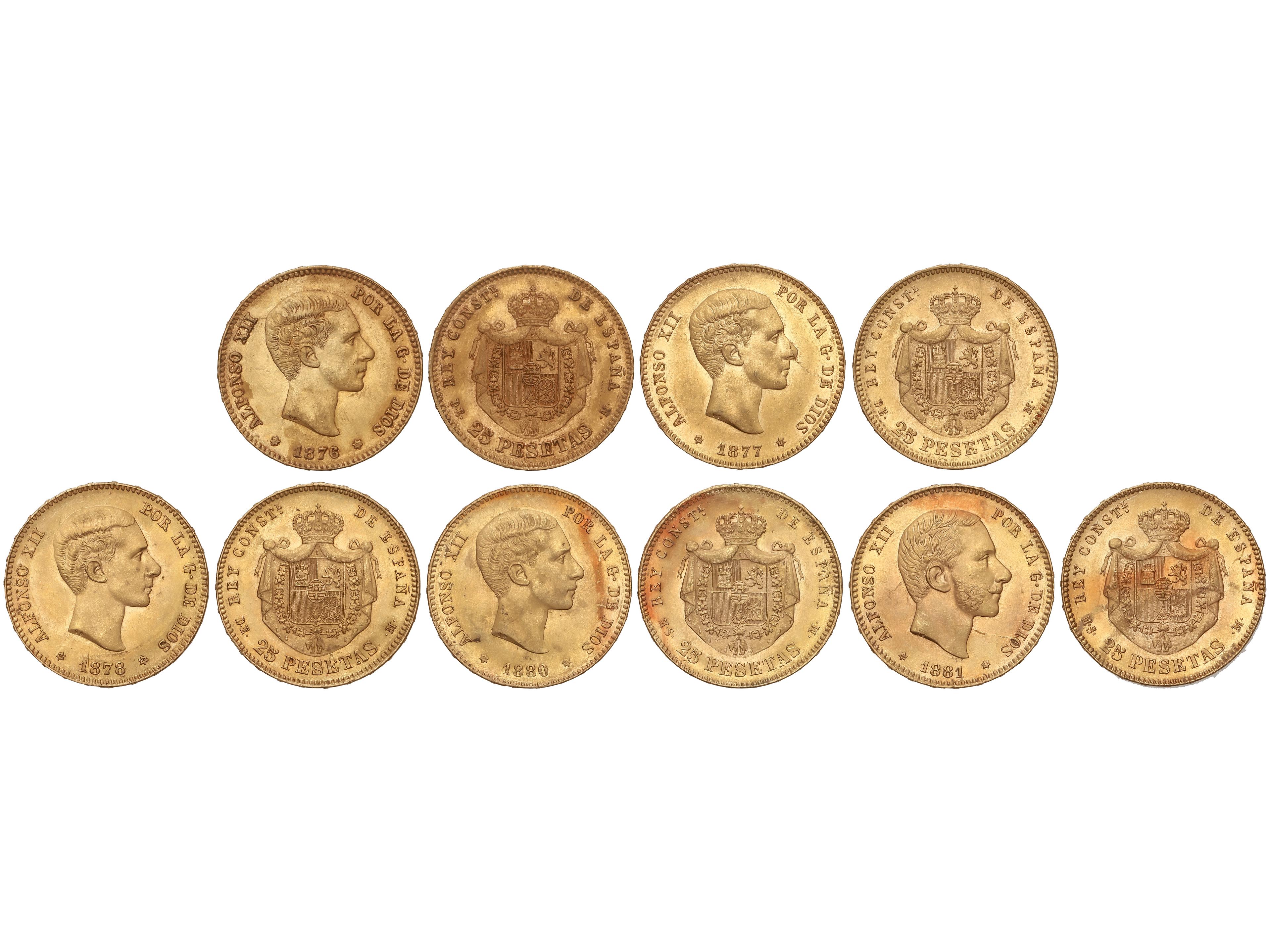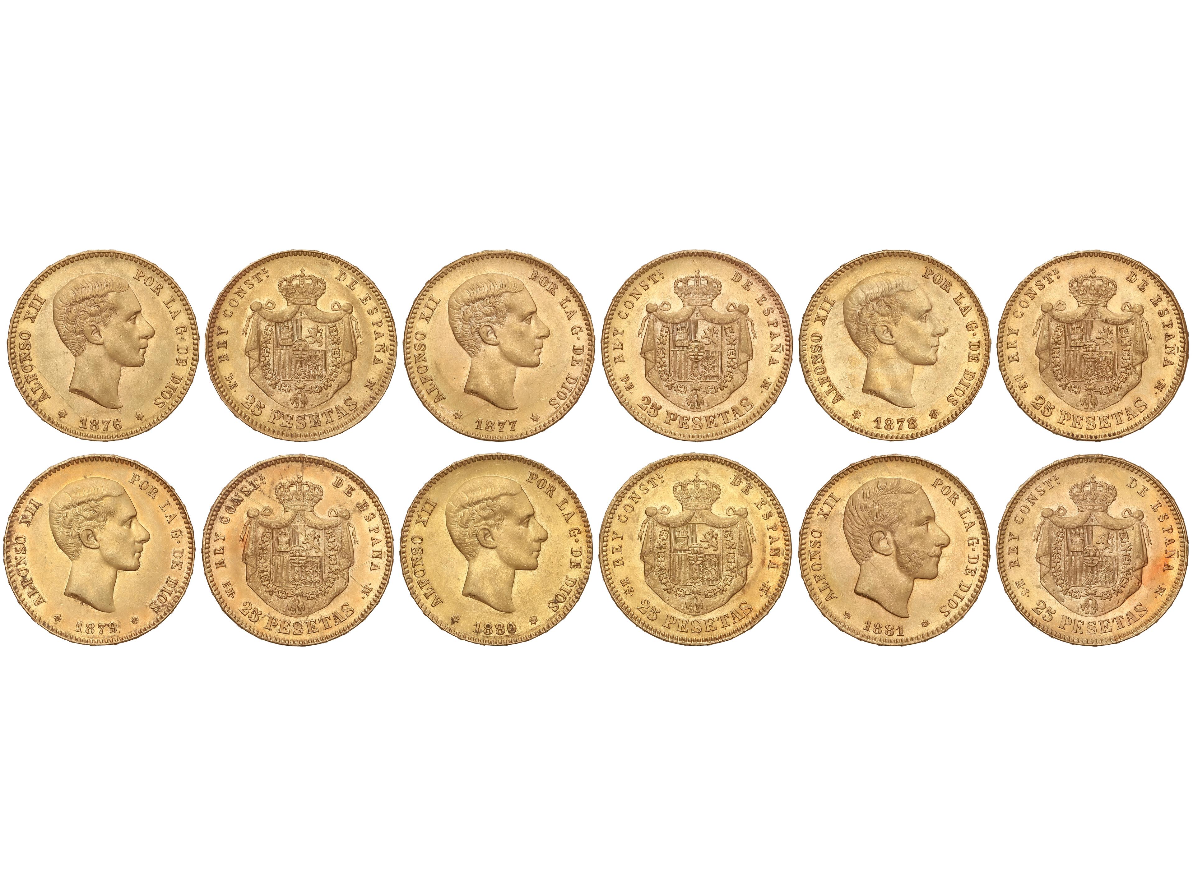 Lote 6 monedas 25 Pesetas. 1876 a 1881. Peso total de 48,38 grs. AU (900). Todas diferentes años. (Algunas con rayas y golpecitos). A EXAMINAR. EBC- a EBC+. (Image1)