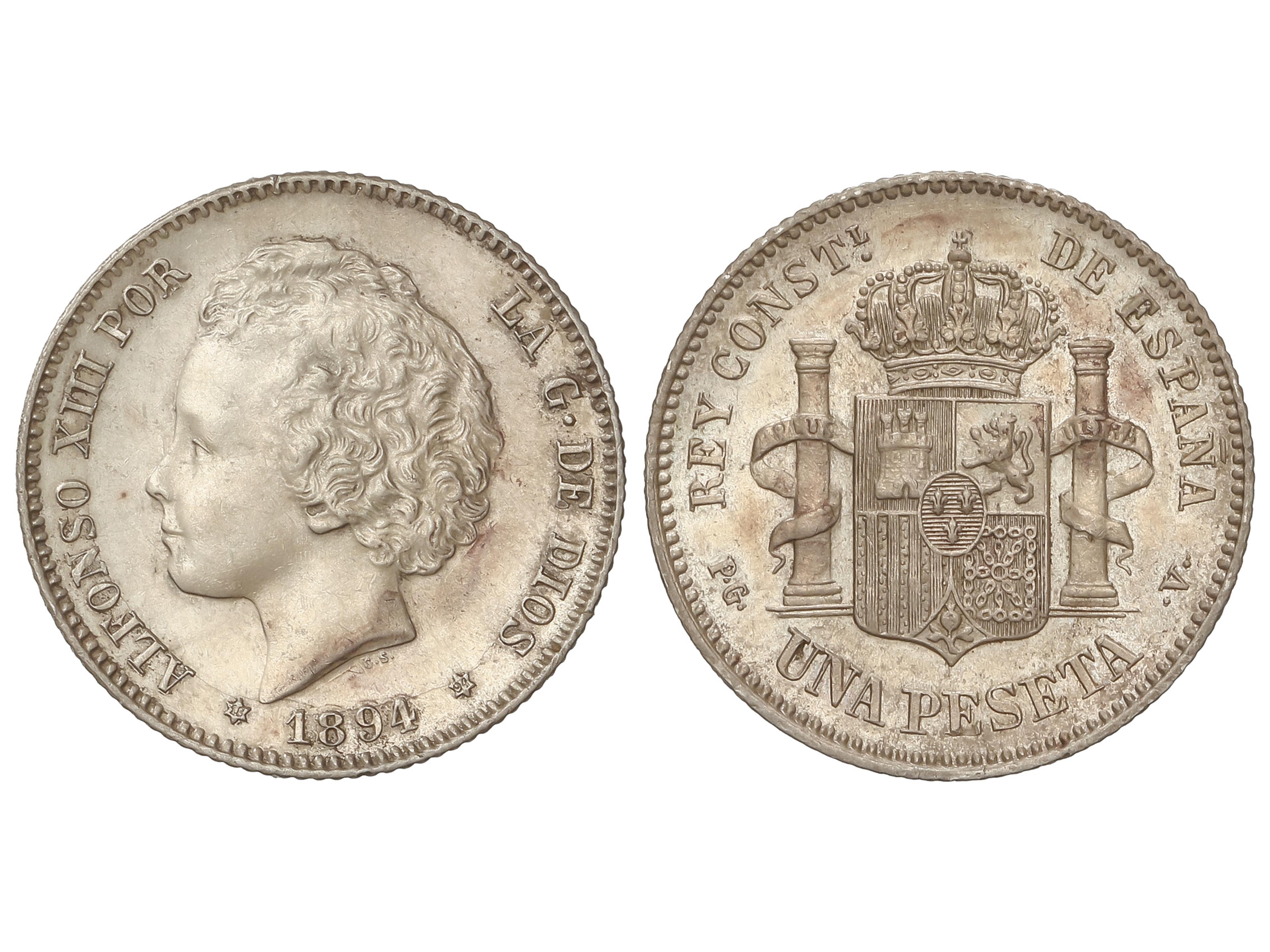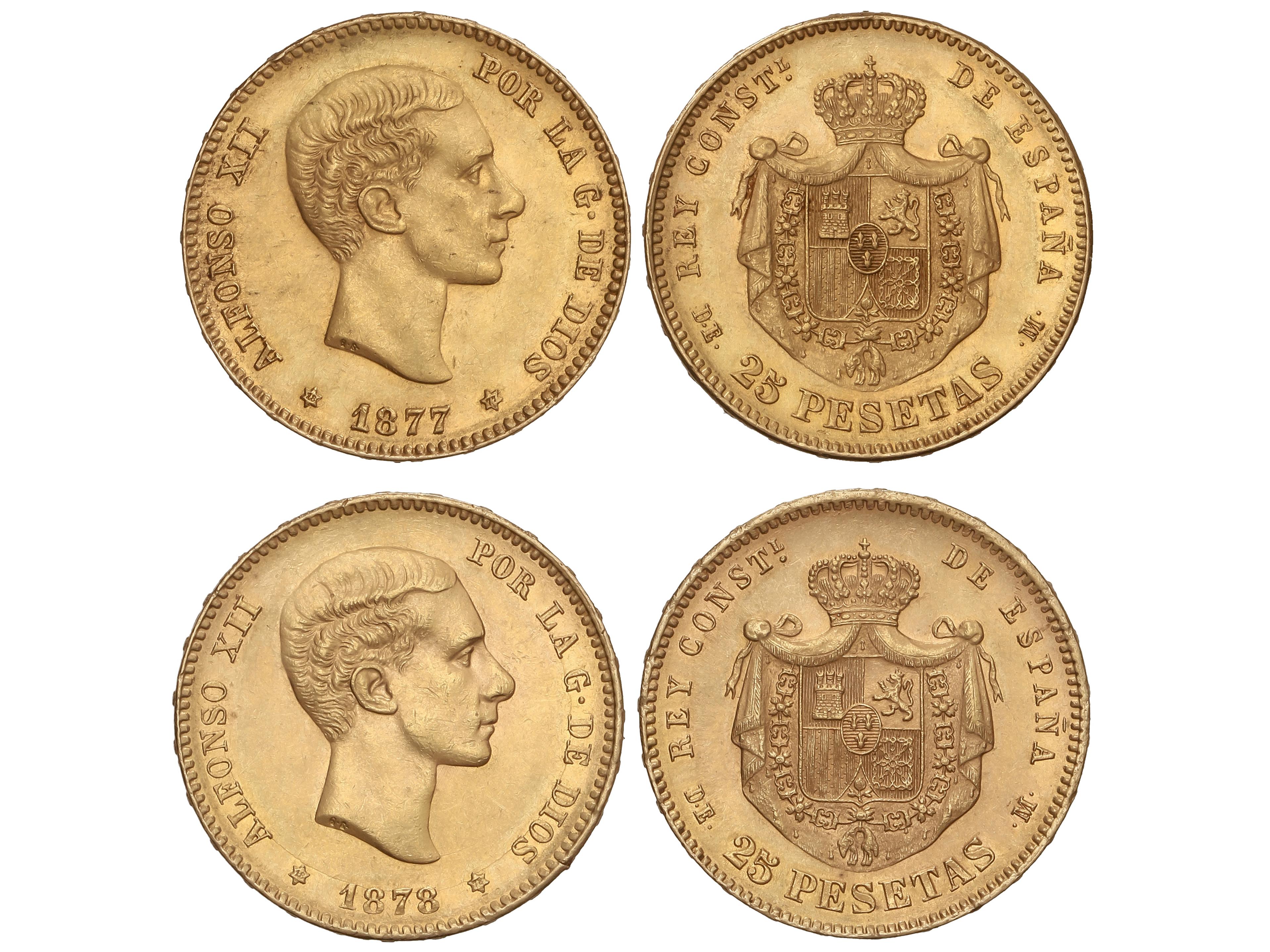 Lote 2 monedas 25 Pesetas. 1877 y 1878 (*77, 78). Peso total de 16,1 grs. AU (900). AC-68, 70. EBC-. (Image1)