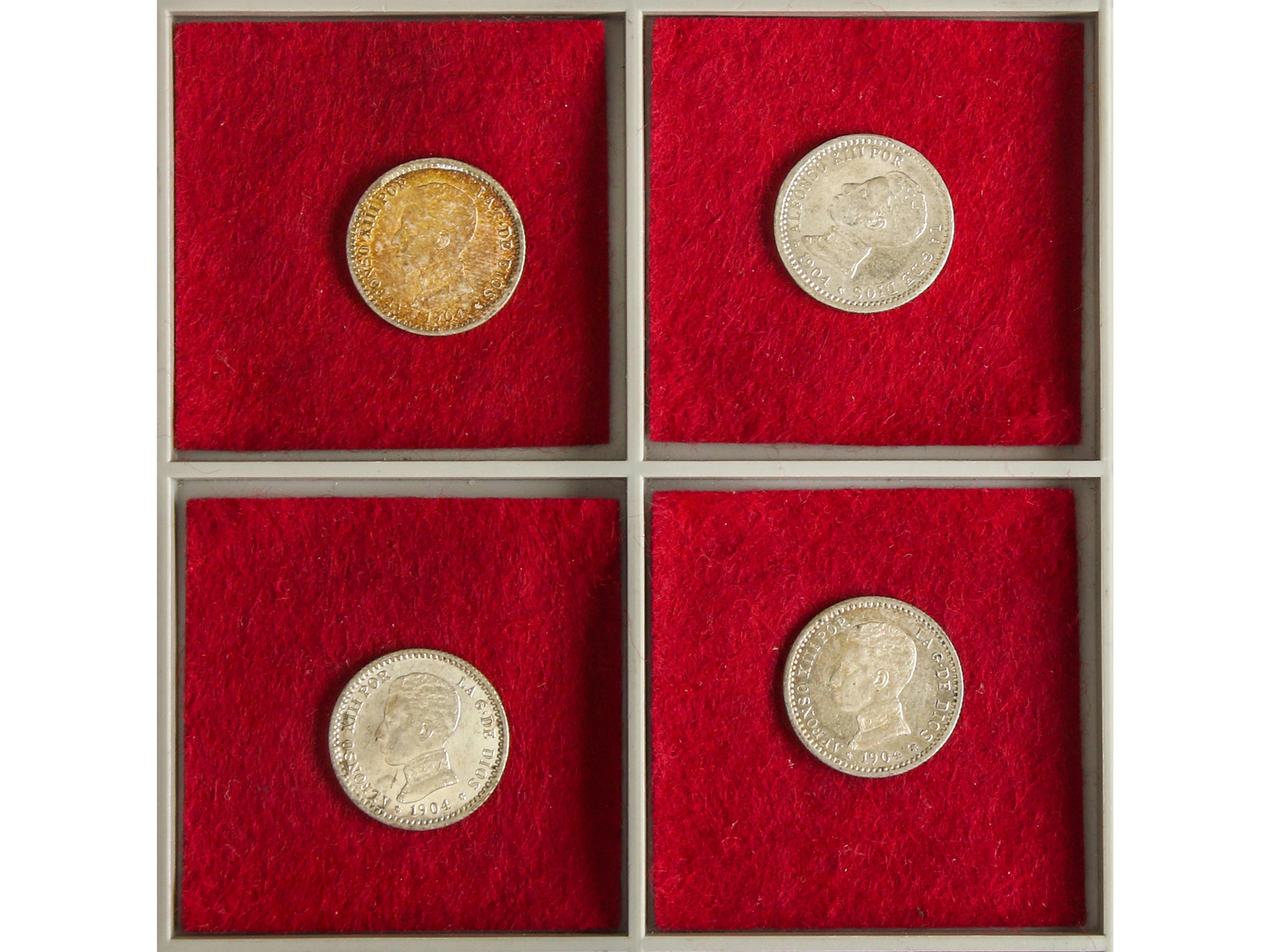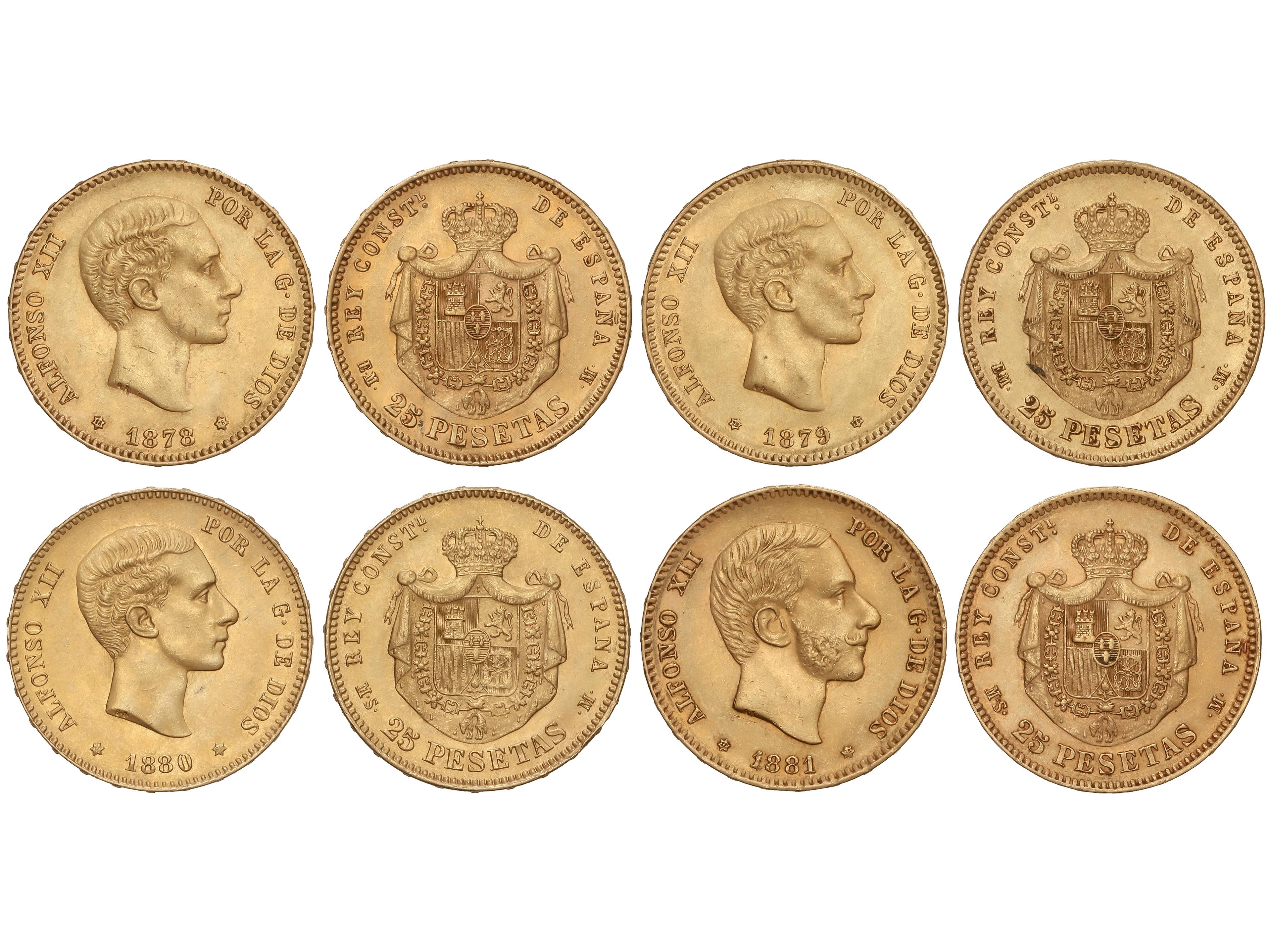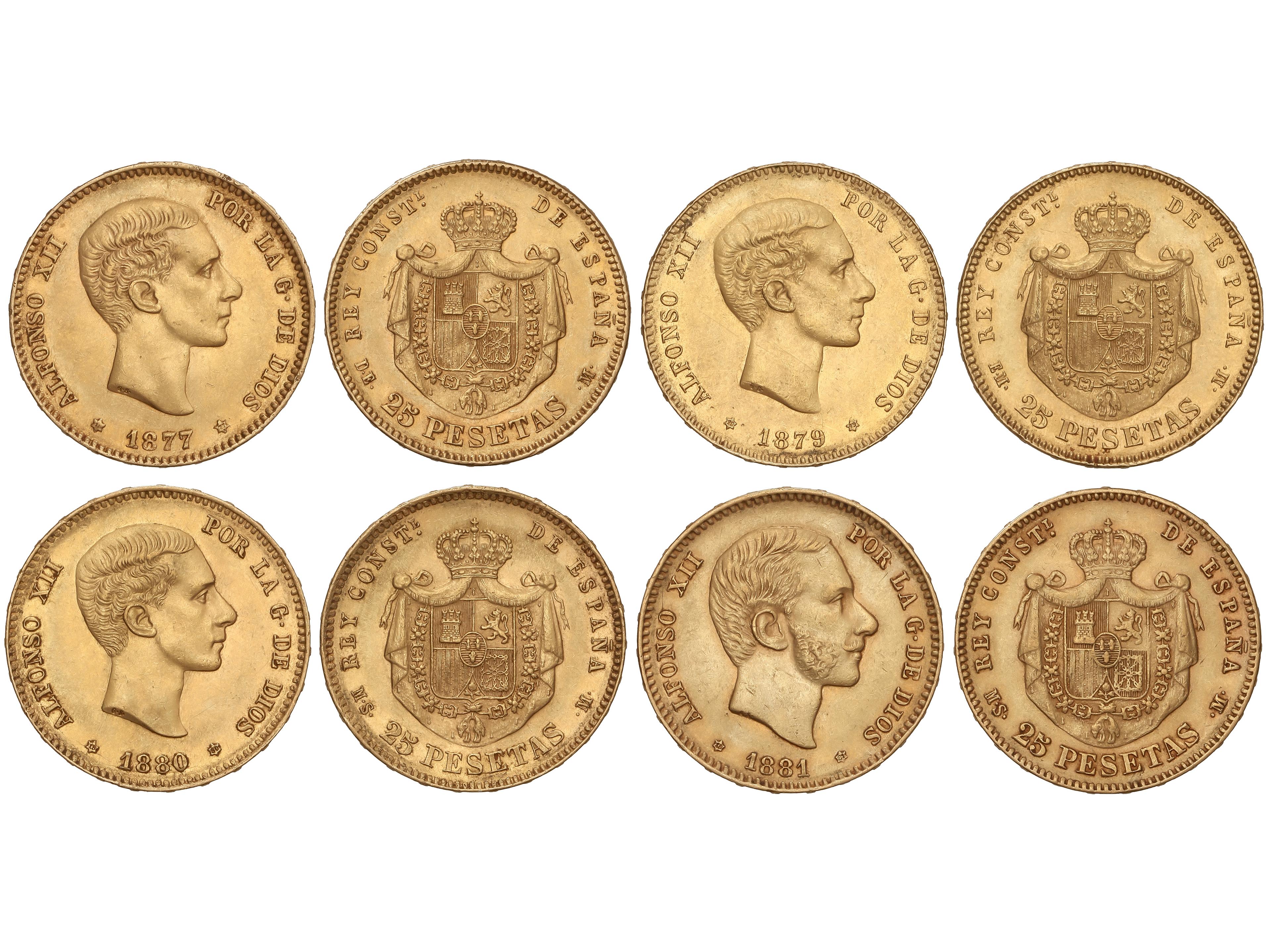 Lote 4 monedas 25 Pesetas. 1877, 1879, 1880 y 1881. Peso total de 32,15 grs. AU (900). AC-68, 74, 79, 82. MBC+ a EBC-. (Image1)