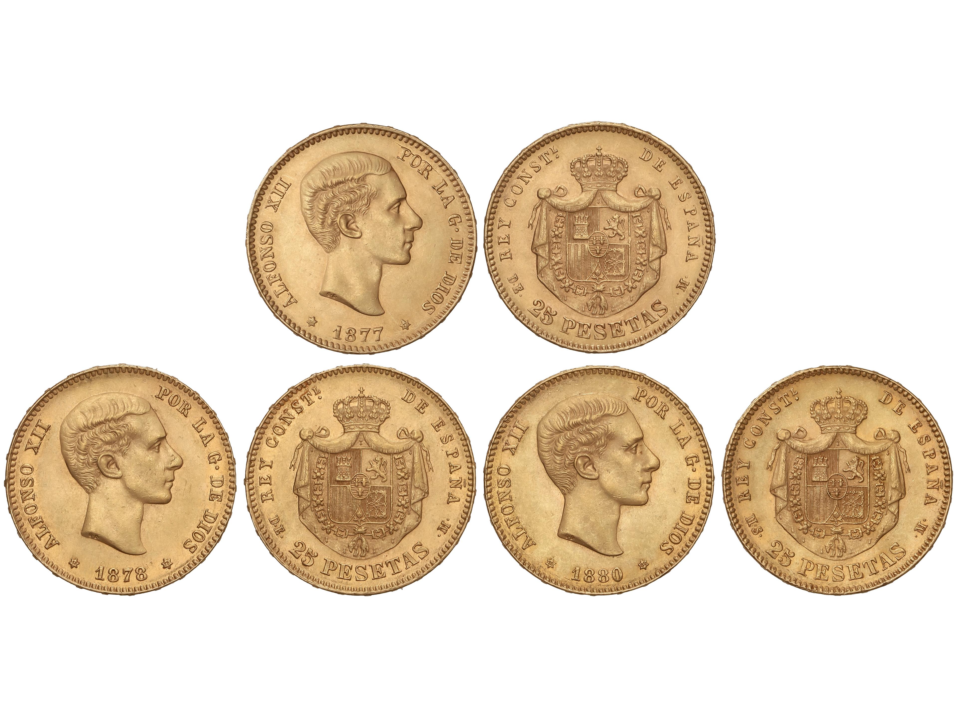 Lote 3 monedas 25 Pesetas. 1877, 1878 y 1880. Peso total de 24,15 grs. AU (900). AC-68, 70, 79. EBC-. (Image1)