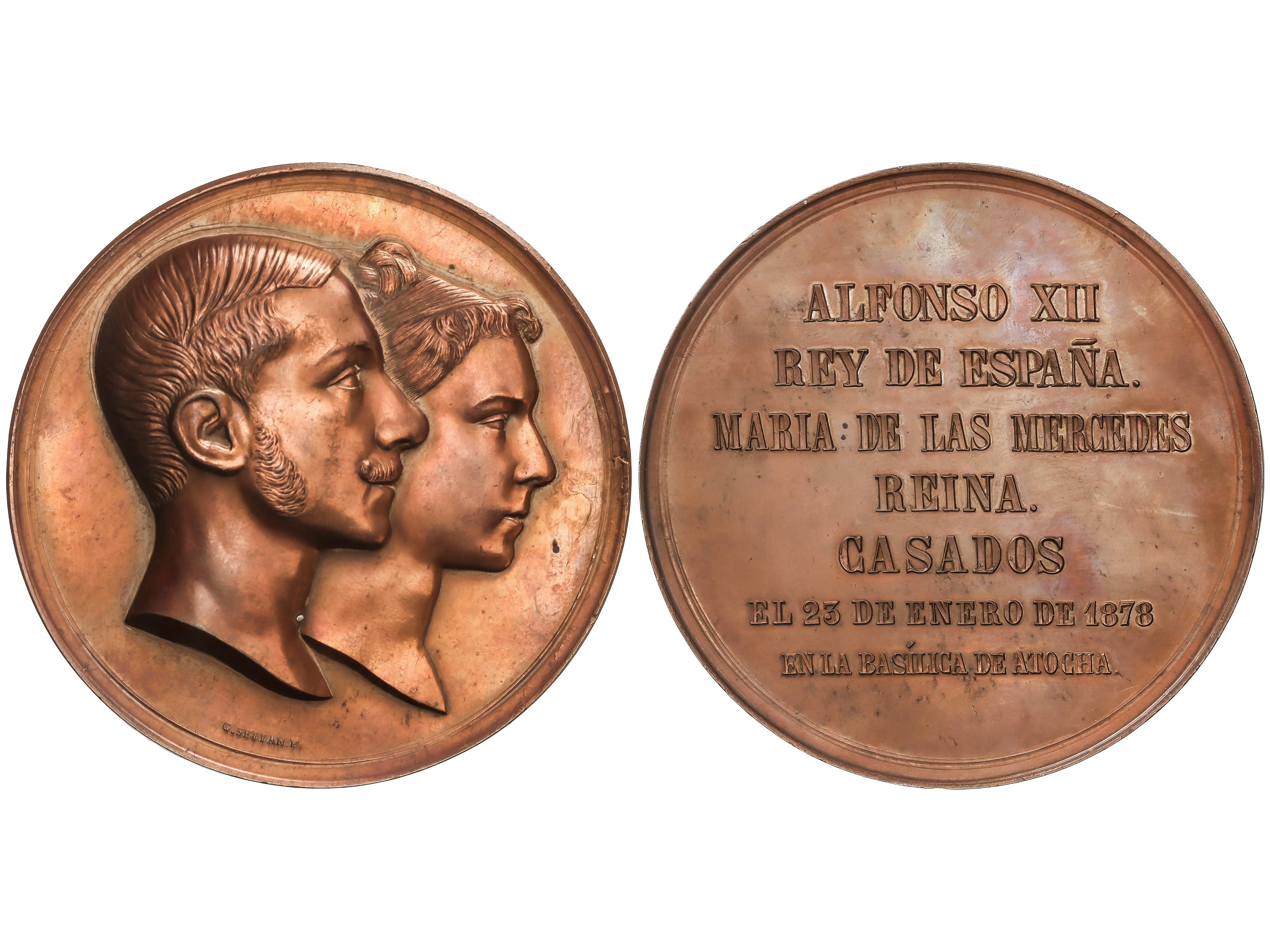 Matrimonio del rey con Doña María de las Mercedes. 1878. MADRID. Br. Ø 71 mm. RAH-680, VQ-14394, V-476. EBC. (Image1)