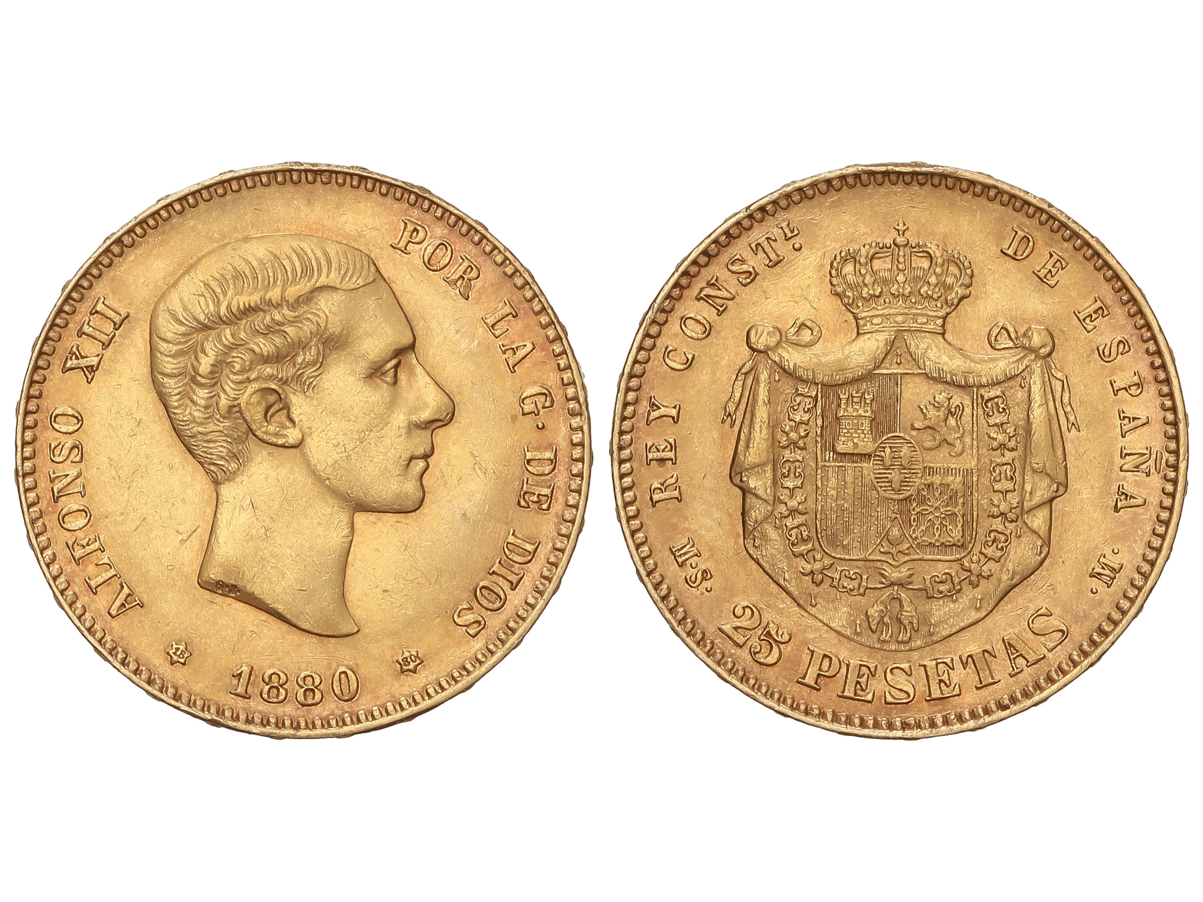 25 Pesetas. 1880 (*18-80). M.S.-M. 8,03 grs. AU (900). AC-79. MBC+. (Image1)