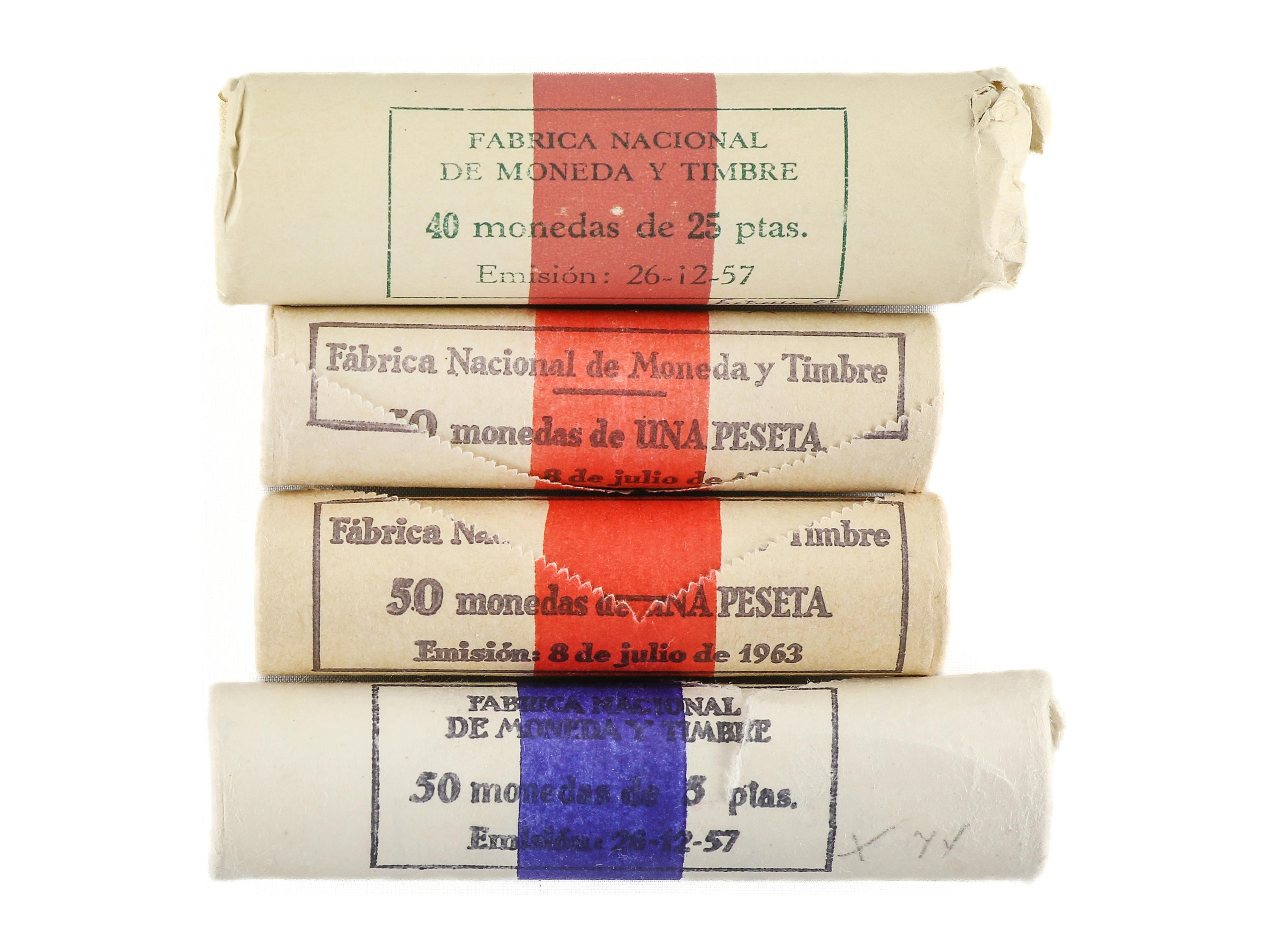 Lote 190 monedas 1 (100), 5 (50) y 25 Pesetas (40). 1957 y 1966. En cuatro cartuchos originales F.N.M.T.: 2x 1 Peseta 1966 (*19-75), 1x 5 Pesetas 1957 (*74) y 1x 25 Pesetas 1957 (*65). (Abiertos, algo rotos). SC. (Image1)