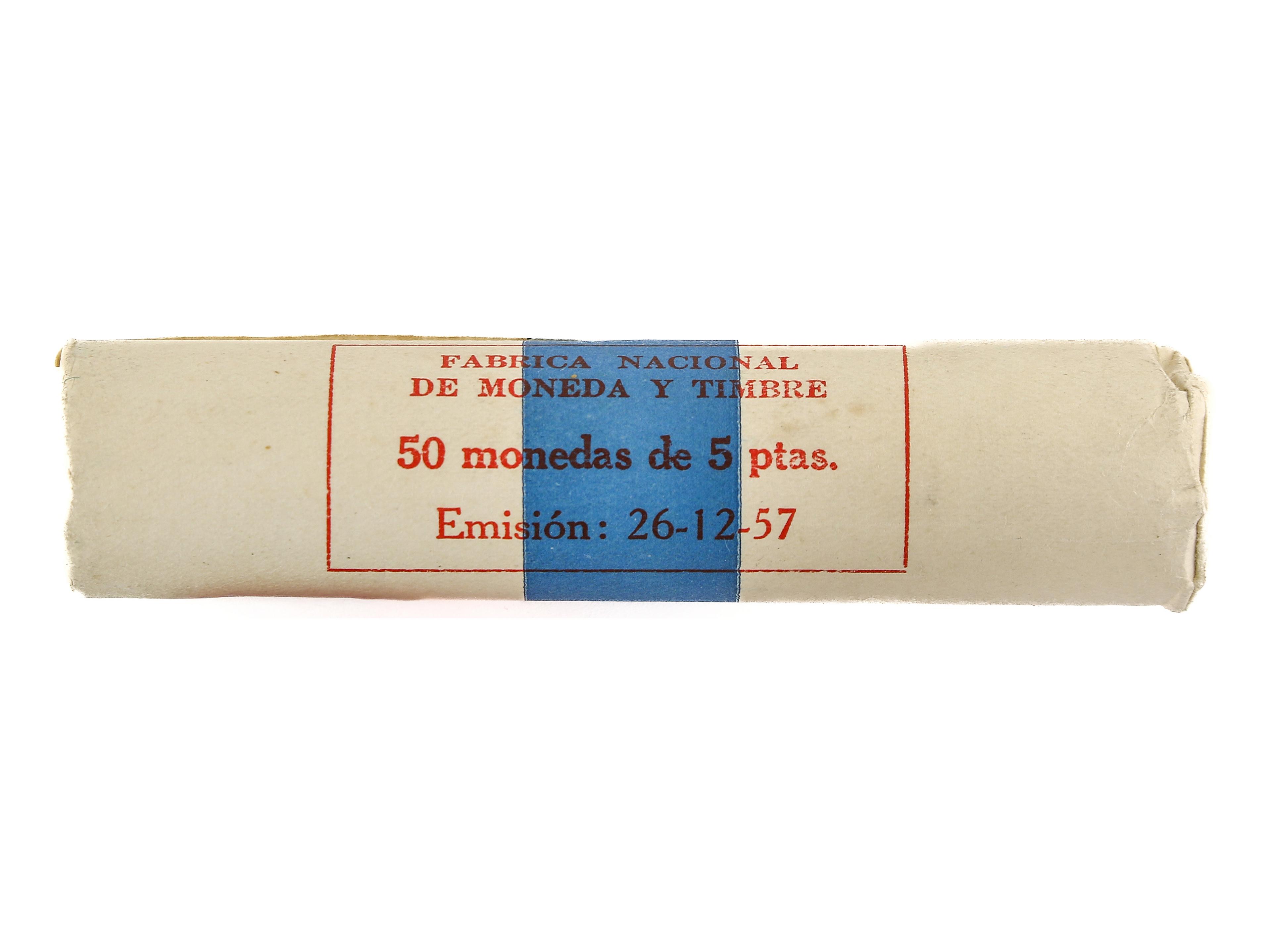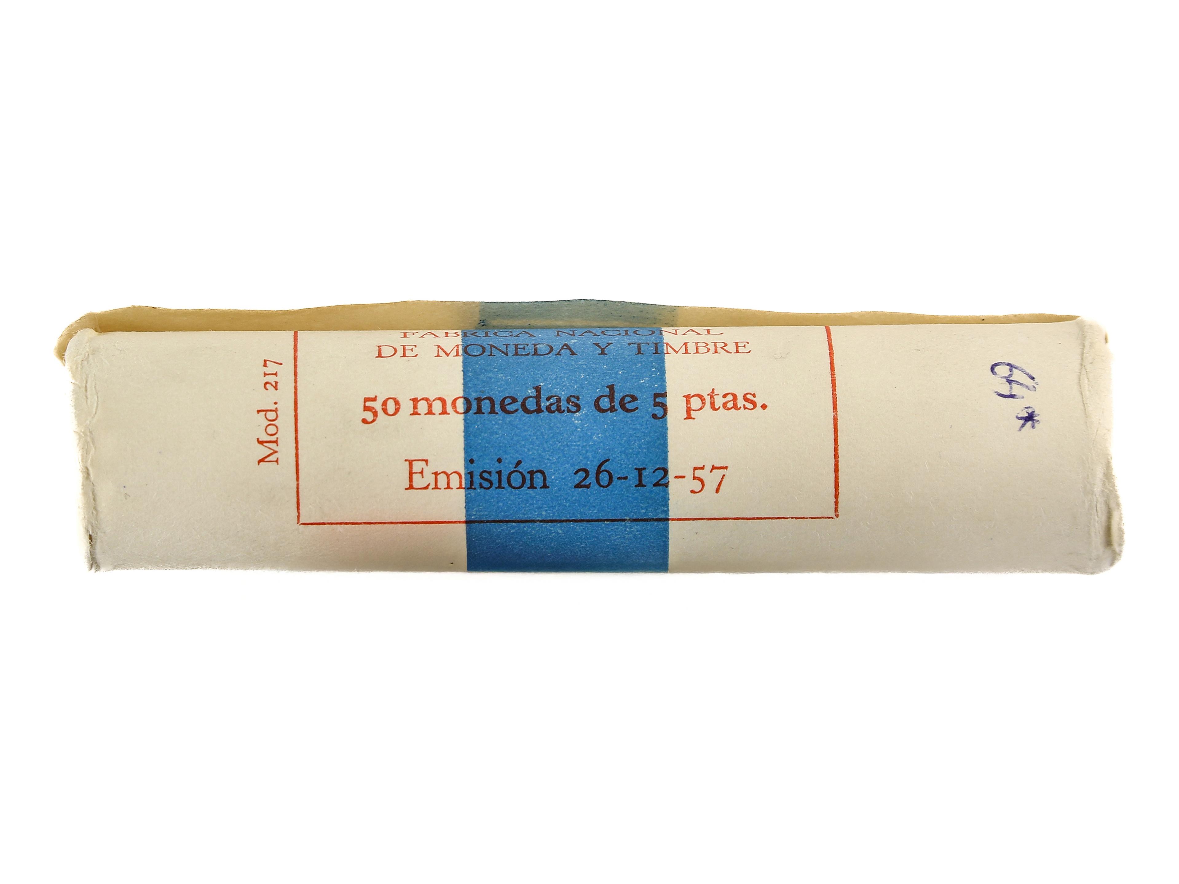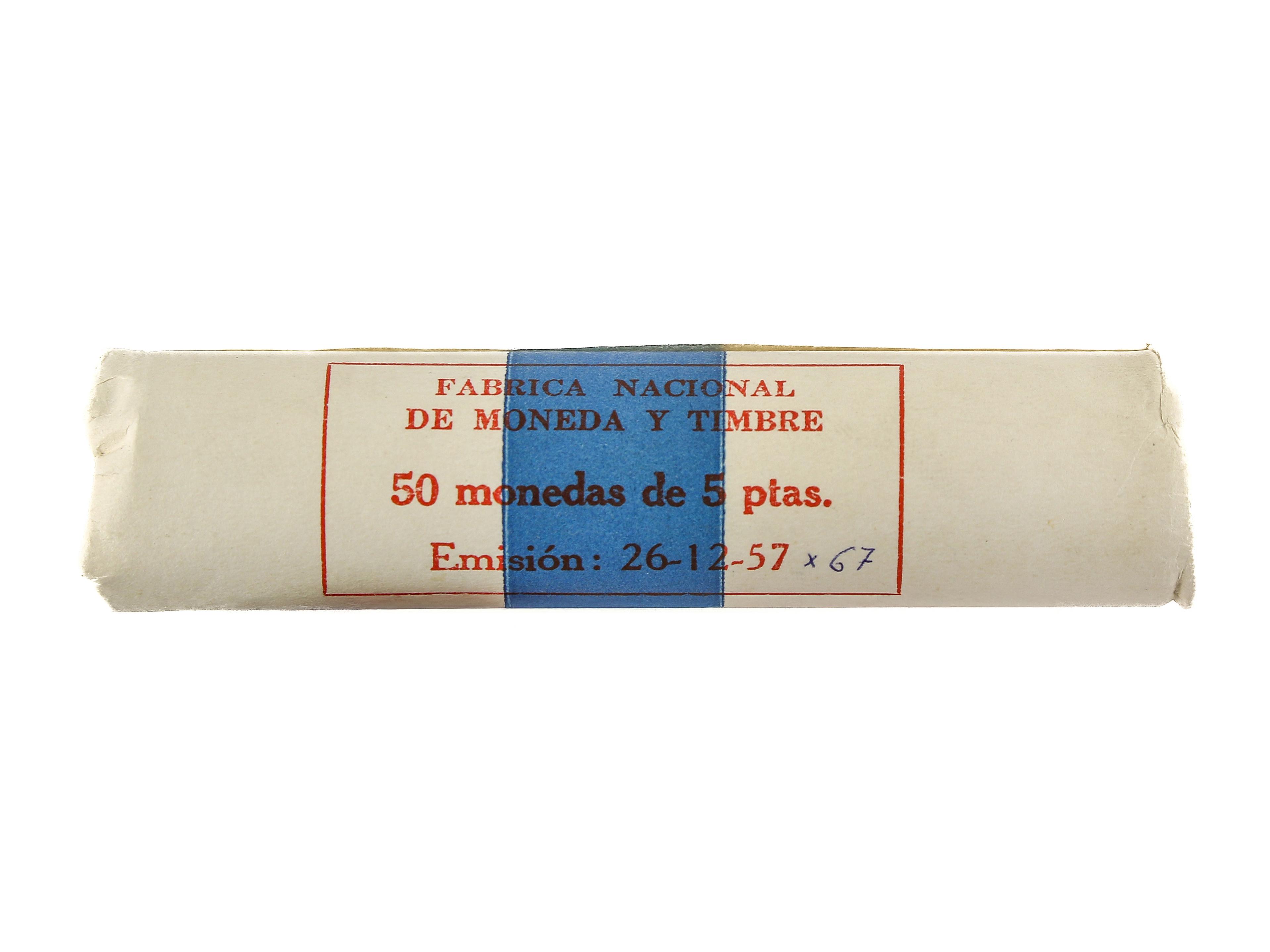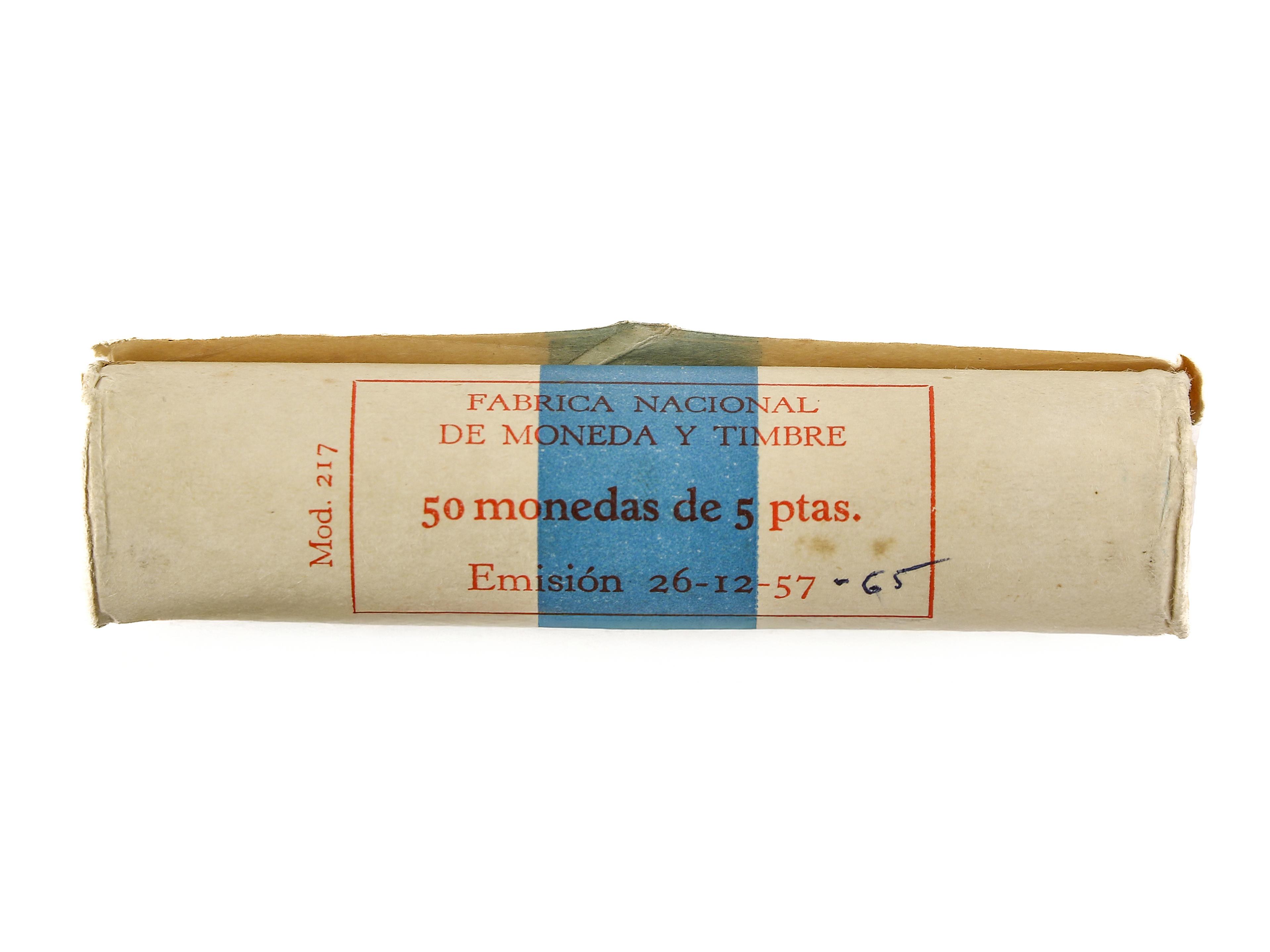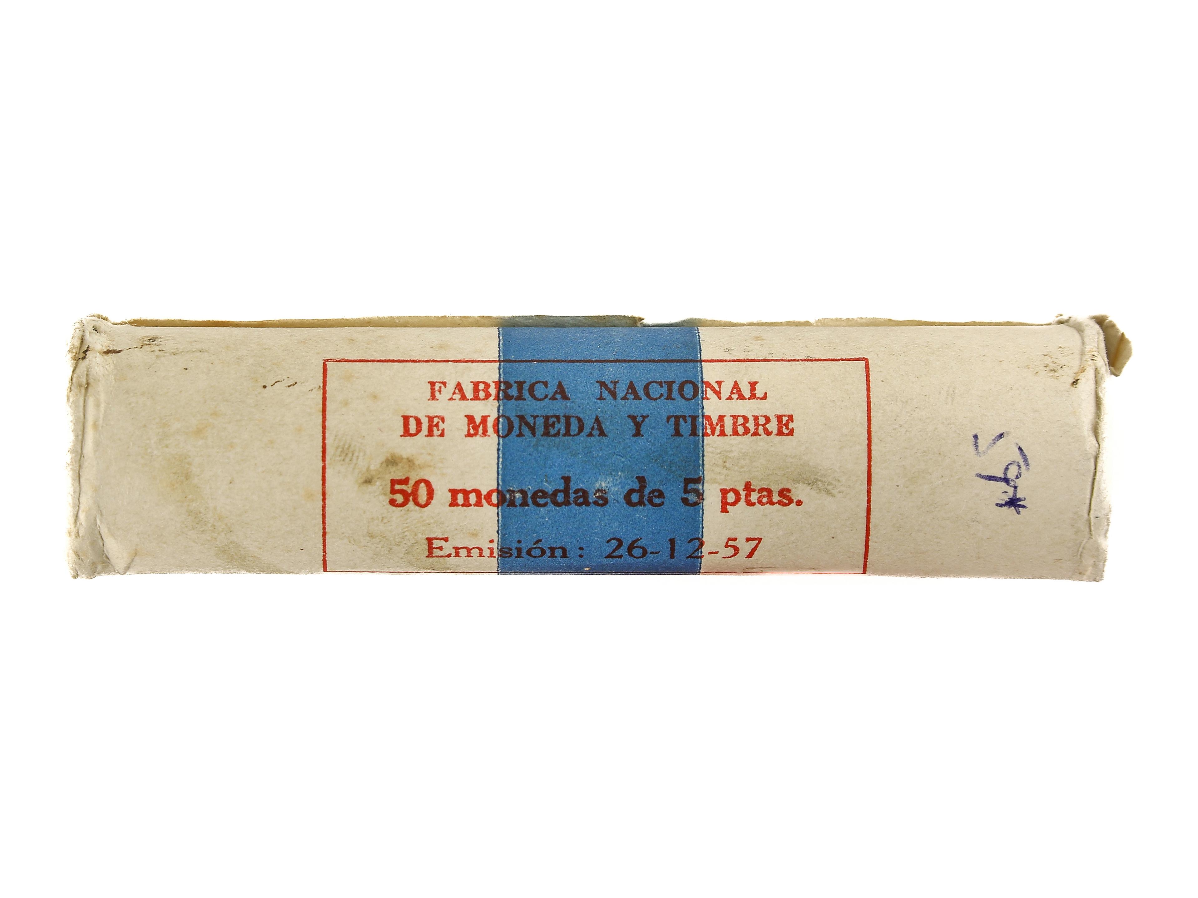 Lote 50 monedas 5 Pesetas. 1957 (*64). En cartucho original F.N.M.T. (Abierto). SC. (Image1)