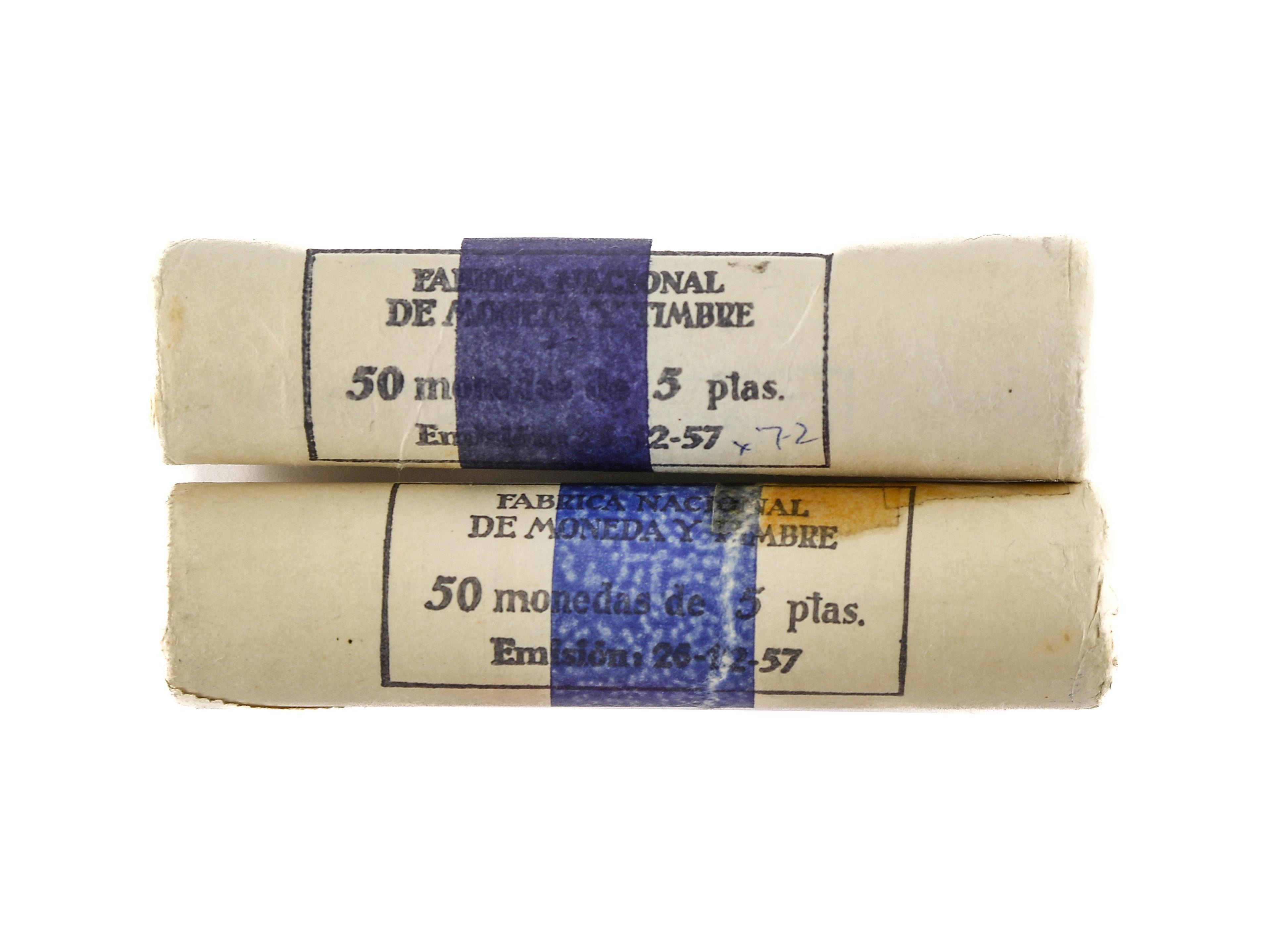 Lote 100 monedas 5 Pesetas. 1957 (*72 y *73). En dos cartuchos originales F.N.M.T. (Abierto). SC. (Image1)