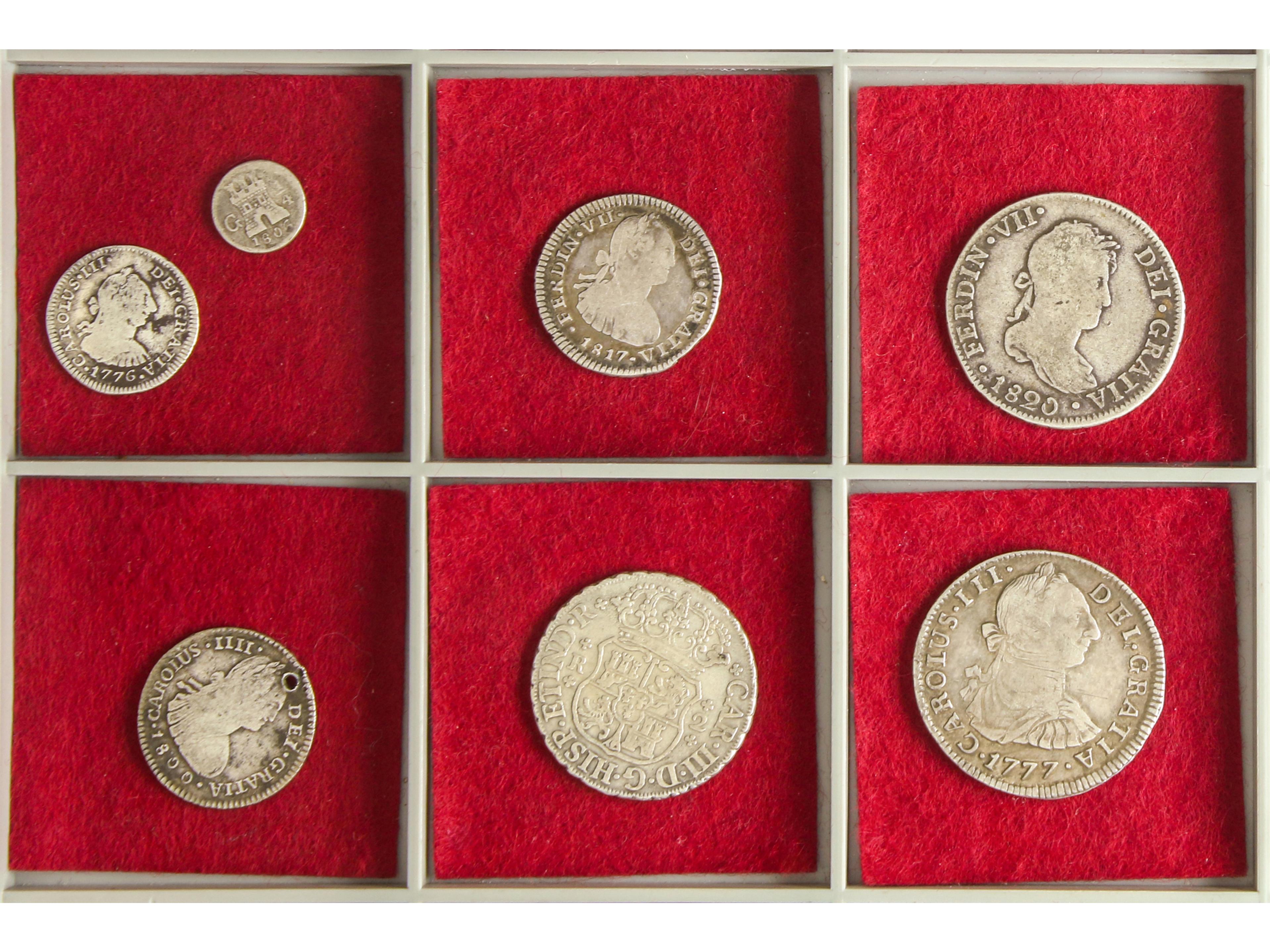 Lote 7 monedas 1/4, 1/2, 1 (2) y 2 Reales (3). 1760 a 1820. CARLOS III, CARLOS IV y FERNANDO VII. GUATEMALA, LIMA, MÉXICO, POTOSÍ y SANTIAGO. AR. Algunas escasas. A EXAMINAR. BC a MBC. (Image1) (Image2)