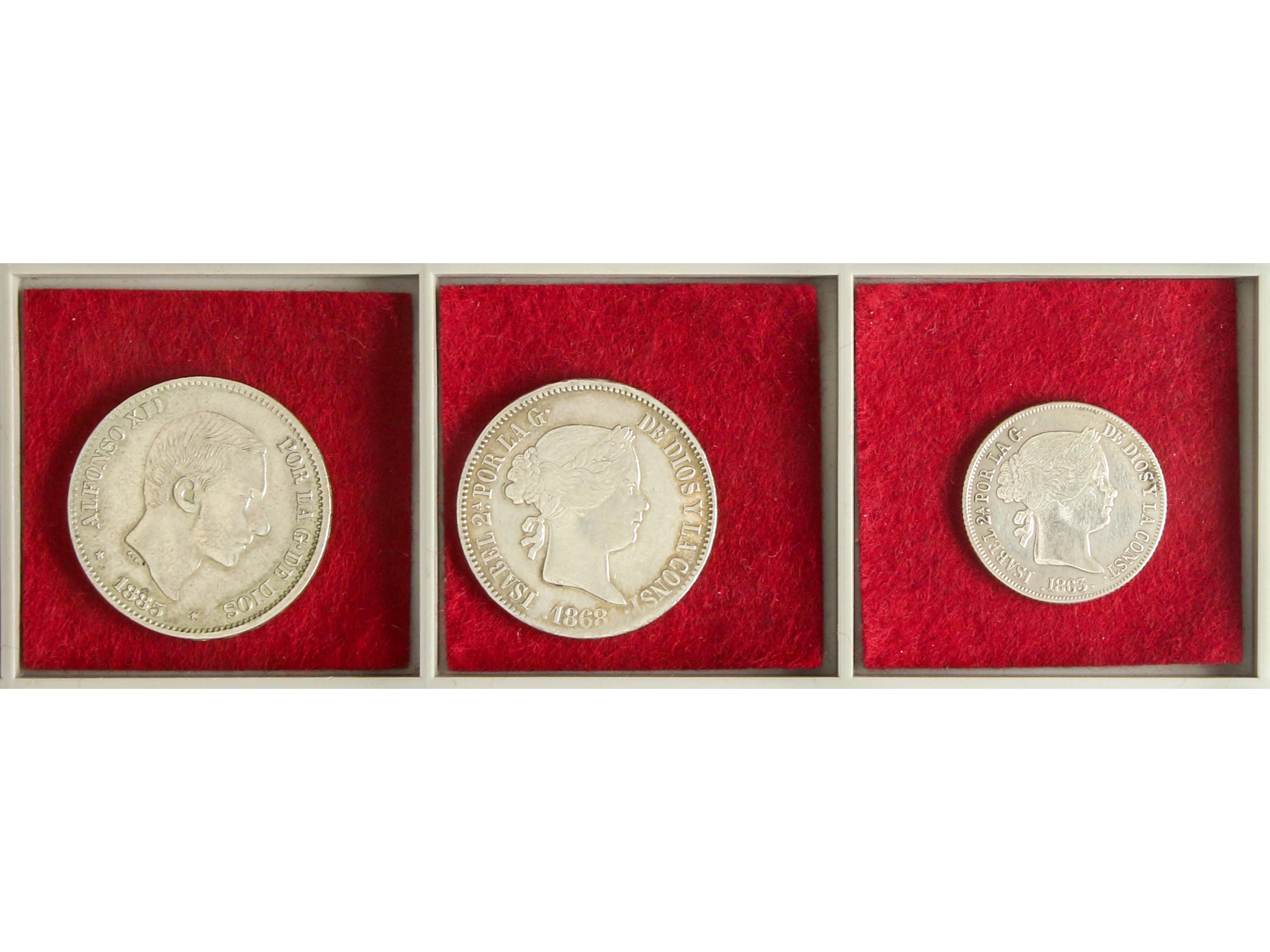 Lote 3 monedas. ISABEL II y ALFONSO XII. Isabel II: 4 Reales 1863 Sevilla y 50 centavos de peso 1868. Alfonso : 50 Centavos de Peso 1885. A EXAMINAR. MBC a EBC-. (Image1)