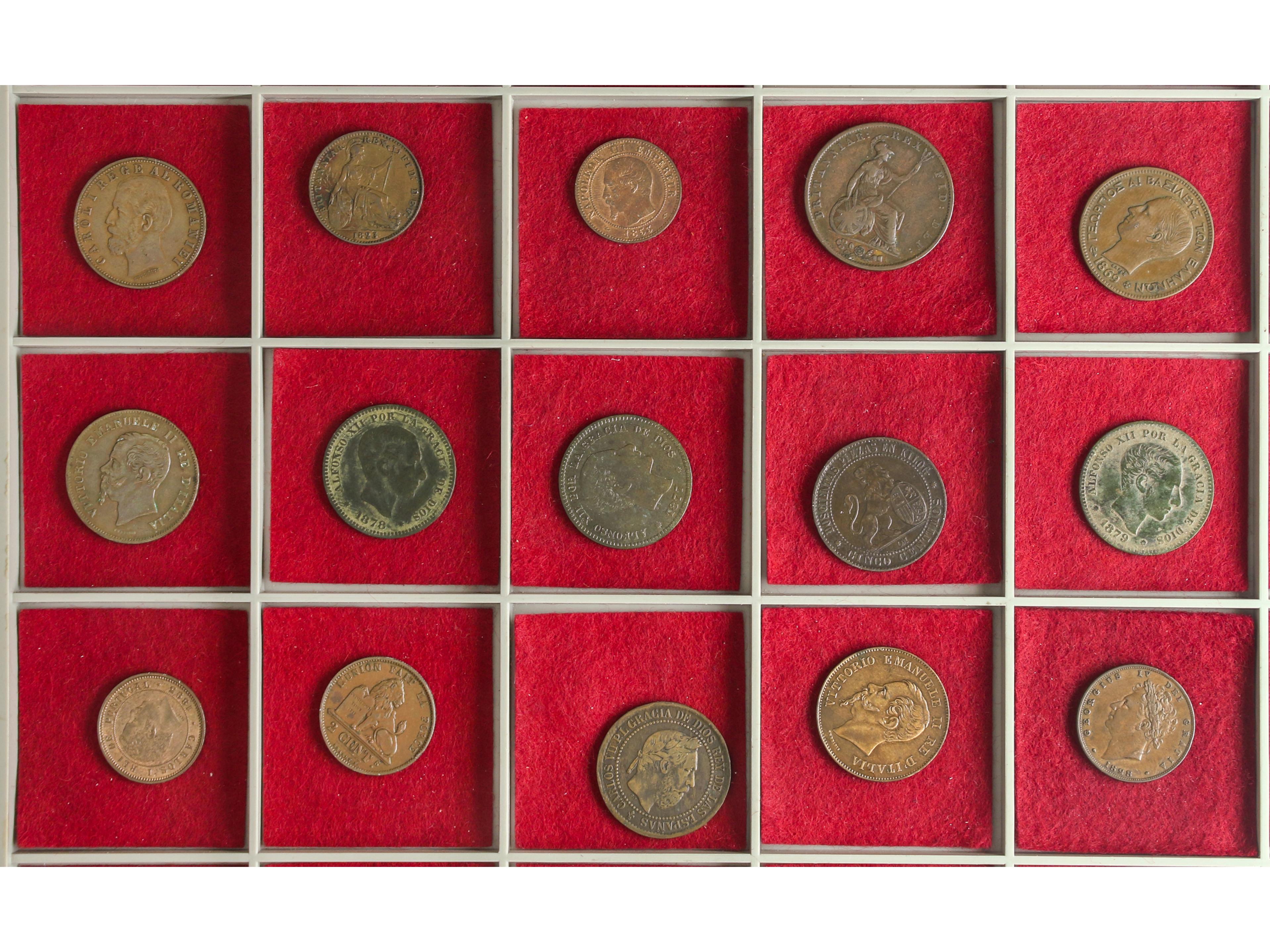 Lote 15 cobres. Siglo XIX-XX. CARLOS VII PRETENDIENTE, GOBIERNO PROVISIONAL y ALFONSO XII. Incluye 5 Céntimos 1870 Gobierno Provisional, 5 céntimos 1877, 1878 y 1879, 5 céntimos 1875 Carlos VII Pretendiente y algunos