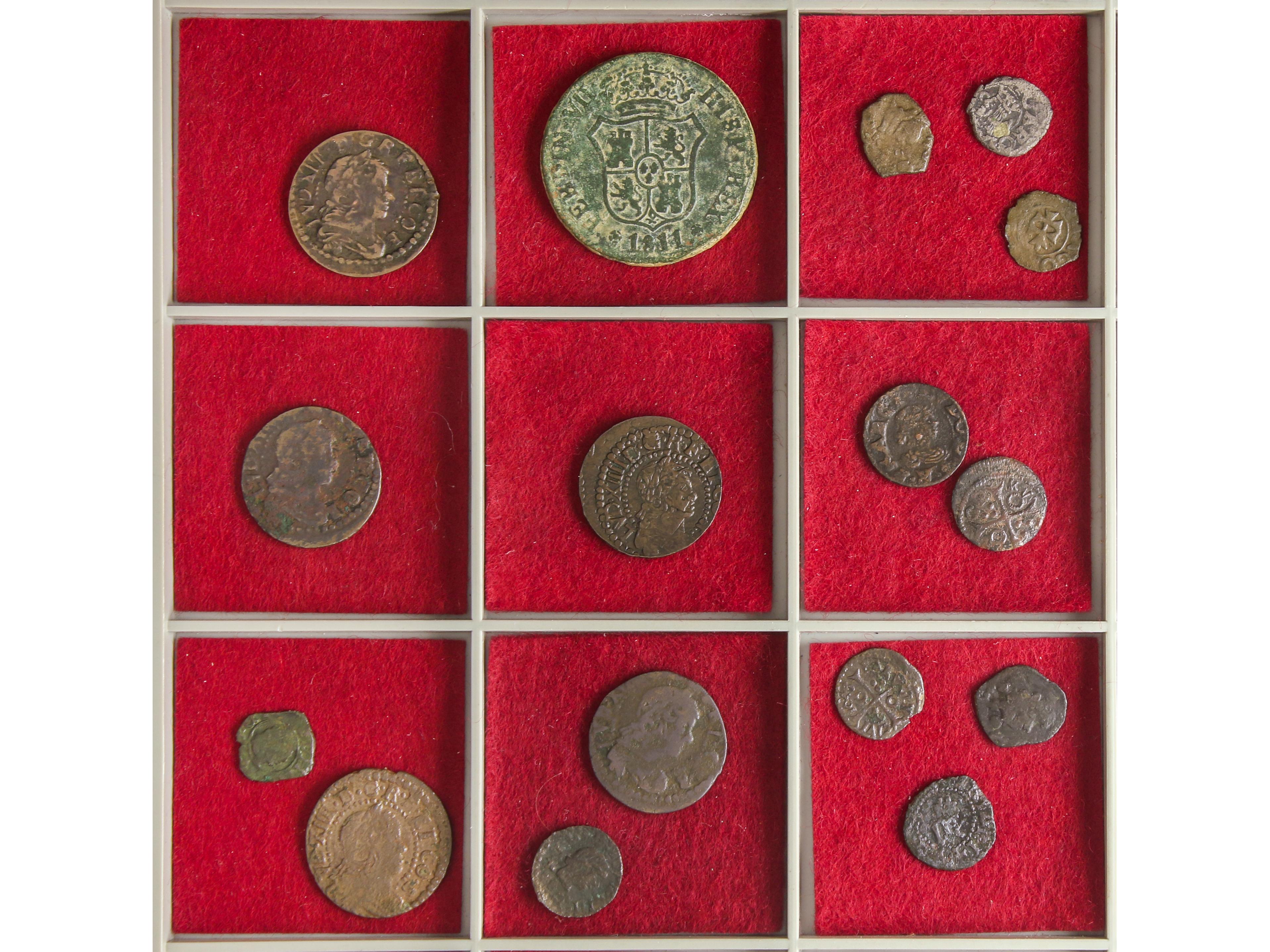 Lote 16 cobres. Incluye 7 dineros (tres de Aragón), (dos de Catalunya) y (dos de Valencia), 3 monedas 1 diner guerra dels segadors Barcelona y cervera uno con fecha 1642, 5 monedas Sisè ceca barcelona y 6 cuartos 1811 Fernando VII.