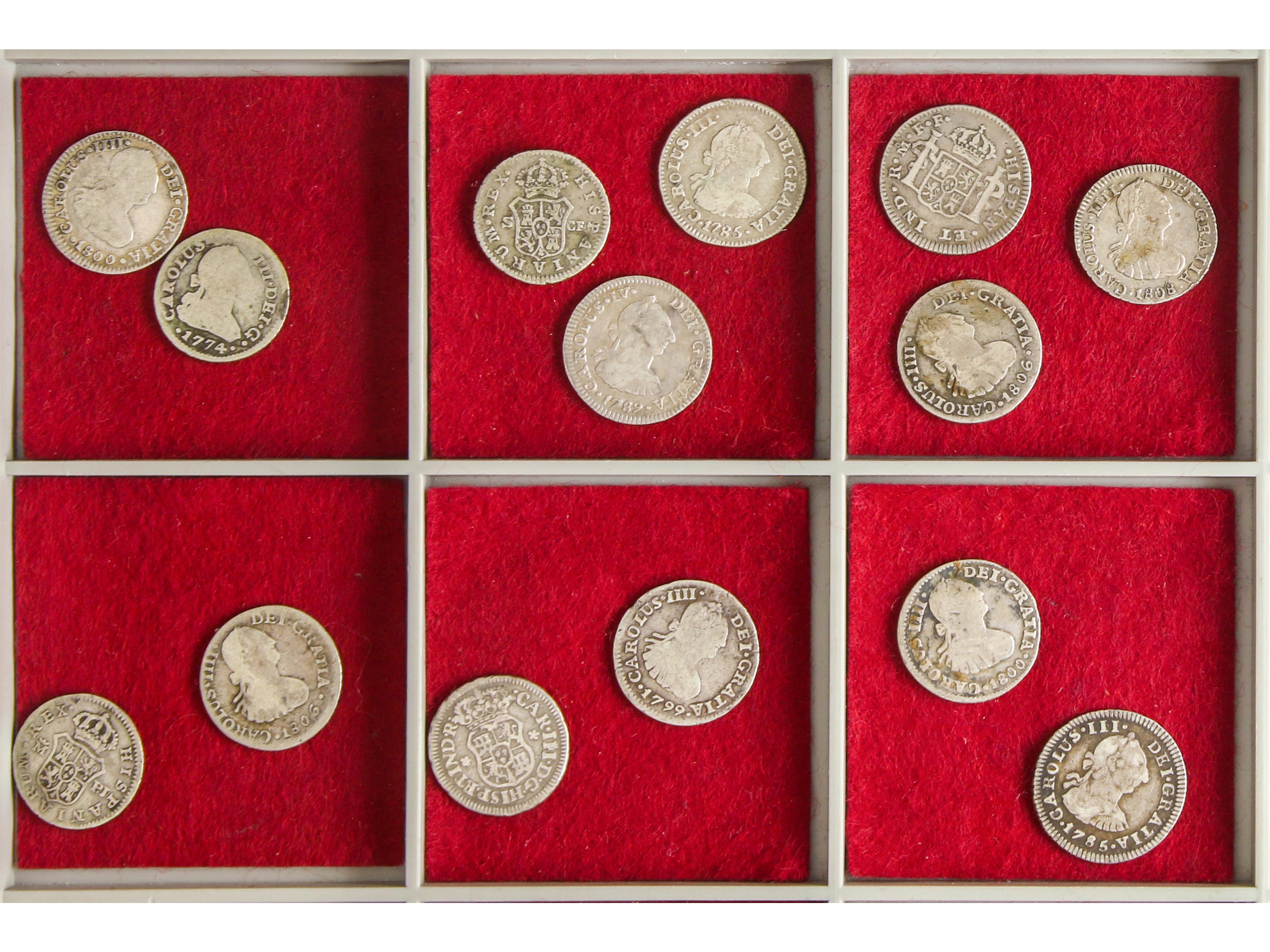 Lote 14 monedas 1/2 Real. 1762 a 1808. CARLOS III y CARLOS IV. Diferentes cecas: Madrid, México, Potosí, Sevilla. Tipo busto y una tipo columnario. A EXAMINAR. BC+ a MBC-. (Image1)