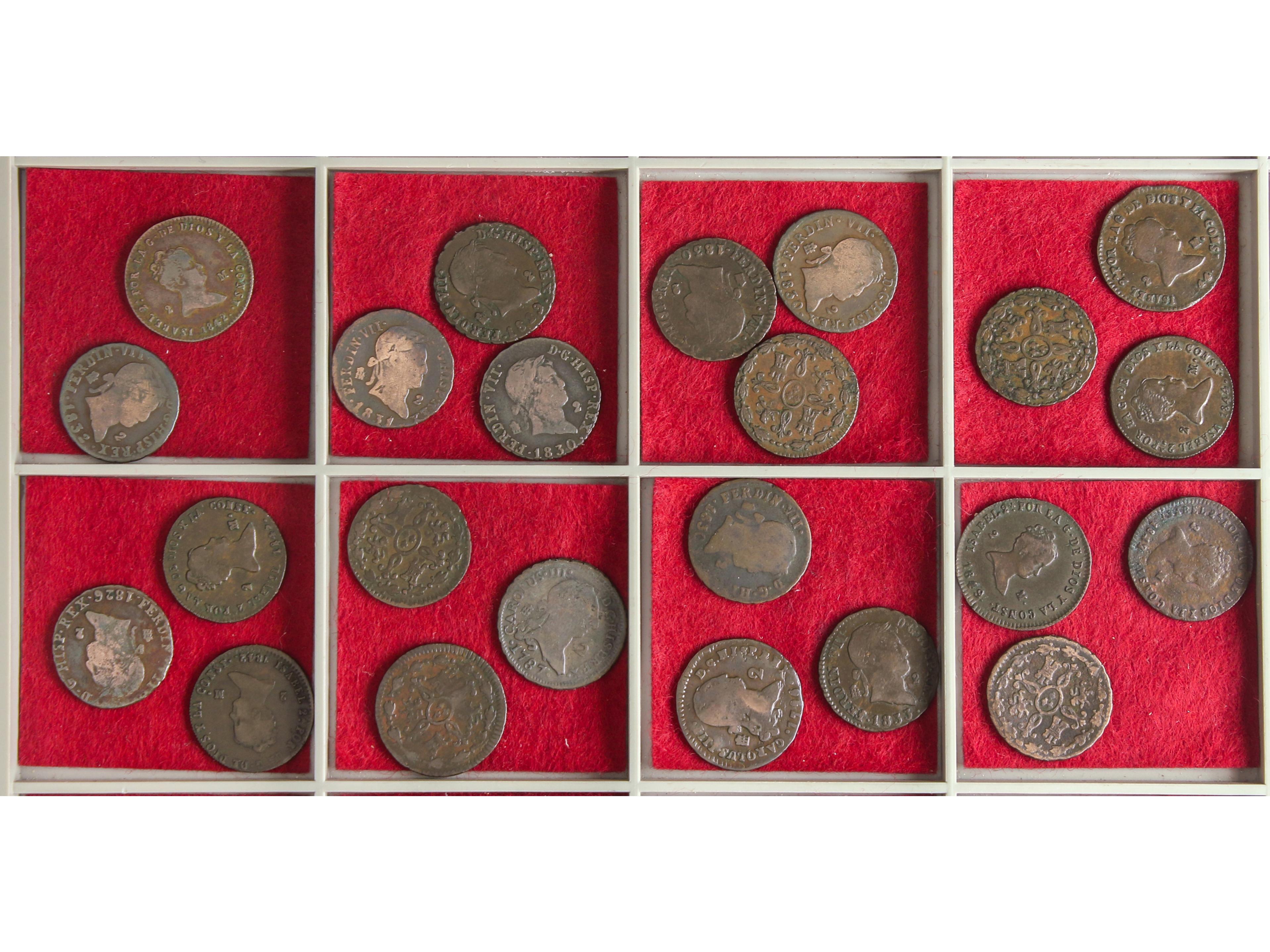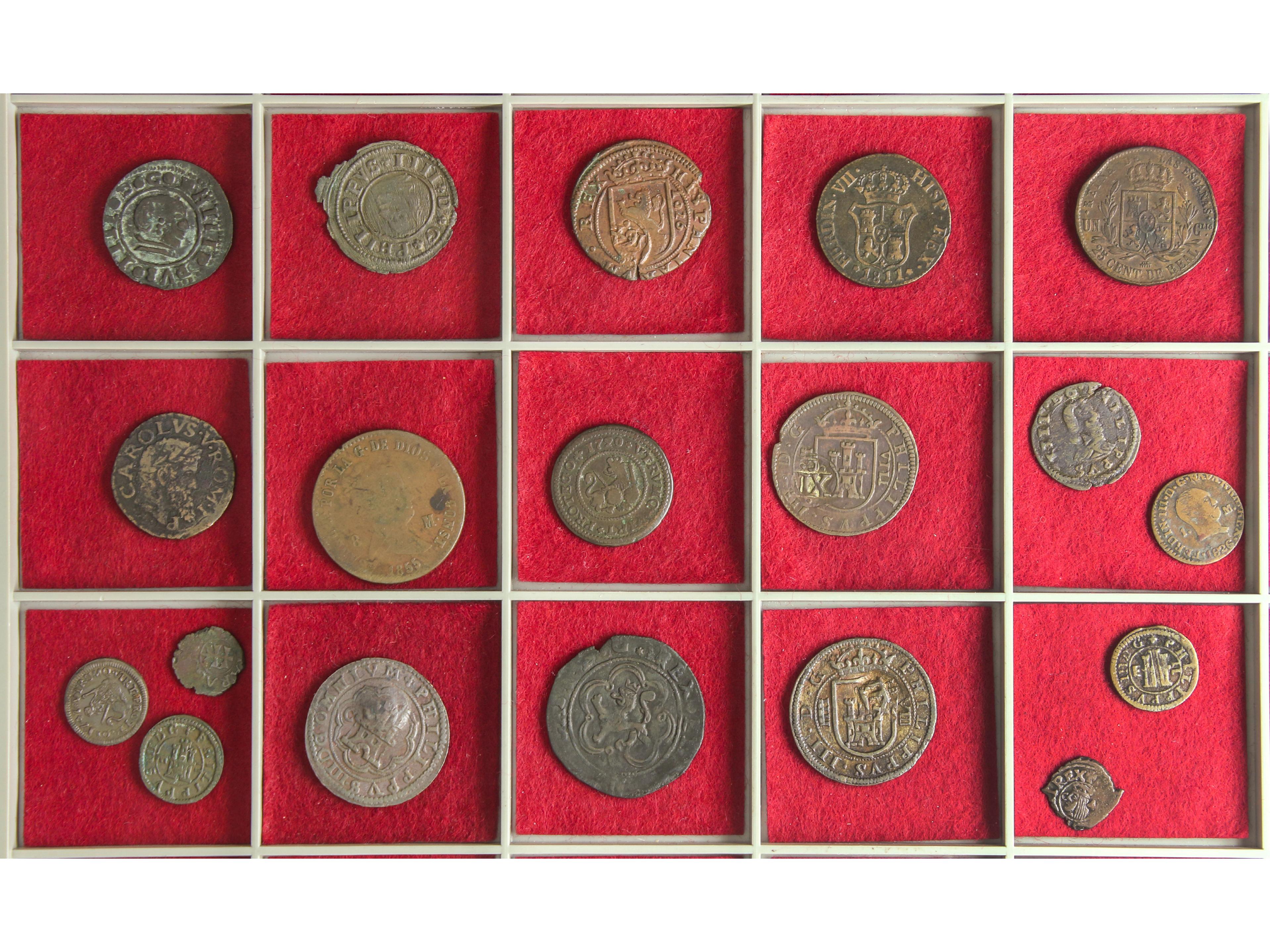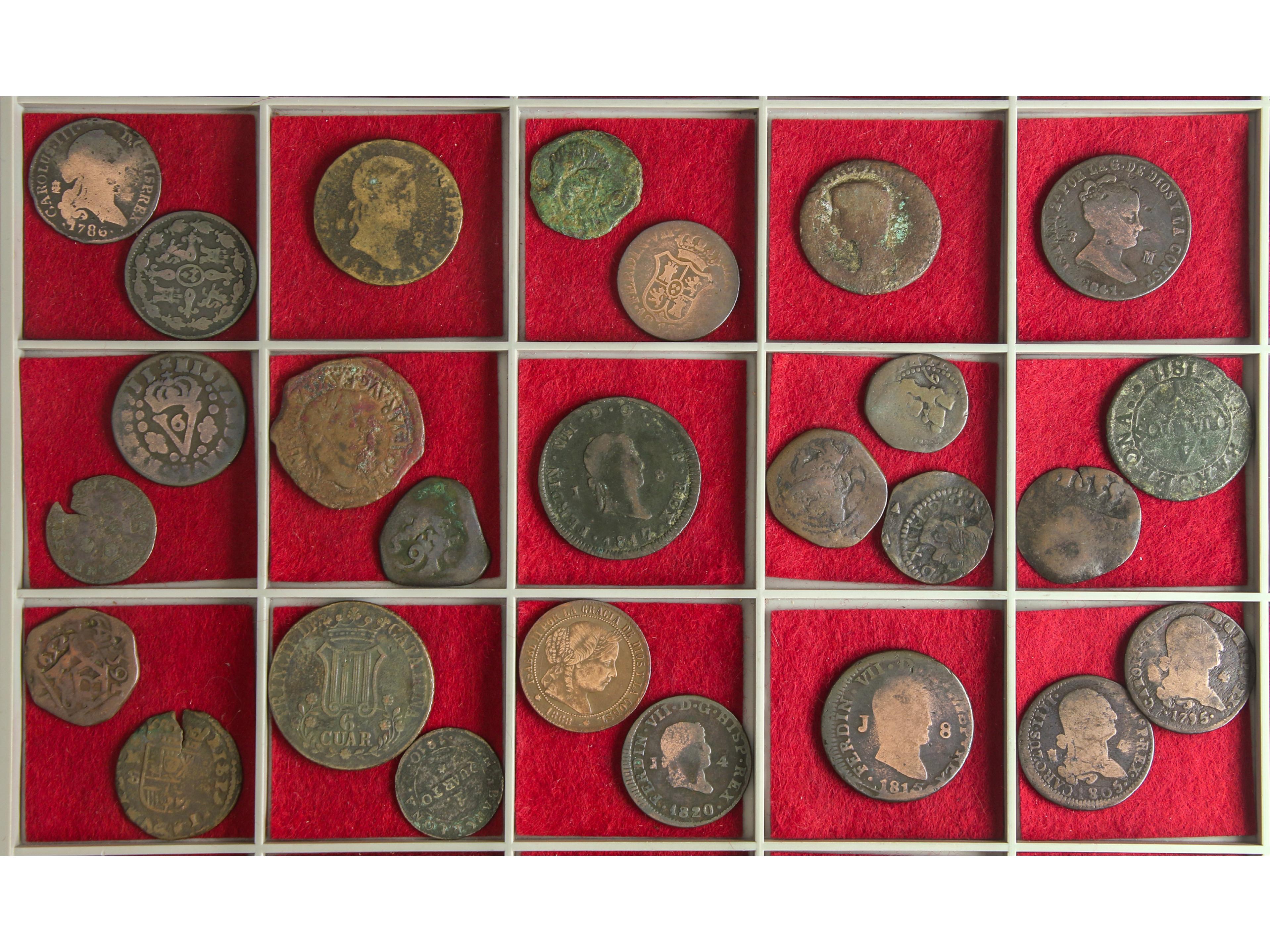 Lote 19 monedas Cobres. REYES CATÓLICOS a ISABEL II. Moneda variada de diferentes tipos, algunas con resellos, calidad media buena. A EXAMINAR. MBC- a EBC-. (Image1)