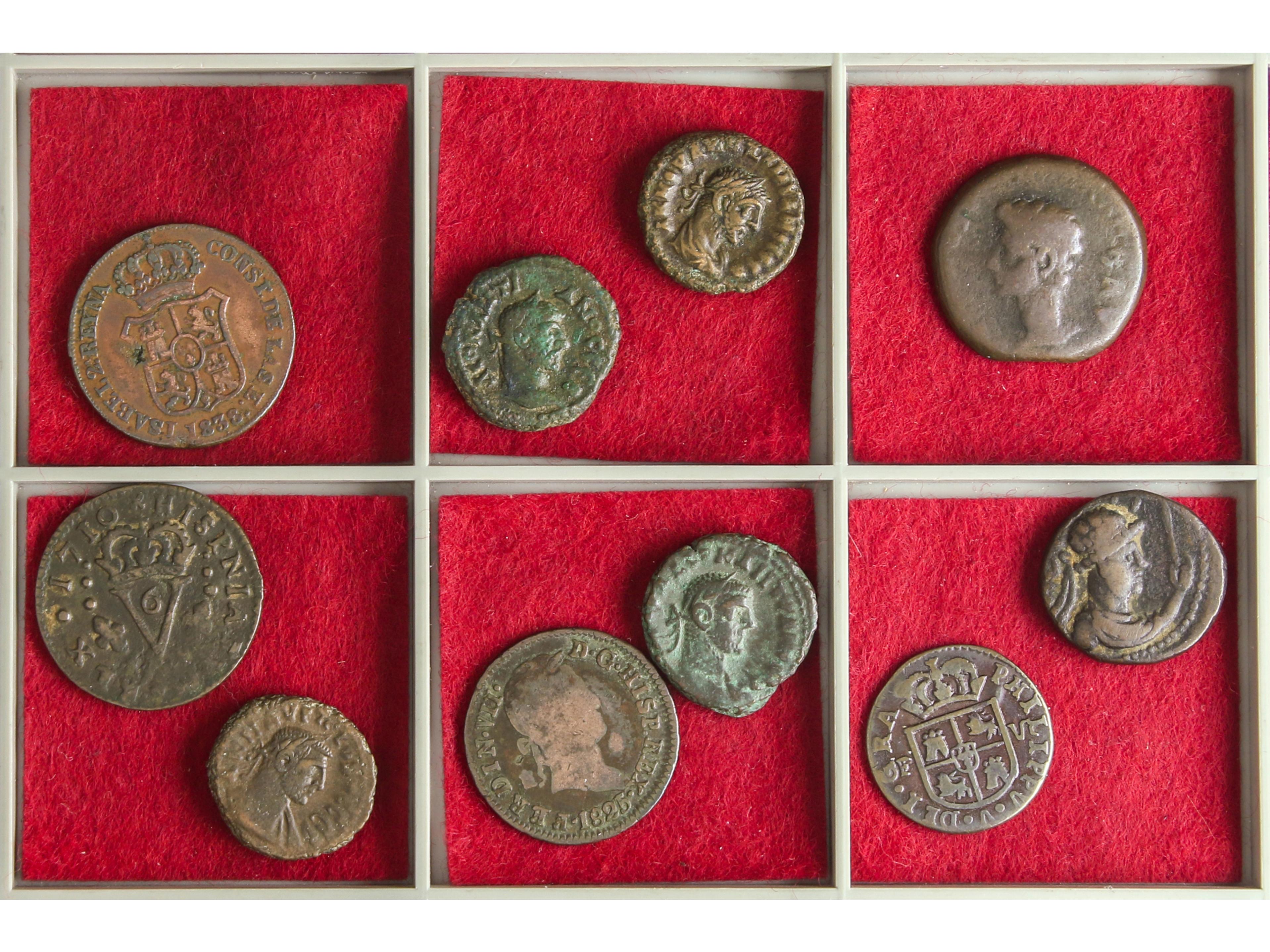 Lote 26 monedas Cobres. ÉPOCA ROMANA a ISABEL II. Incluye moneda variada de varias épocas. IMPRESCINDIBLE EXAMINAR. BC- a MBC-.