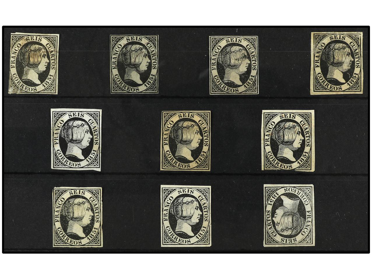 ESPAÑA. 6 cuartos negro. 5 ejemplares nuevos, 4 usados y 1 falso. Calidades diversas. A EXAMINAR. Ed.6. Cat. 1.262€. (Image1)