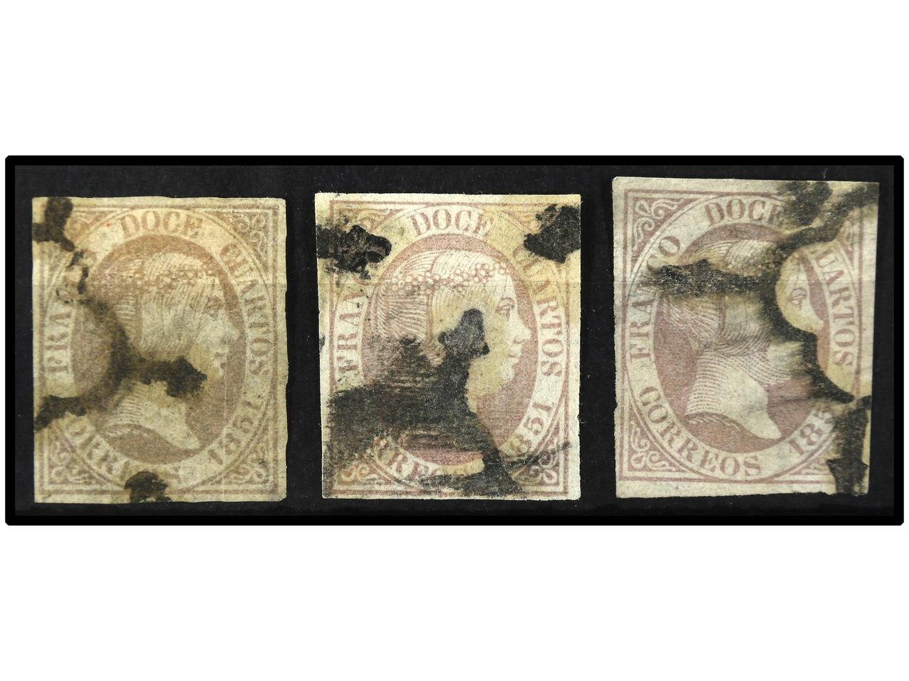 ESPAÑA. 12 cuartos lila. 3 ejemplares en calidad diversa. A EXAMINAR. Ed.7 (3). Cat. 510€. (Image1)
