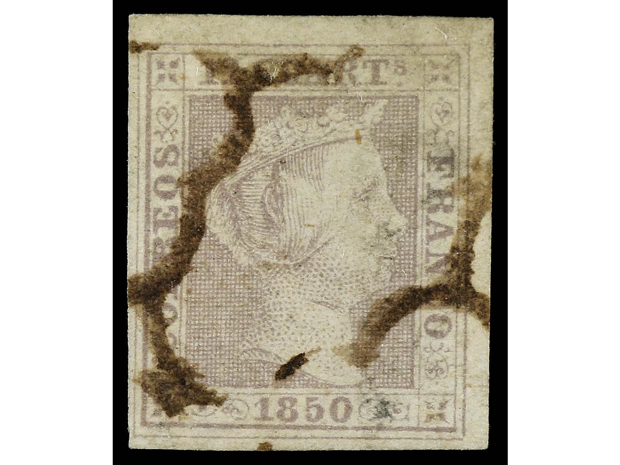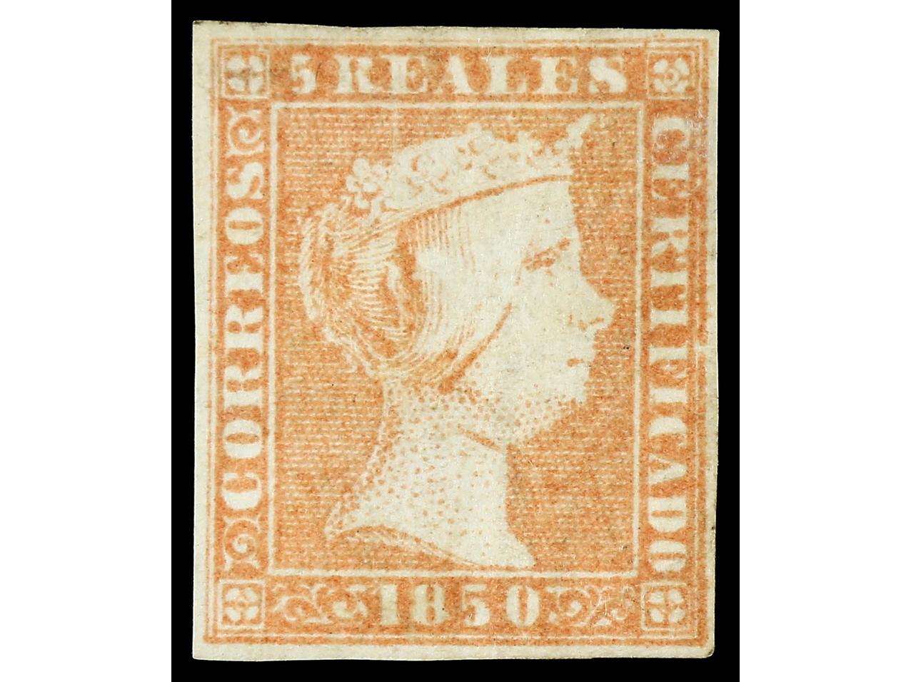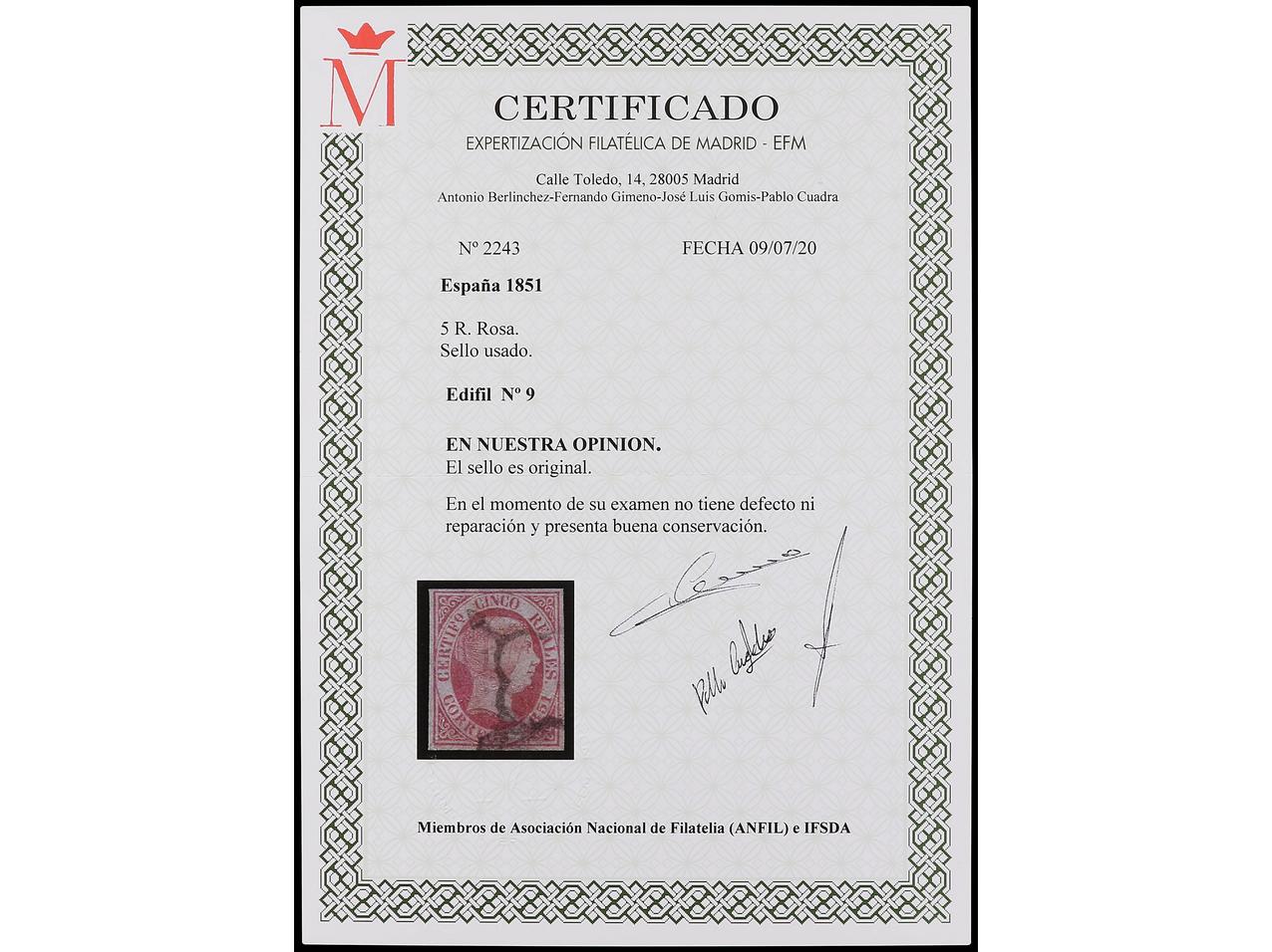 ESPAÑA. 5 reales rosa. Precioso color y grandes márgenes. Cert. CEM. MUY RARO. Ed.9. Cat. 375€. (Image1) (Image2)