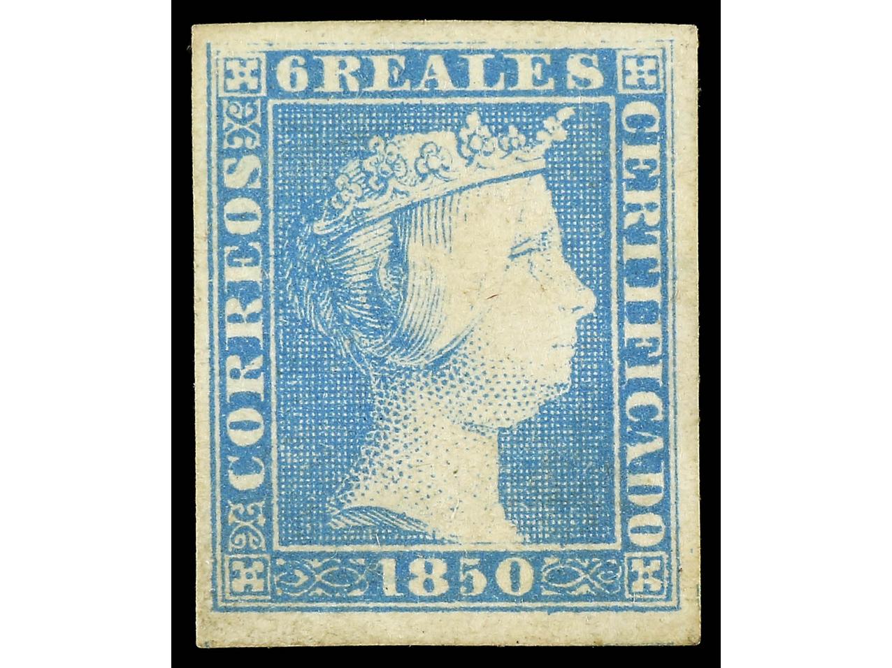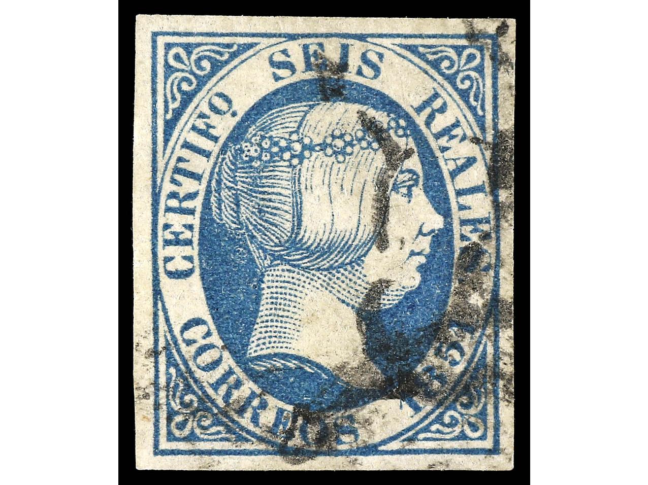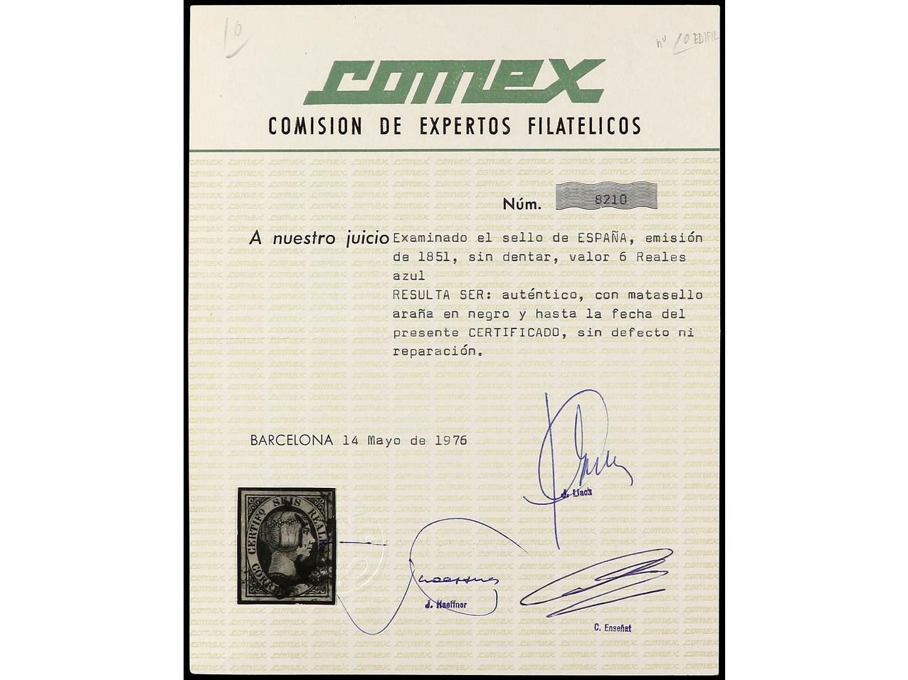 ESPAÑA. 6 reales azul, amplios márgenes. Buen ejemplar. Cert. COMEX (1976). Ed.10. (Image1) (Image2)