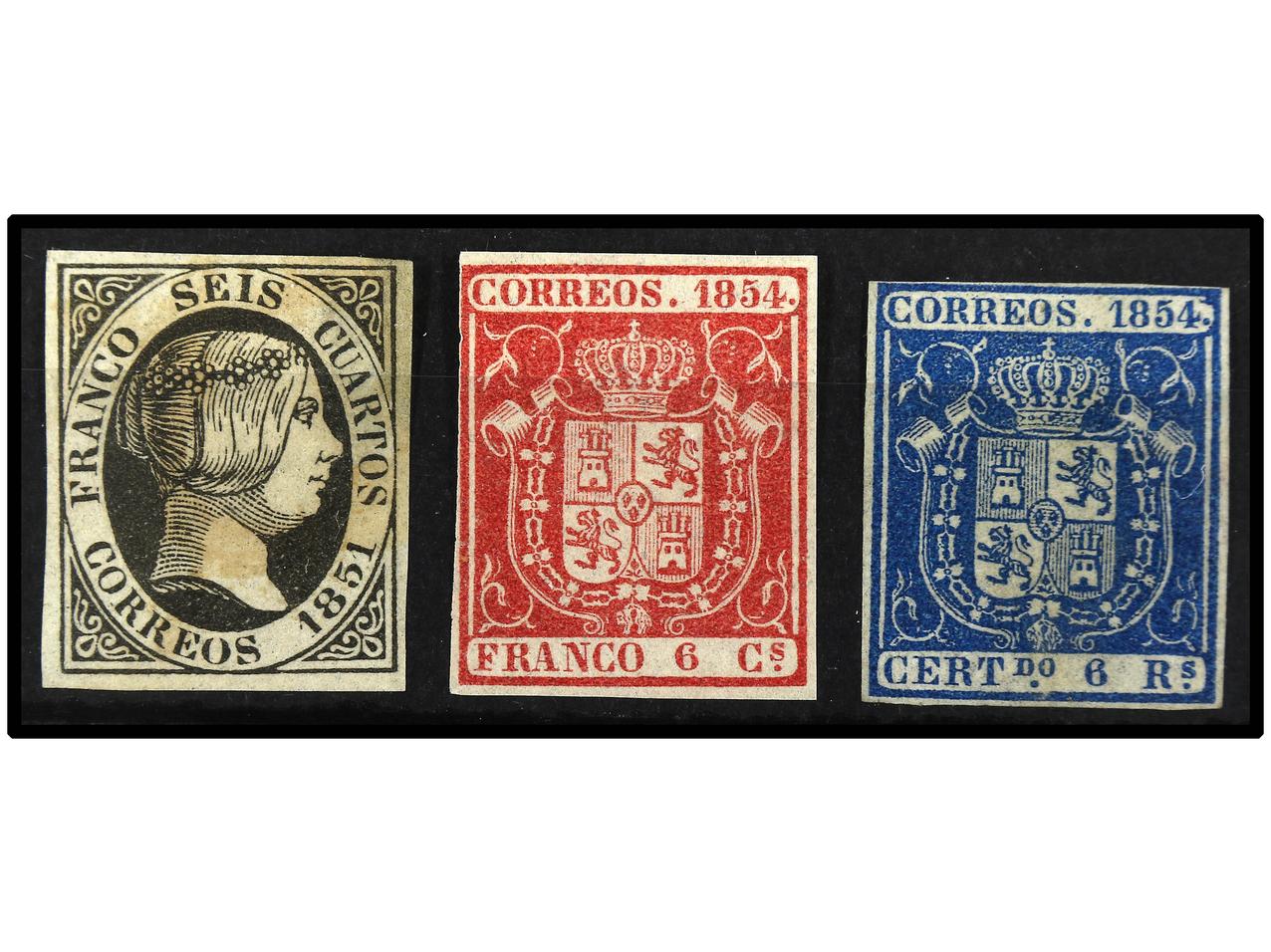 ESPAÑA. 6 cuartos negro, 6 cartos rojo y 6 reales azul. Lavados. Ed.6, 24, 27. (Image1)